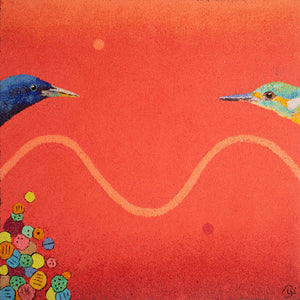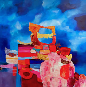 48"x48" abstract piece using crushed volcanic rock and acrylic paint featuring designs over a blue background with orange and yellow details.