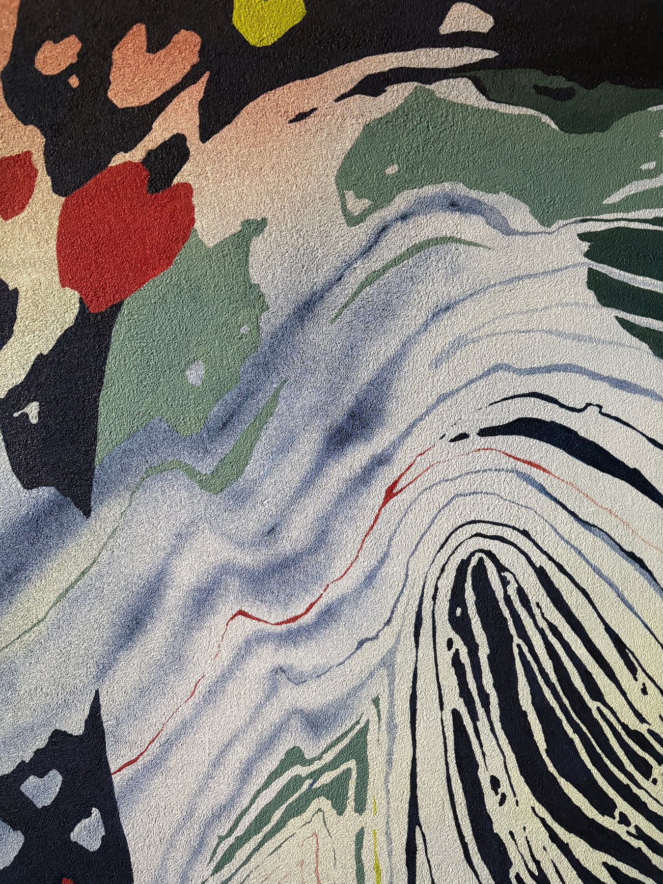 Erin Touey’s work straddles the line between abstraction and representation in her new series of pumice-primed canvas oil paintings. Touey utilizes fluid shapes, variation of line weight, non representational color, distortion of perspective, and in this series, the texture of the pumice primed canvas to bring her often tangible subject matter into the abstract realm. With a limited palette consisting only of Phthalo Blue, Cadmium Yellow, and Quinacridone Magenta, Touey challenges herself to mix all of her colors. The white of the canvas is preserved deliberately, the negative space making shapes that sometimes jump forward or fall back.