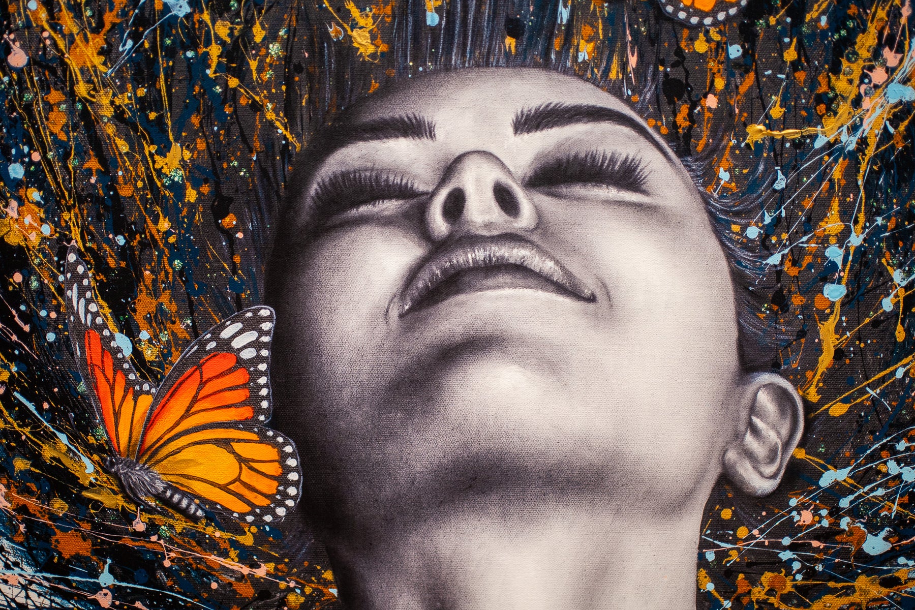 Working with charcoal dust powder, acrylic, and oil, Ashvin Harrison’s contemporary artistic style is so musical that his figures almost literally dance off the canvas. Harrison has come to be known worldwide for his integration of contrasting mediums. The painter begins with the soft, sultry subtlety of brushed charcoal to create sensual, hyper-realistic figures with digital-like precision in black and white -- dancers, hummingbirds, planets, trees, and musical instruments to name the most iconic. From there, Ashvin splatters and paints this initial charcoal with many layers of color, creating a mystical chorus of beauty, sensation, and light.