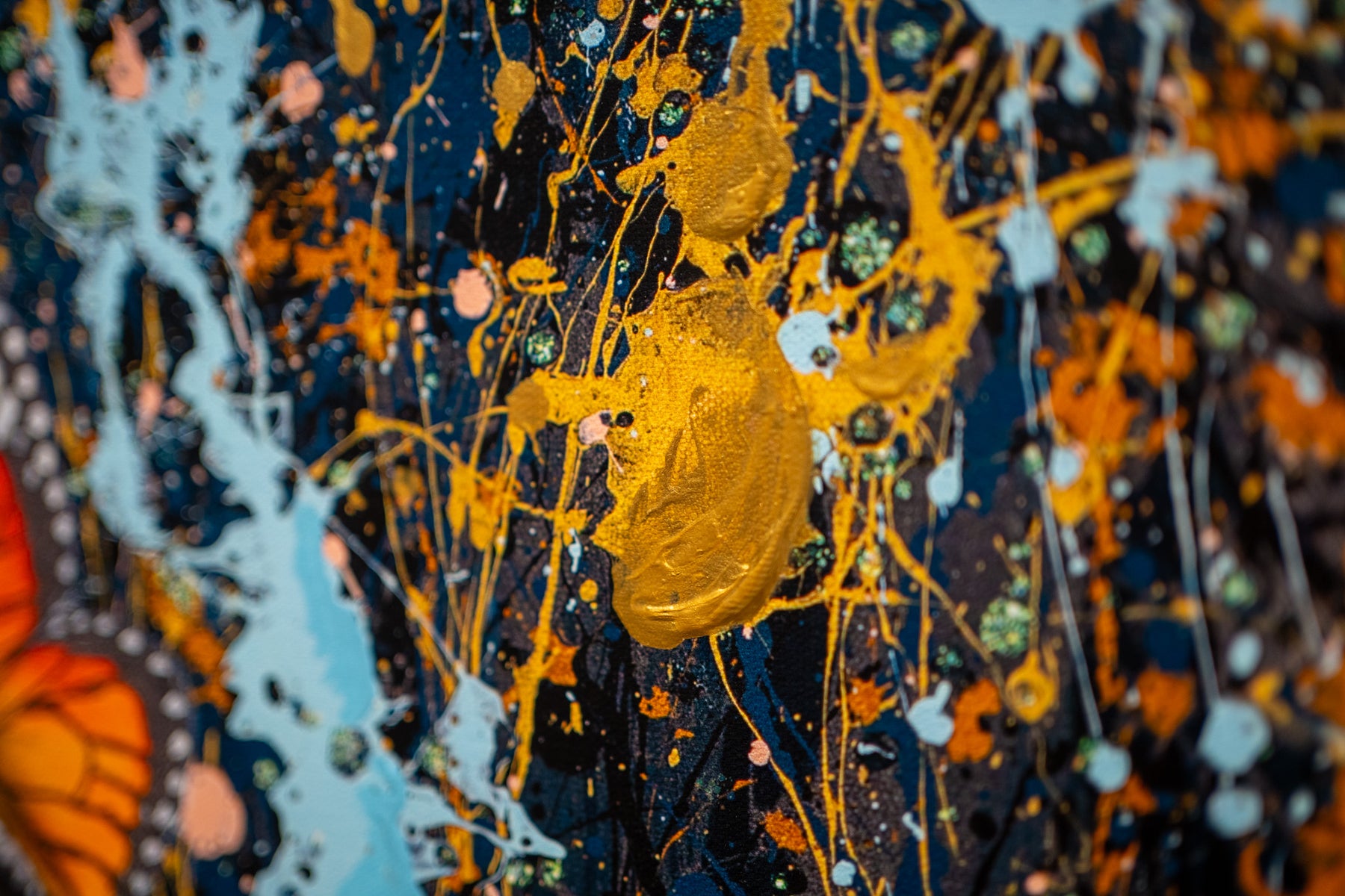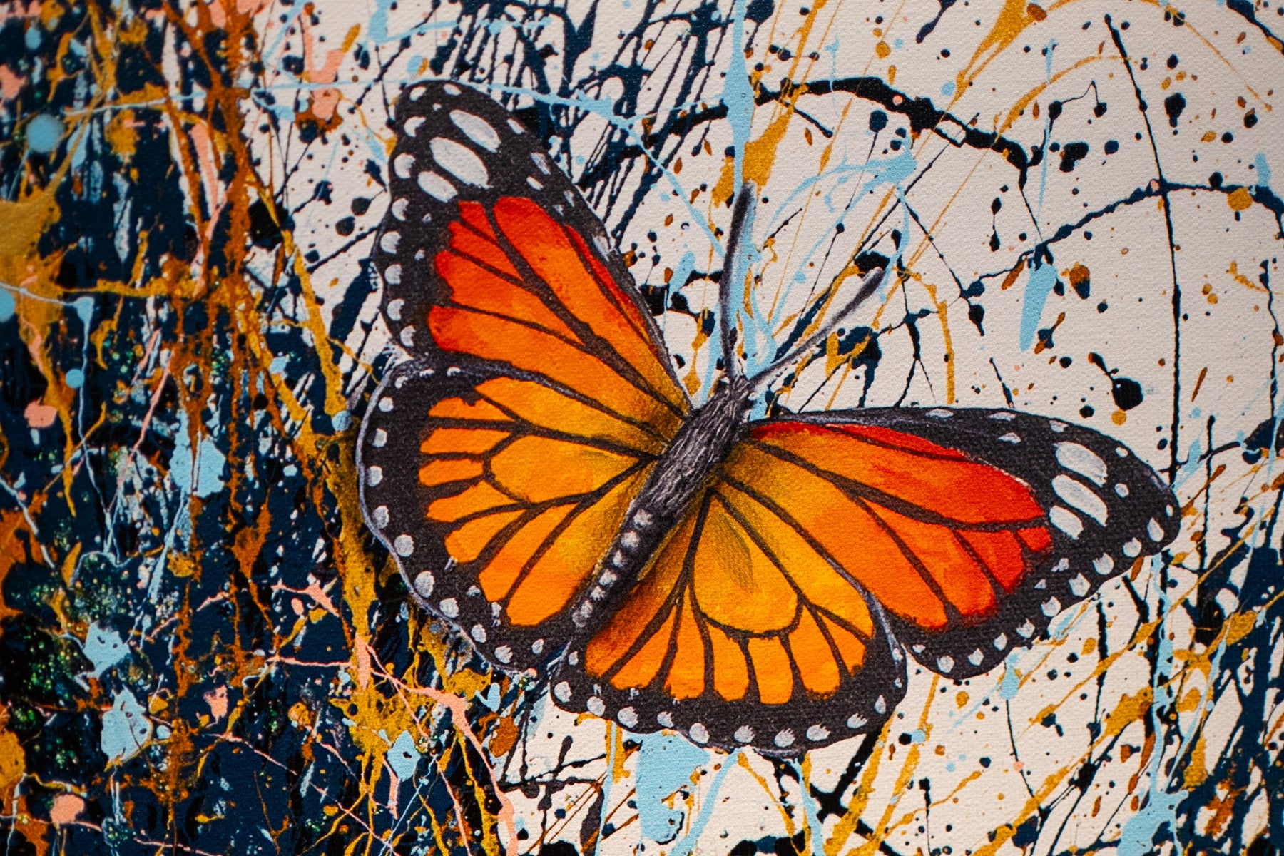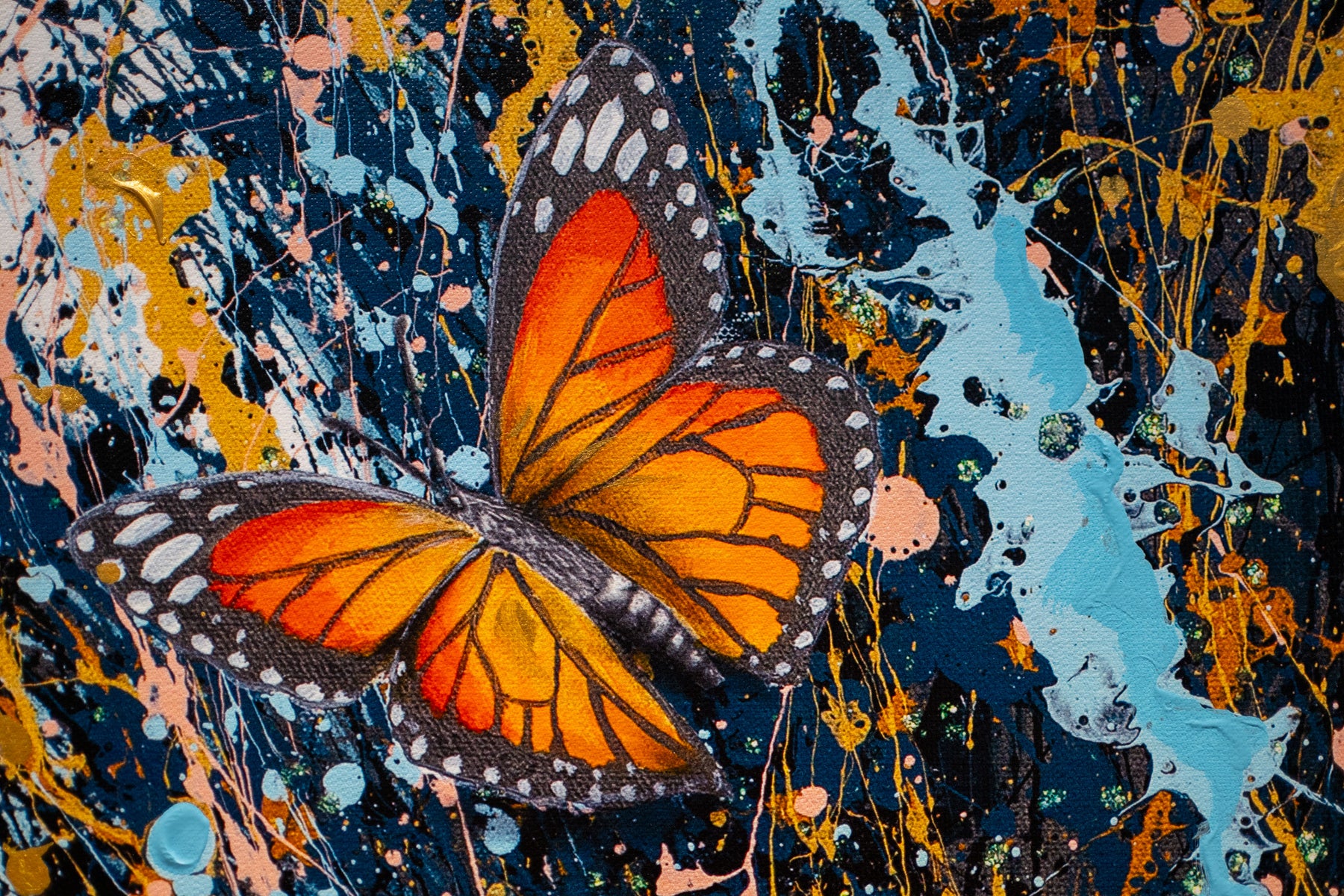 black and white woman flipping hair back with gold blue and black splatter paint, orange monarch butterflies in hair on white background