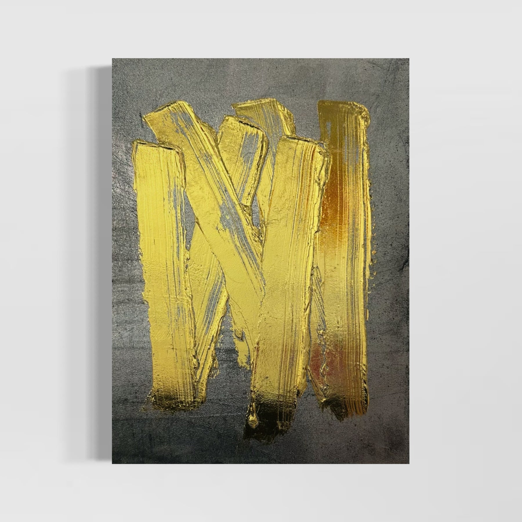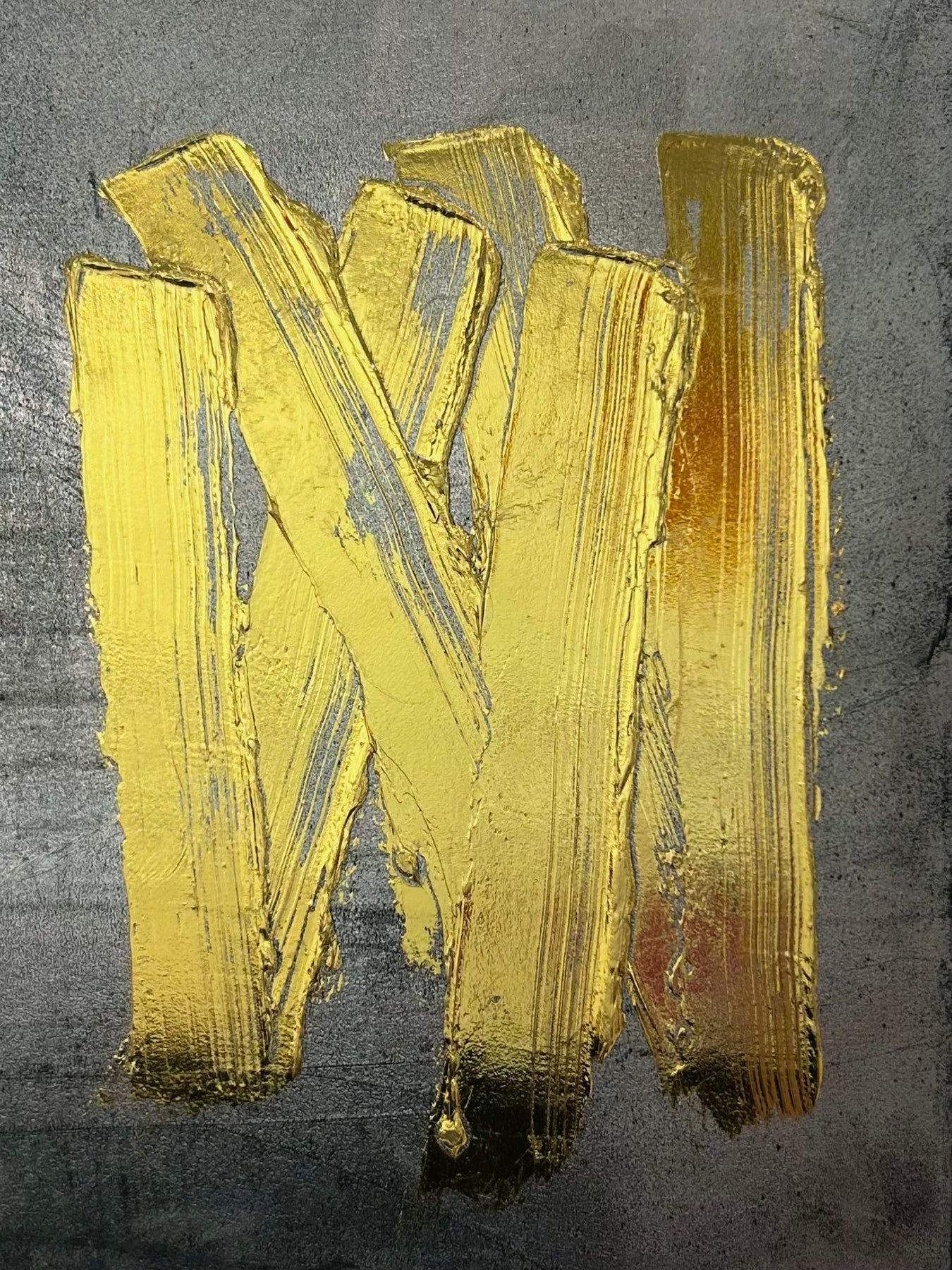 NYC based artist, M. Clark, creates light-reflecting works wherein the artist manipulates heat and pressure to fix metallic foil onto various surfaces -- there is no paint on her artworks, only gold, copper, or silver foil. Clark often uses a palette knife to help texturize her highly reflective, modern and minimalist works of art.