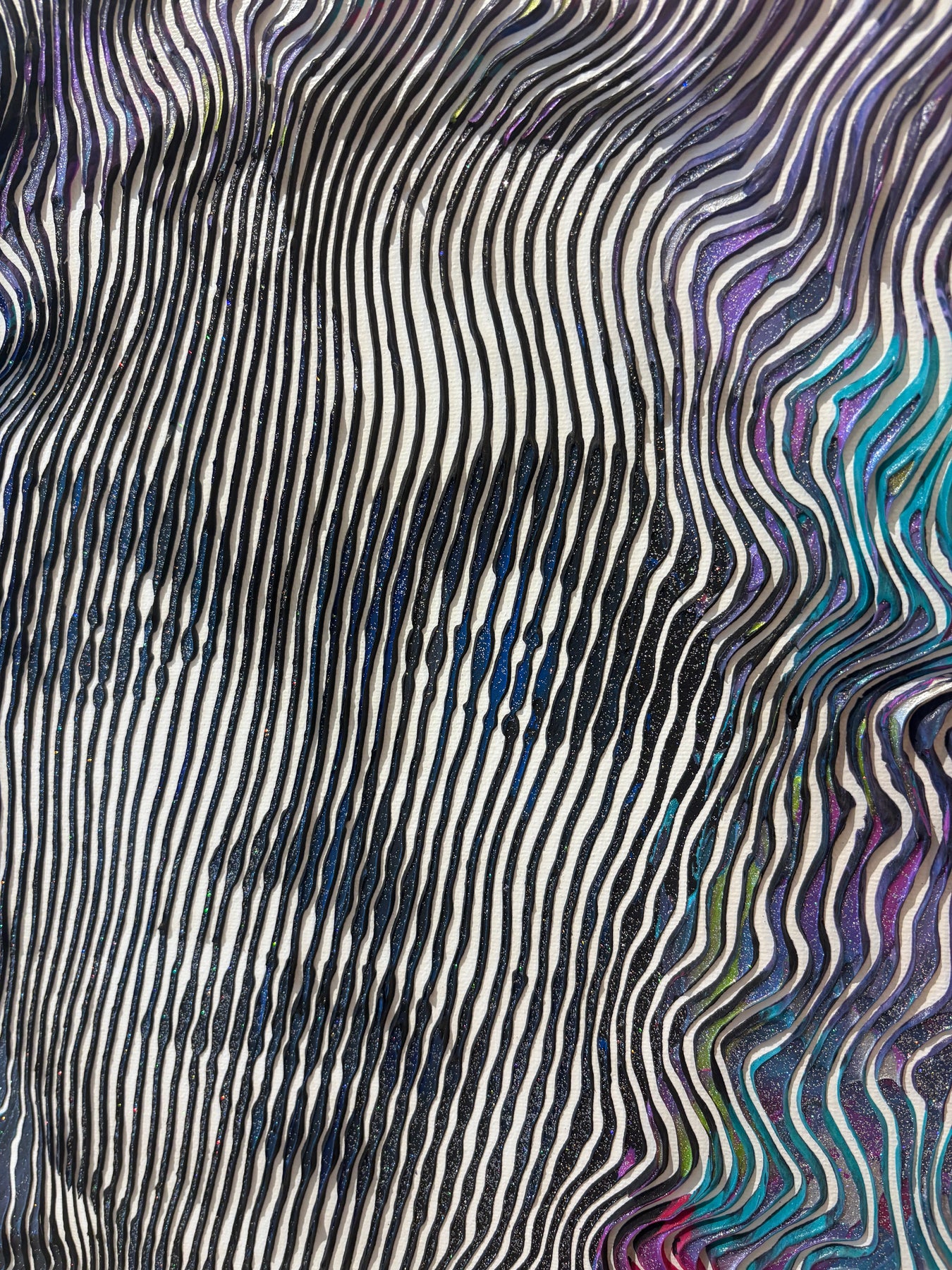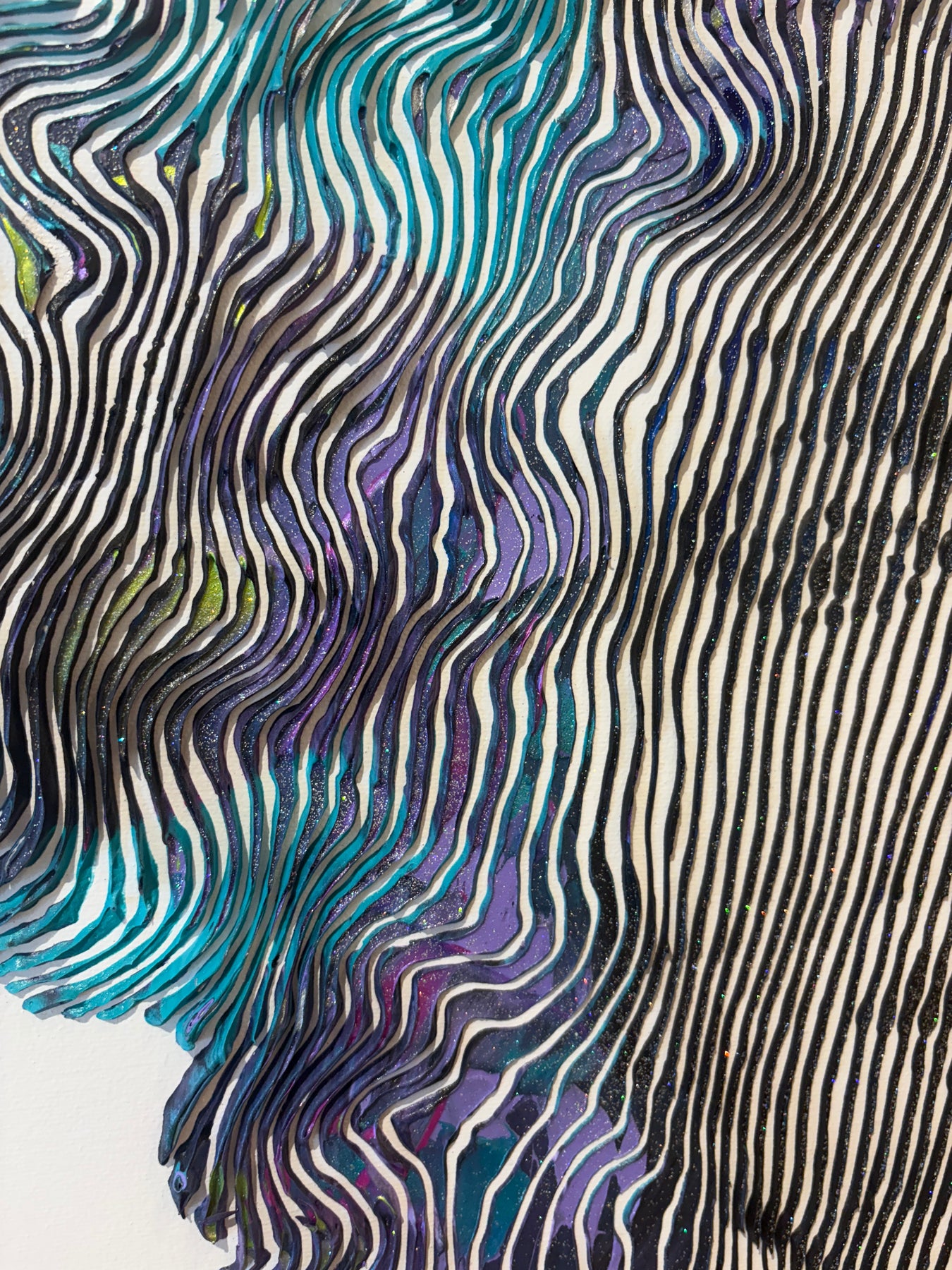 - Acrylic and oil on canvas applied line by line with a knife, brush, and syringe to create 3-dimensional works.