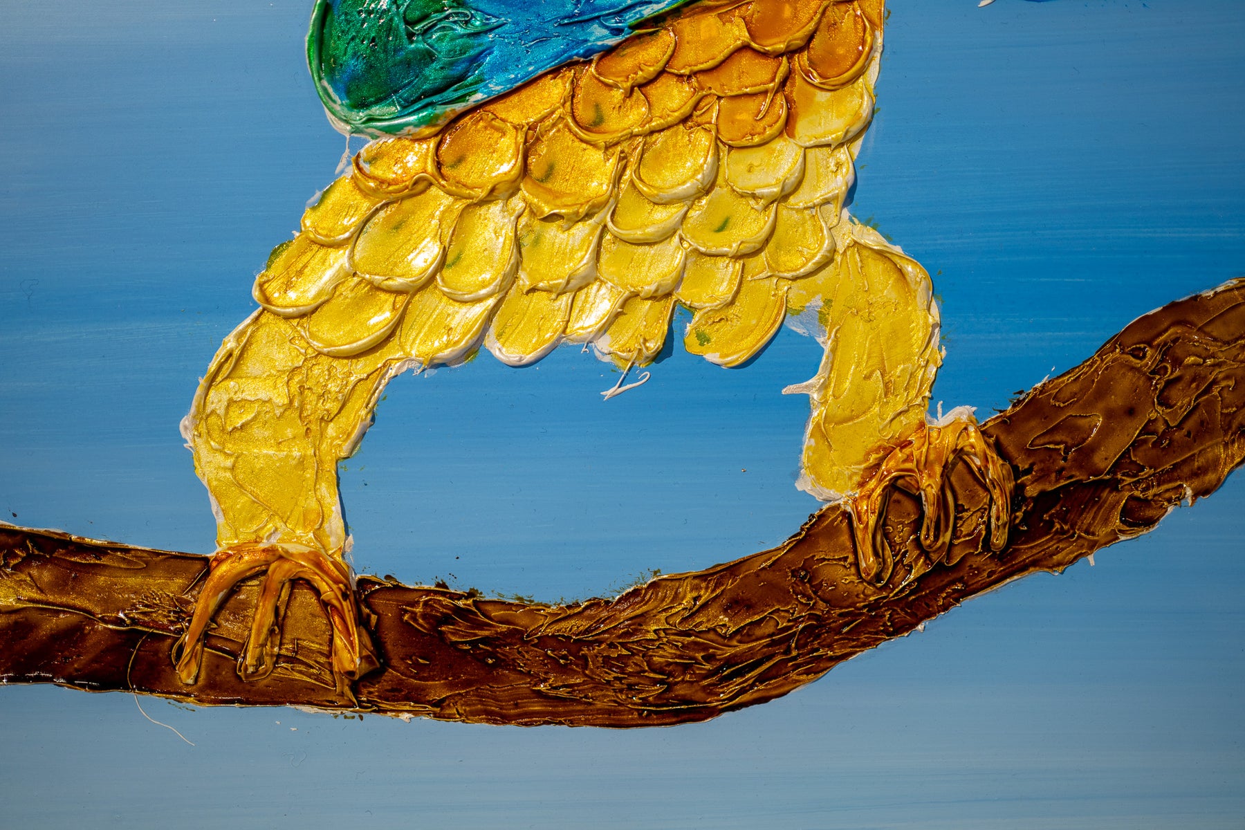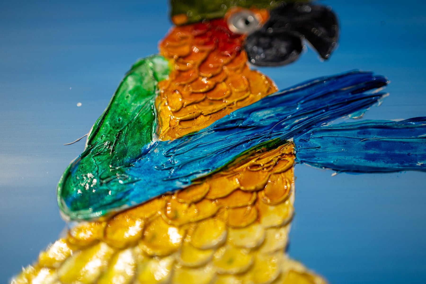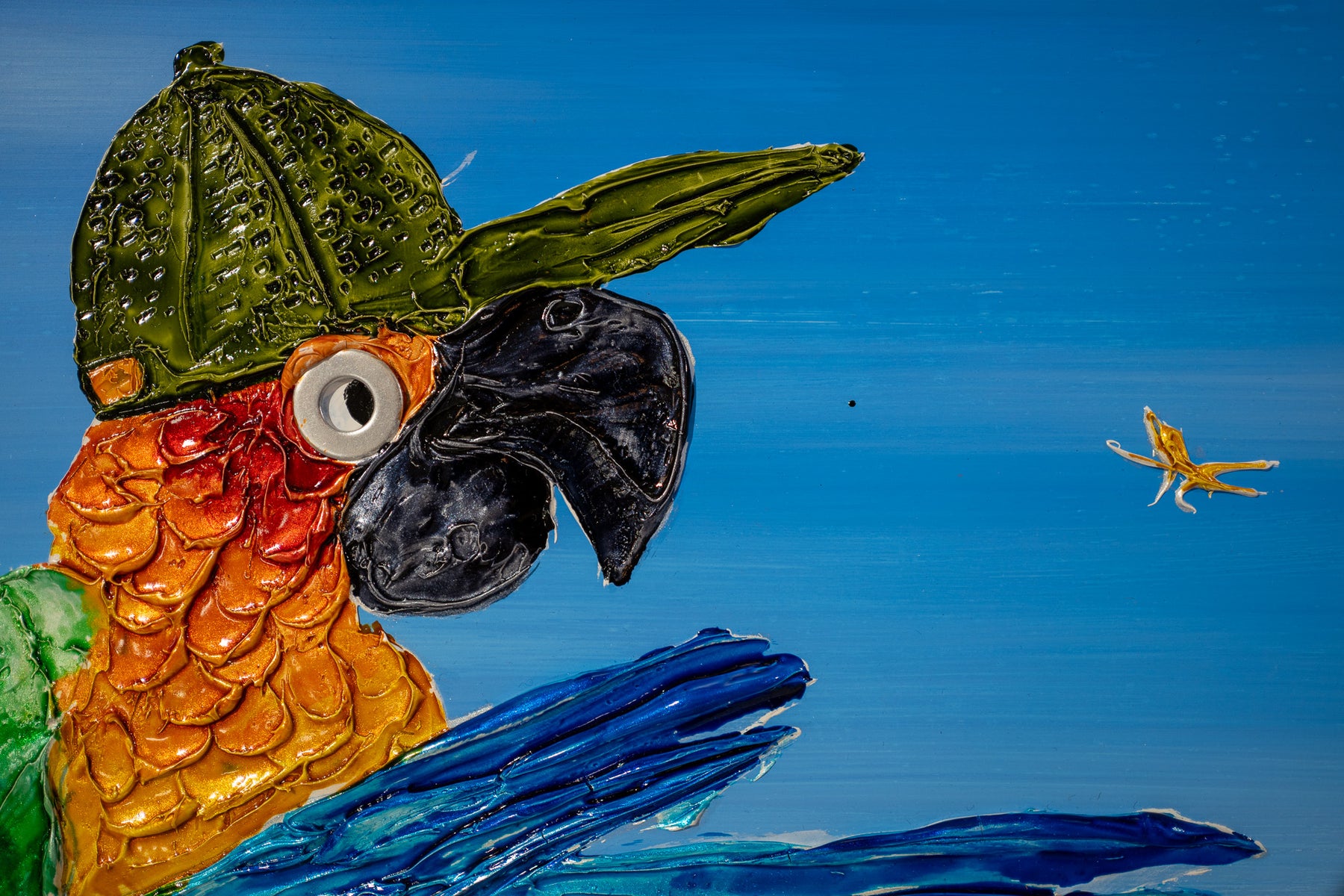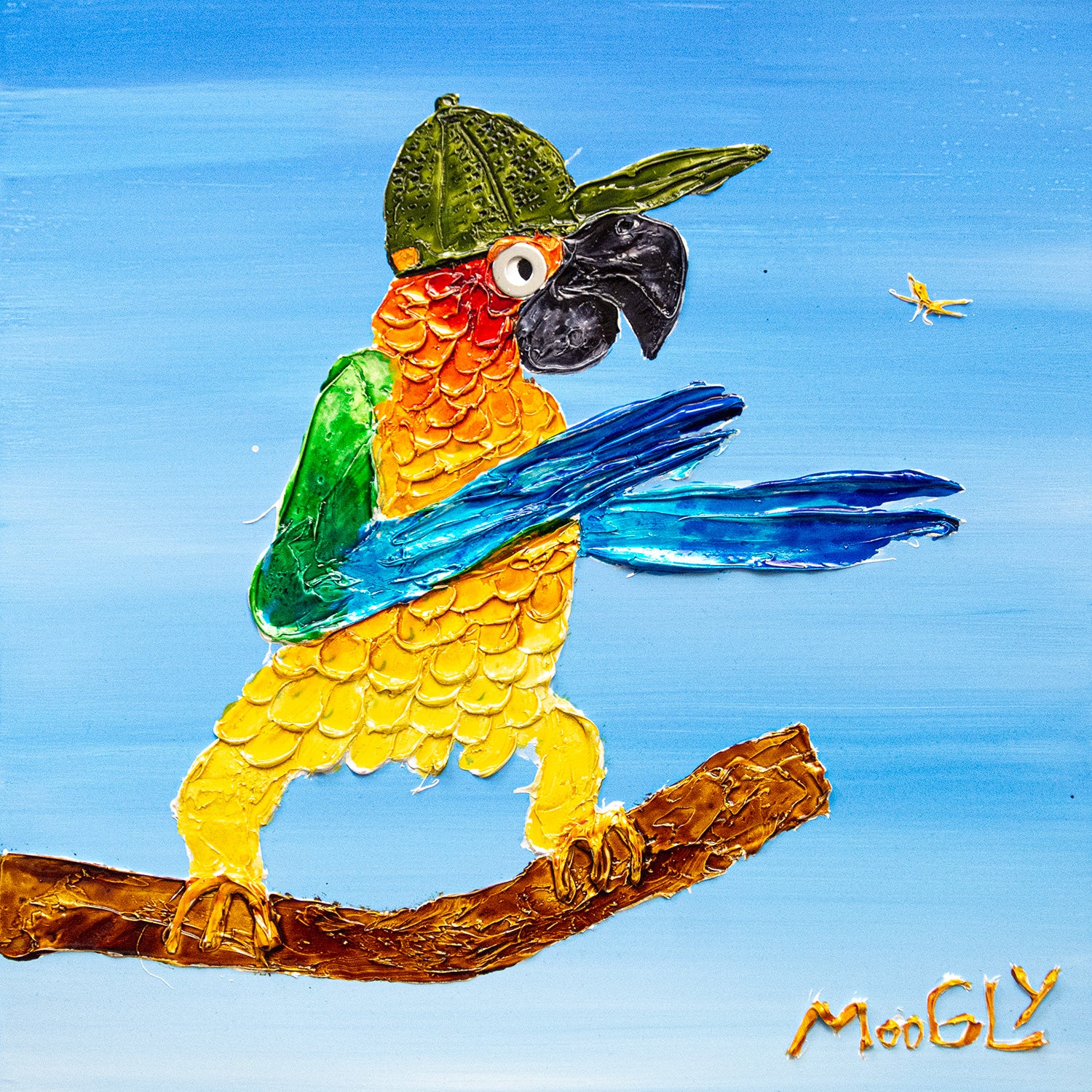 Acrylic 17" x 17" Sorry Mosquito artwork by Moogly. Blue background with an animated parrot wearing a baseball cap, swatting at a mosquito. Colorful and vibrant artwork.