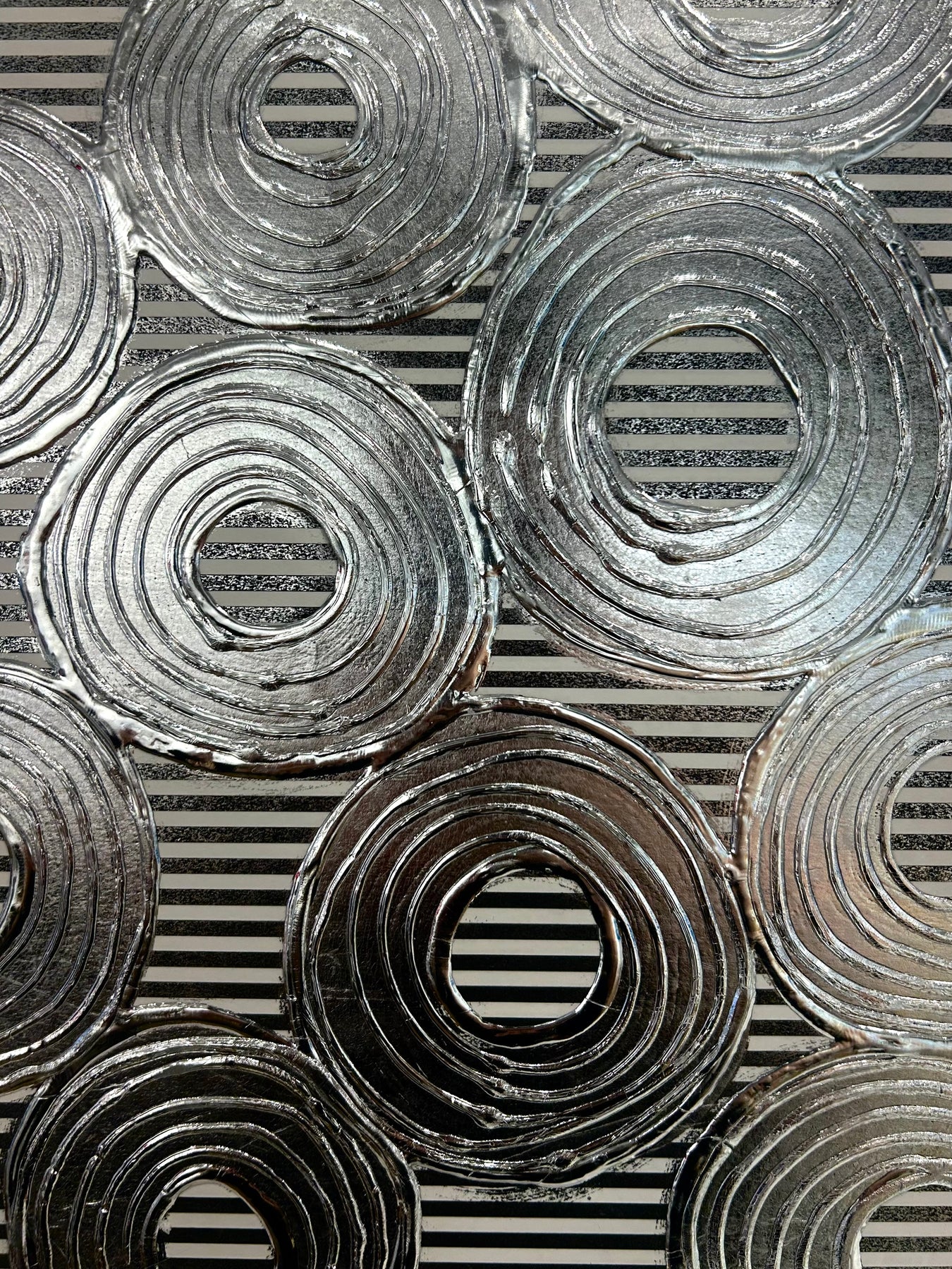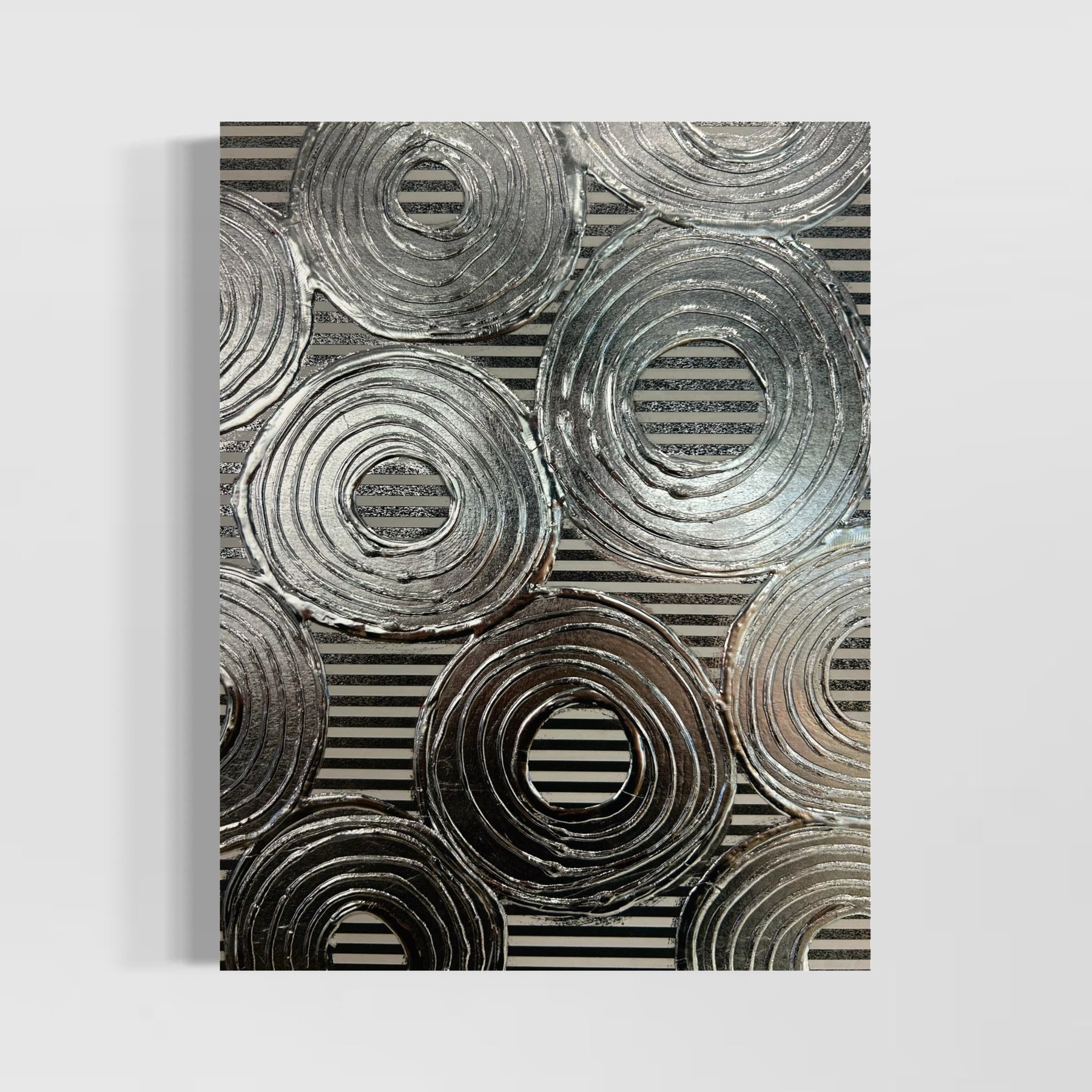 NYC based artist, M. Clark, creates light-reflecting works wherein the artist manipulates heat and pressure to fix metallic foil onto various surfaces -- there is no paint on her artworks, only gold, copper, or silver foil. Clark often uses a palette knife to help texturize her highly reflective, modern and minimalist works of art.