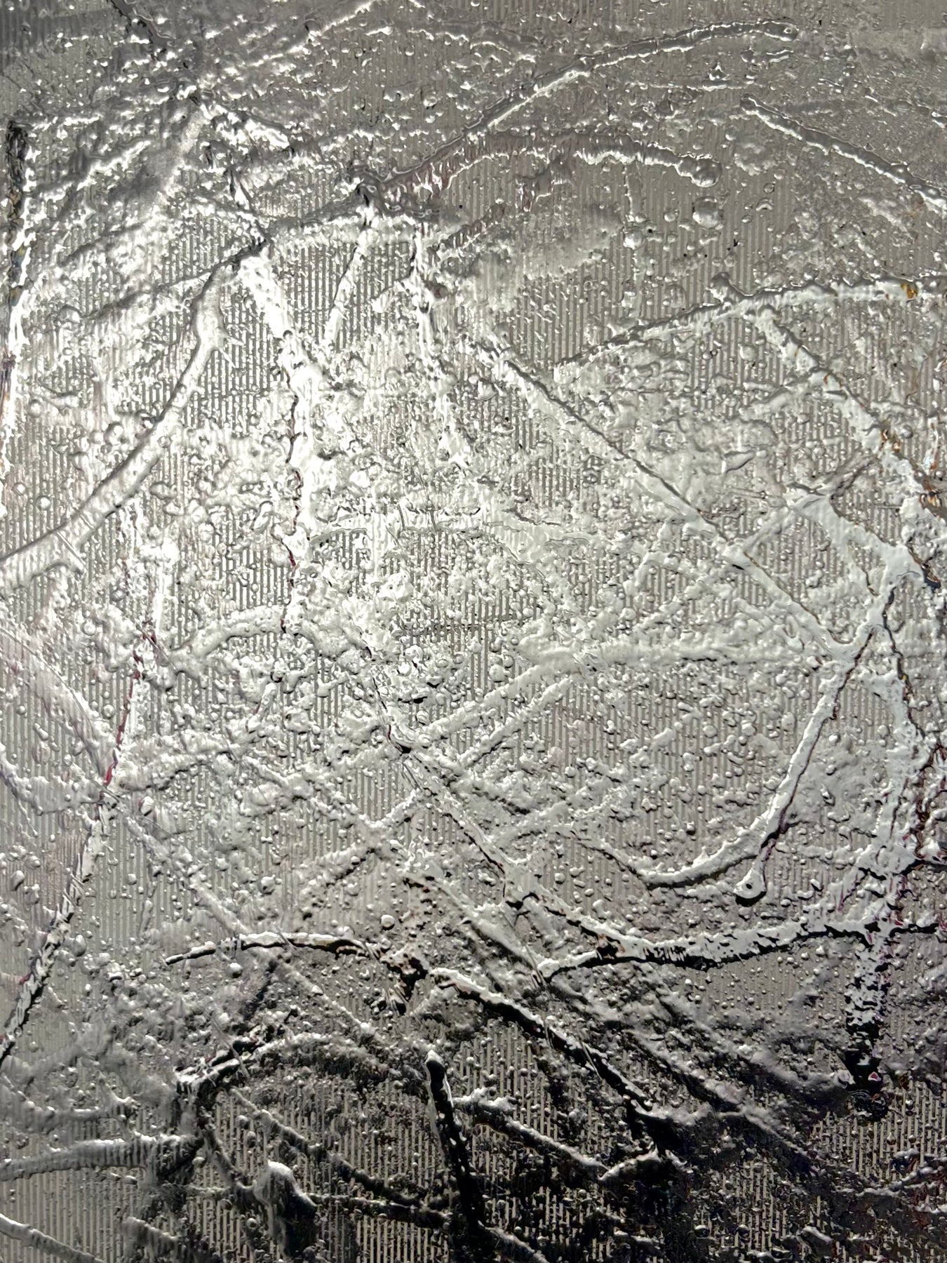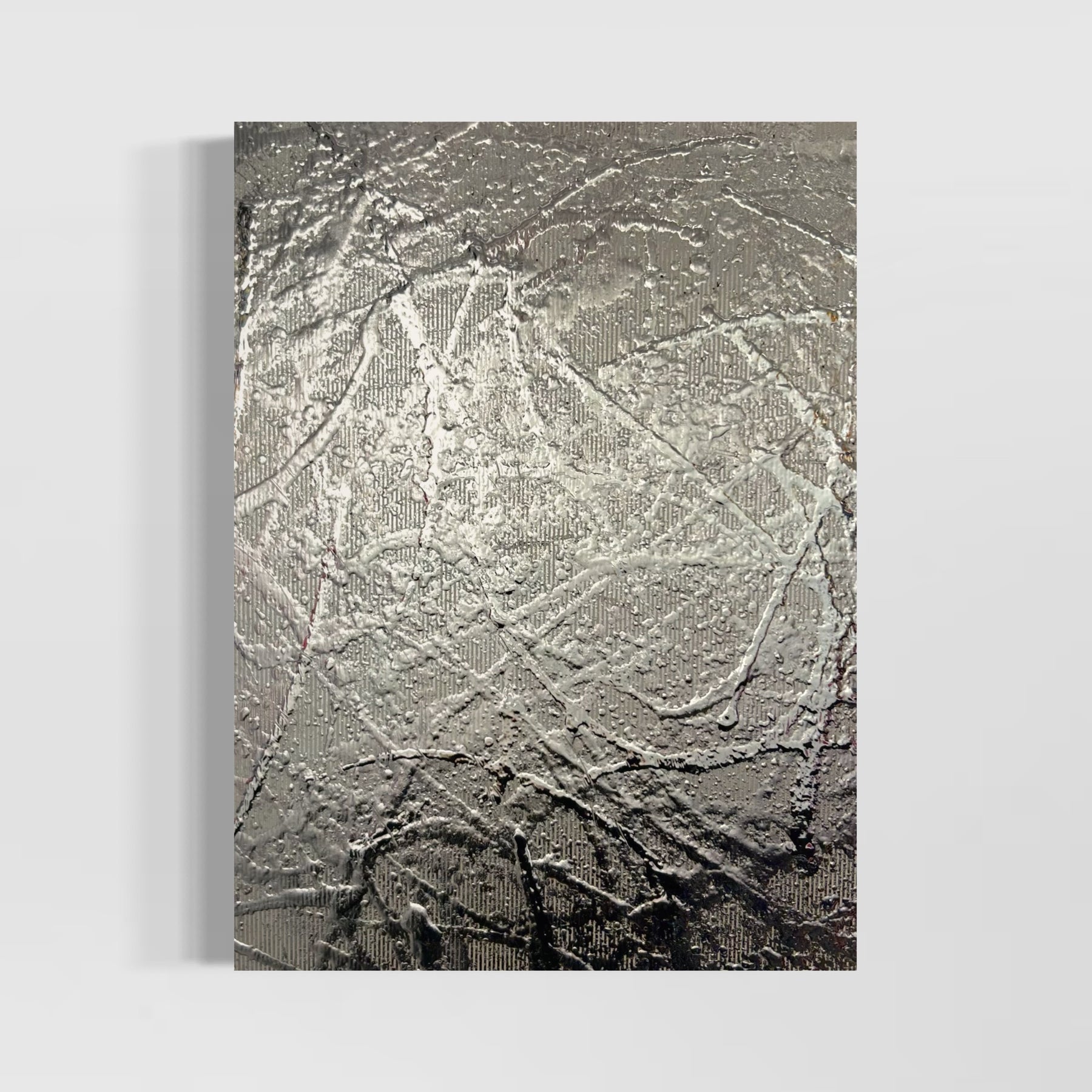 NYC based artist, M. Clark, creates light-reflecting works wherein the artist manipulates heat and pressure to fix metallic foil onto various surfaces -- there is no paint on her artworks, only gold, copper, or silver foil. Clark often uses a palette knife to help texturize her highly reflective, modern and minimalist works of art.