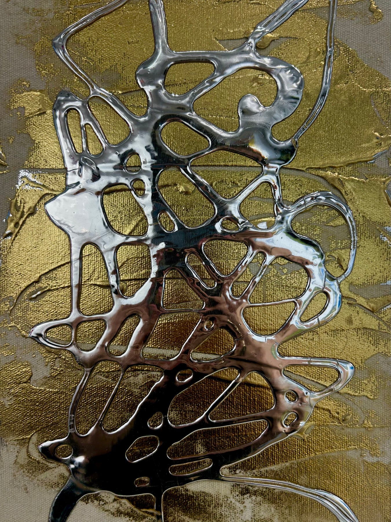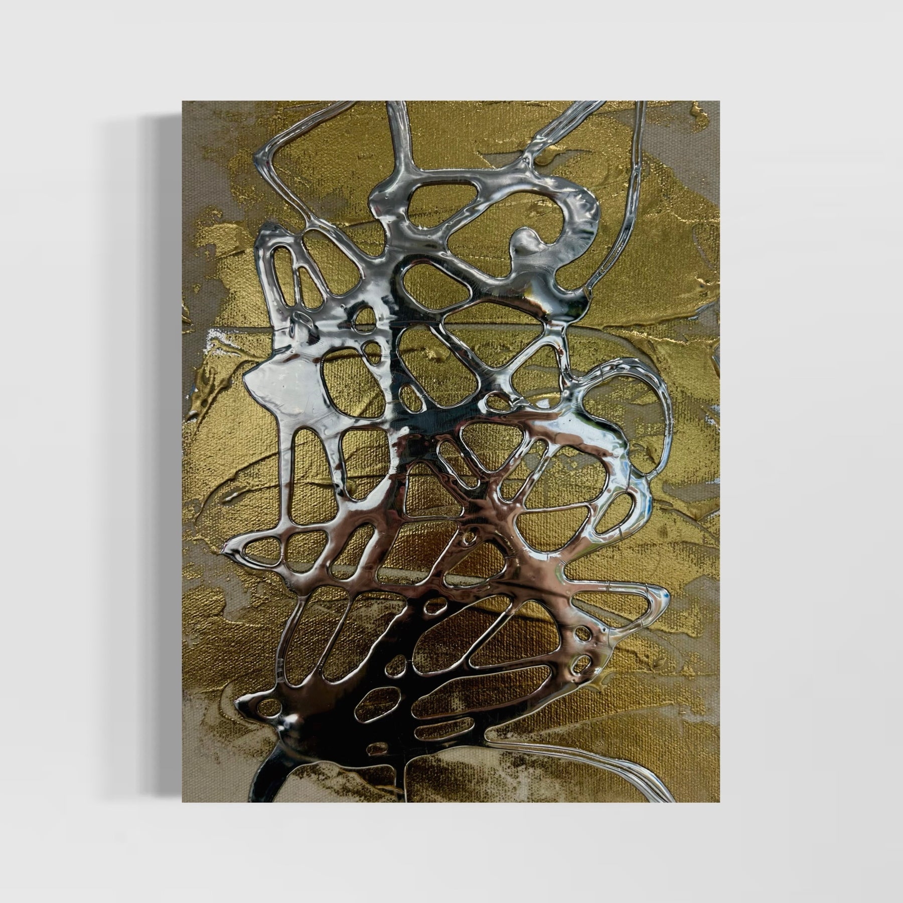 NYC based artist, M. Clark, creates light-reflecting works wherein the artist manipulates heat and pressure to fix metallic foil onto various surfaces -- there is no paint on her artworks, only gold, copper, or silver foil. Clark often uses a palette knife to help texturize her highly reflective, modern and minimalist works of art.