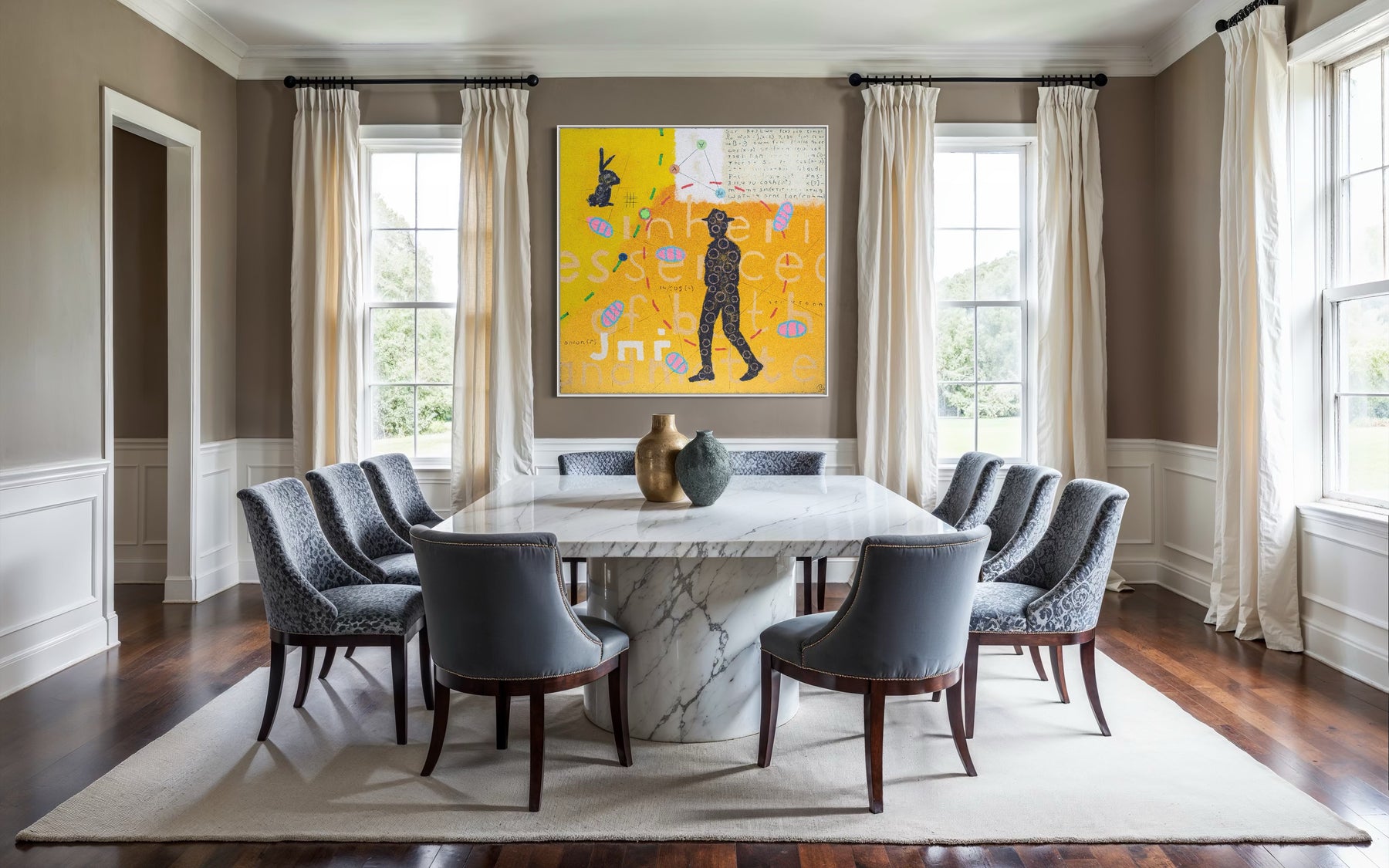 60"x60" abstract piece using crushed volcanic rock and acrylic paint featuring abstract forms over a yellow and orange background.