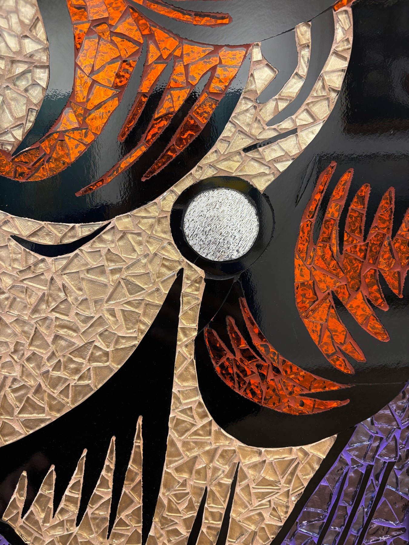 Mosaic made with hand cut stained glass, glitter glass, metallic glass, foil glass and mirrored glass, weldbond glue, and hand-dyed grout on Wedi Board.