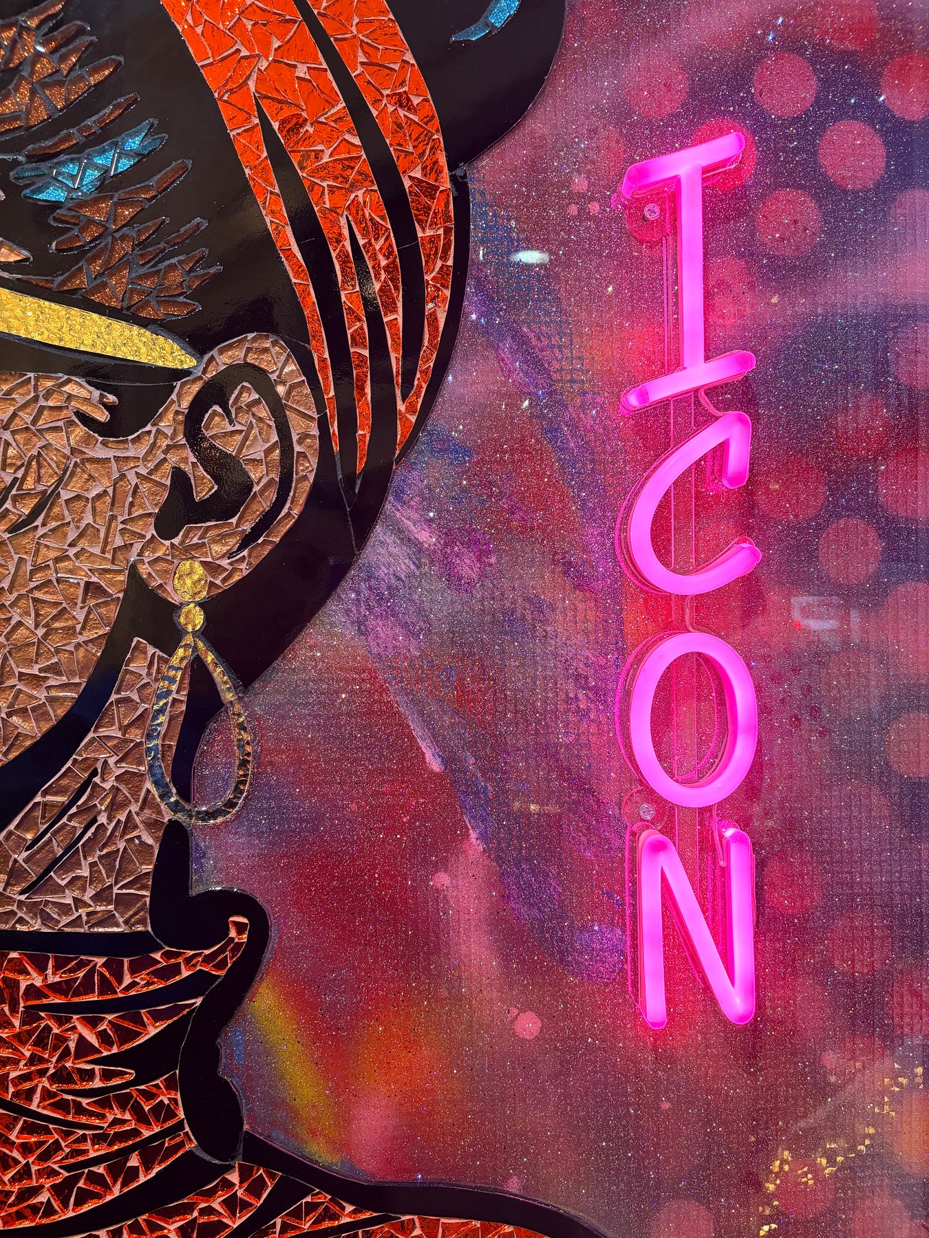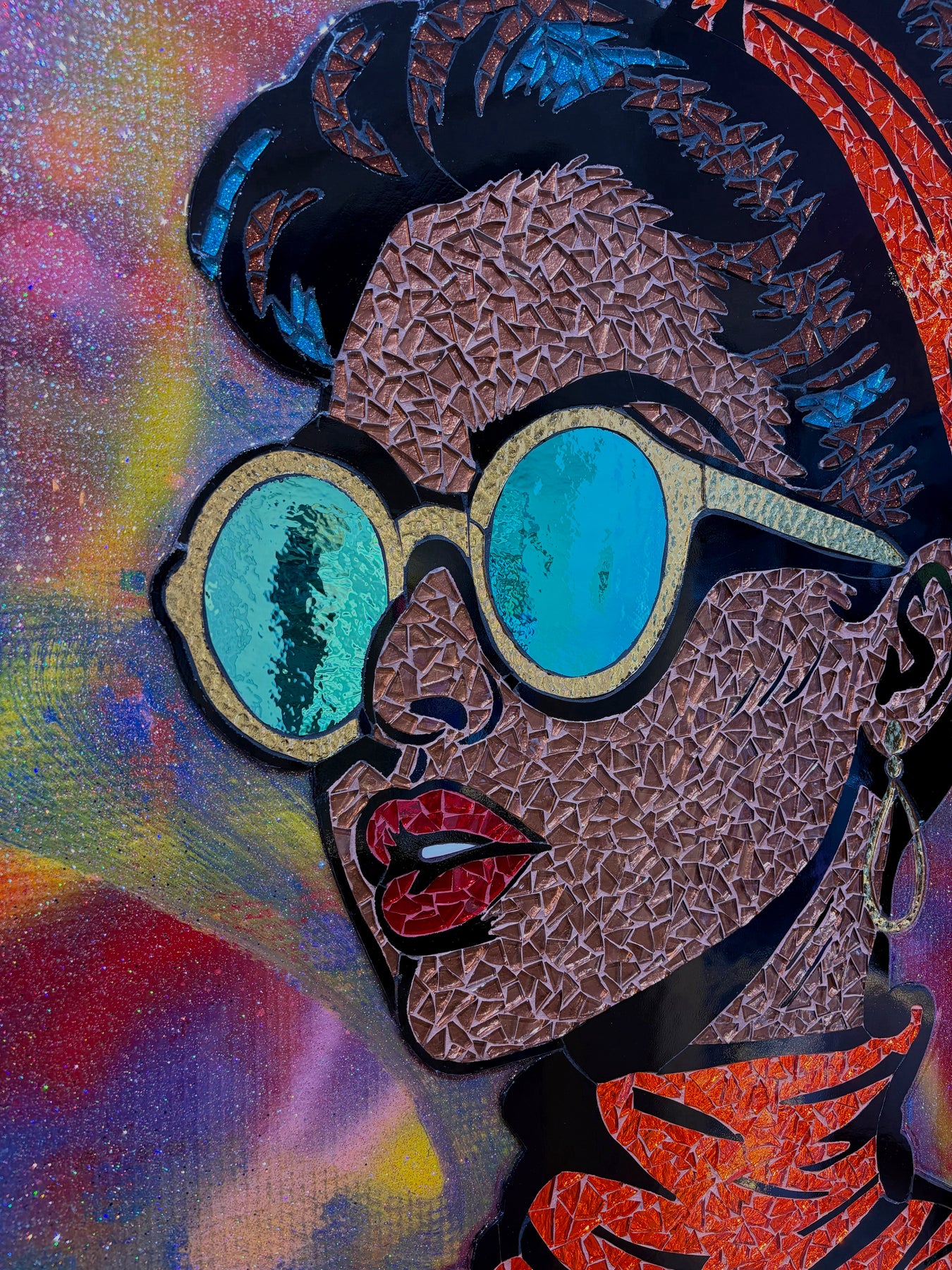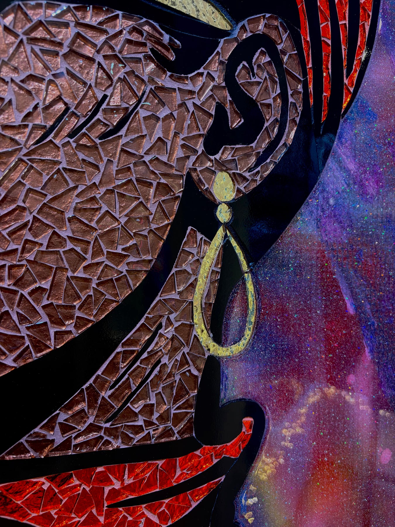 Mosaic made with hand cut stained glass, glitter glass, metallic glass, foil glass and mirrored glass, weldbond glue, hand-dyed grout, acrylic, resin, glitter and neonon Wedi Board.