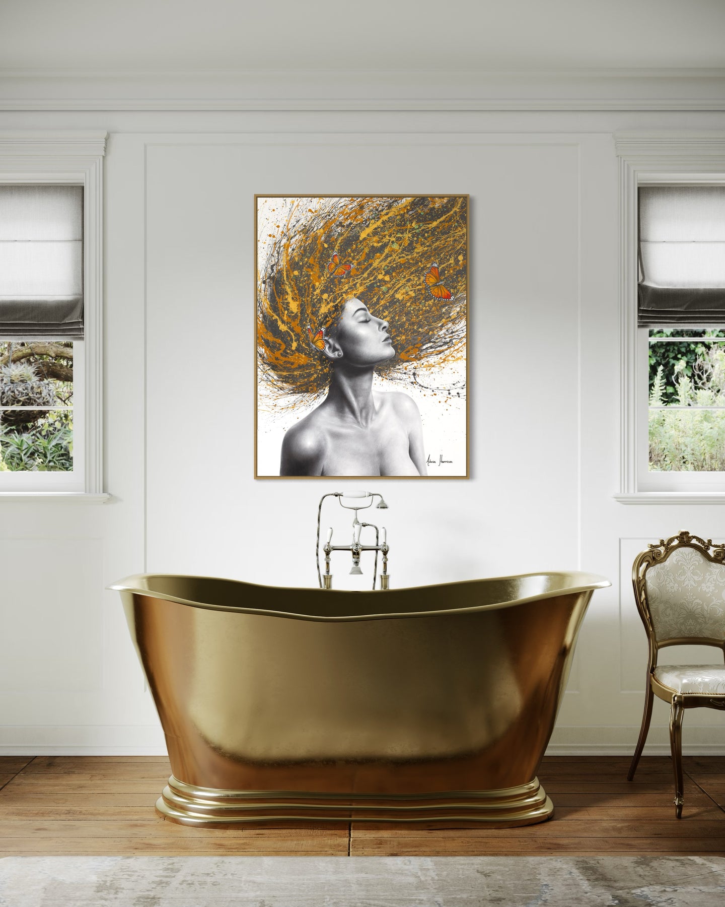 profile woman in black and white flipping hair over head in black yellow orange and gold splatter paint with orange monarch butterflies in hair on white background