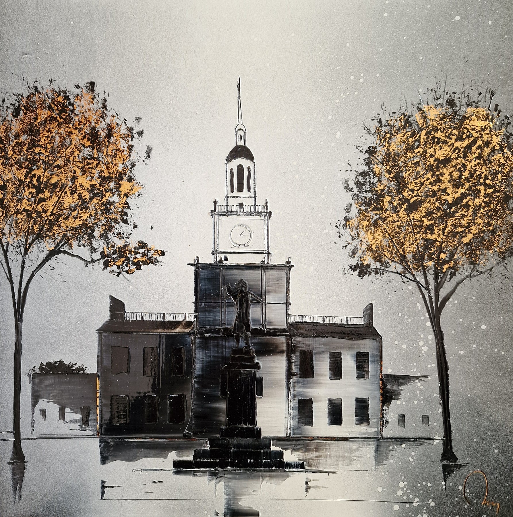 Julien Rey's story begins like all great stories: with an impossible dream. With achromatopsia (the absence of color vision), the artist sees only in black and white. Yet, this condition did not prevent him from traveling to the borders of Burma, from changing his life (he became a Buddhist monk), or from embarking on his art. From his trip to Burma, he brought back a perfect mastery of gold leaf and Chinese lacquer, a characteristic element in his work. His technique based on lacquer worked with a knife and gold leaf inlays places light at the center of his works. Marked by Zen philosophy, he creates minimal compositions that appear as suspended moments and poetic pauses. Julien Rey takes us on a journey through his paintings to urban landscapes and far-off lands.