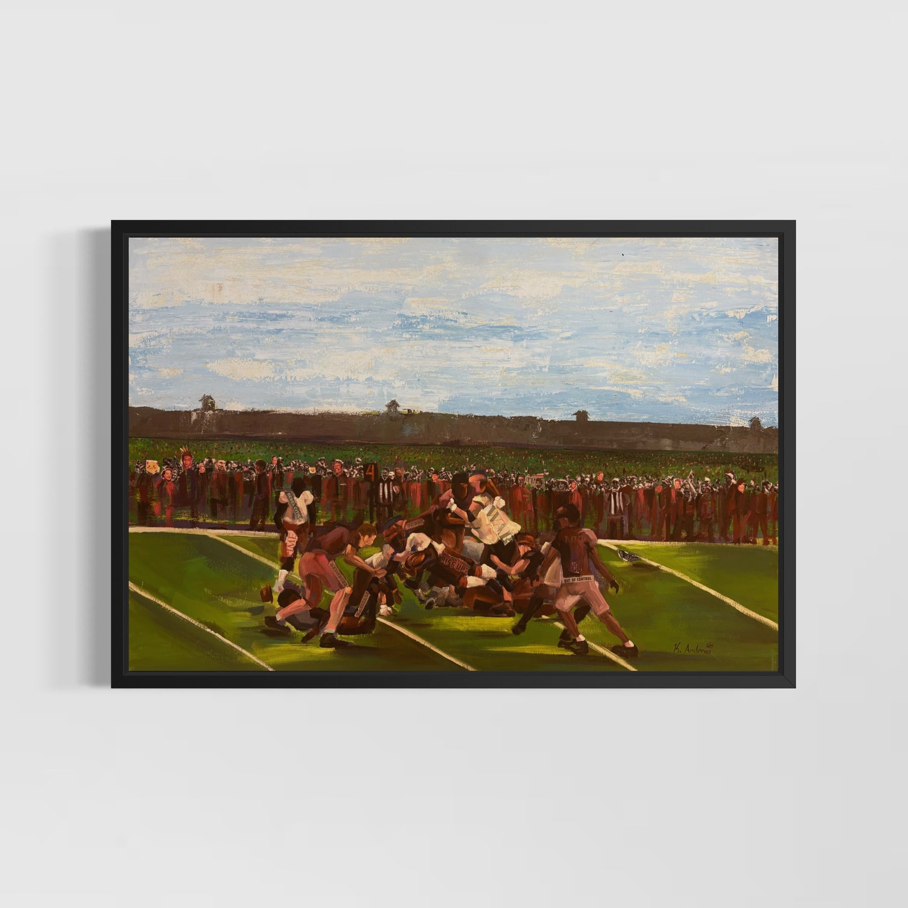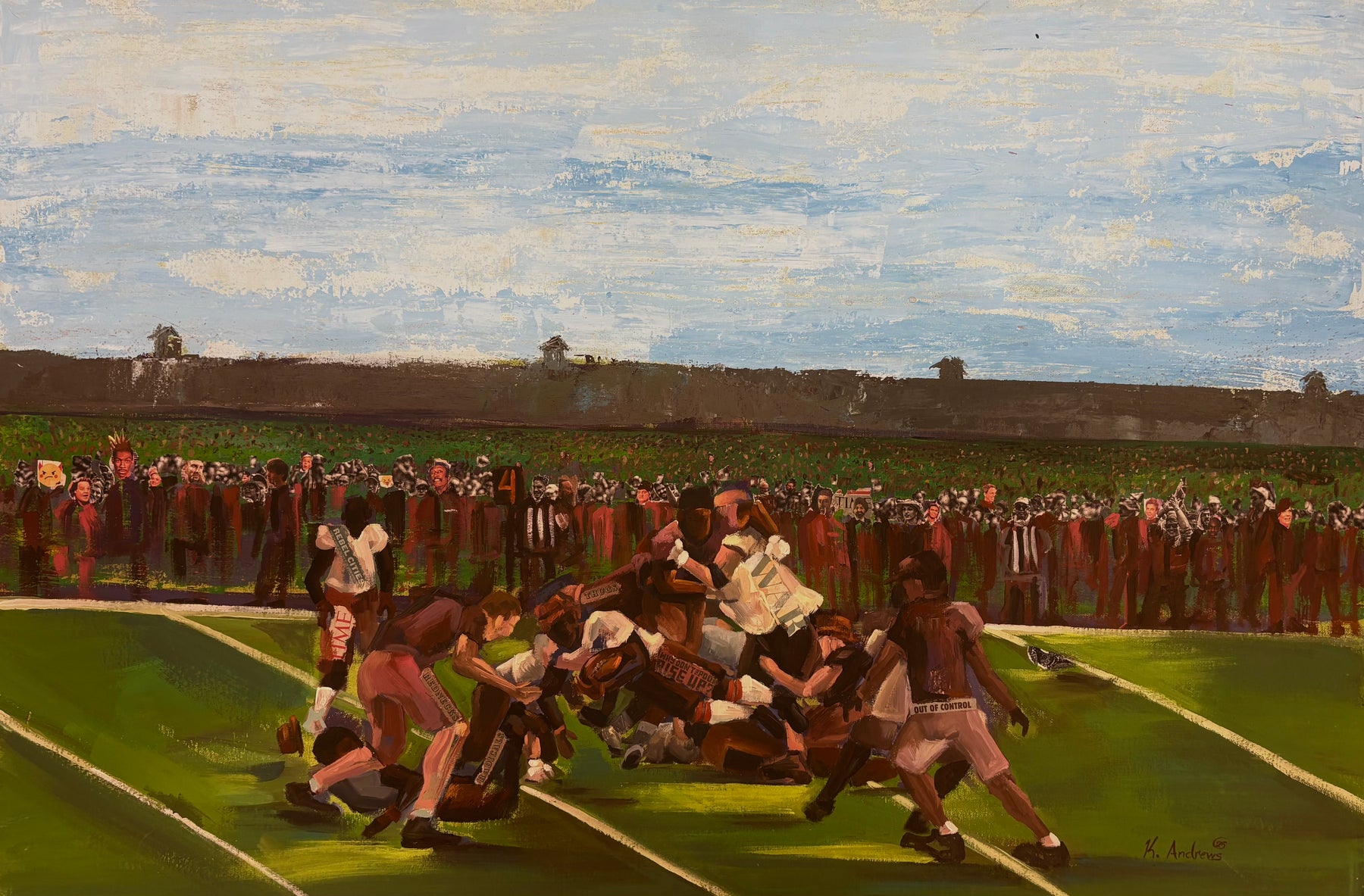 figures piled on football field and crowds standing by with blue sky and green grass tones of red and brown