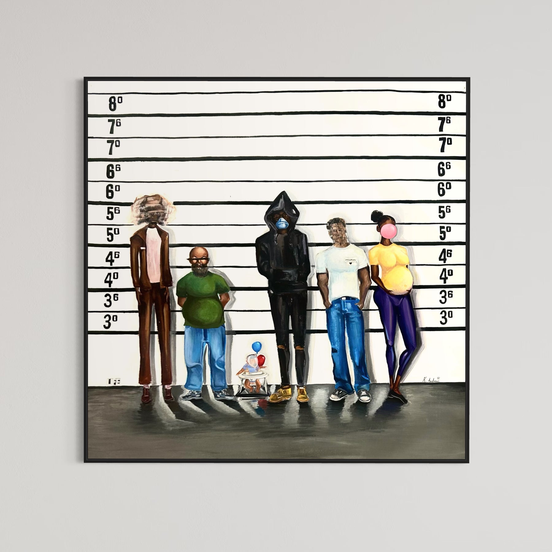 Acrylic Painting and Collage on Parachute Paper by Keith Andrews of a five individual in a prison line up with their face blurred. 54"x54". Bright green and blue foreground