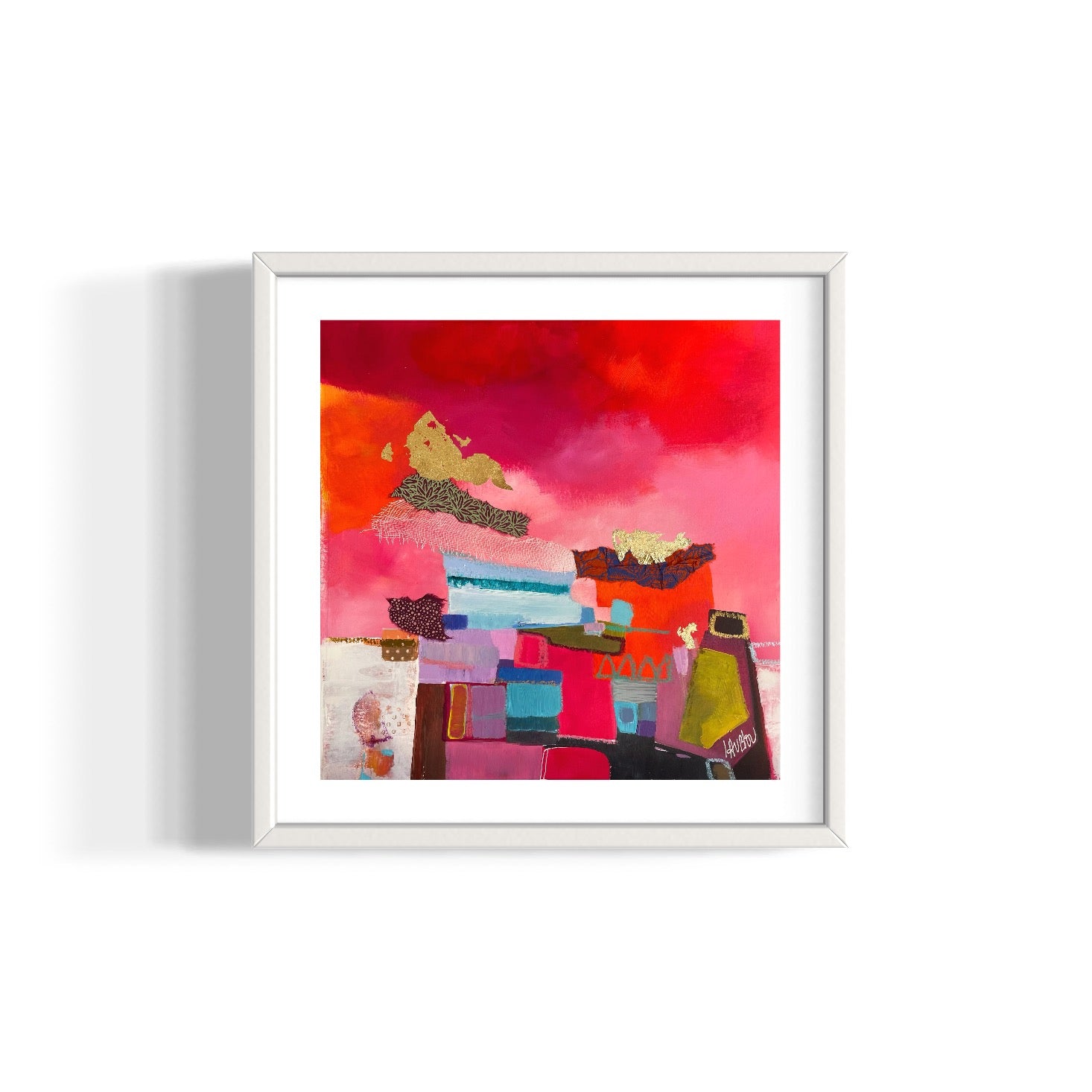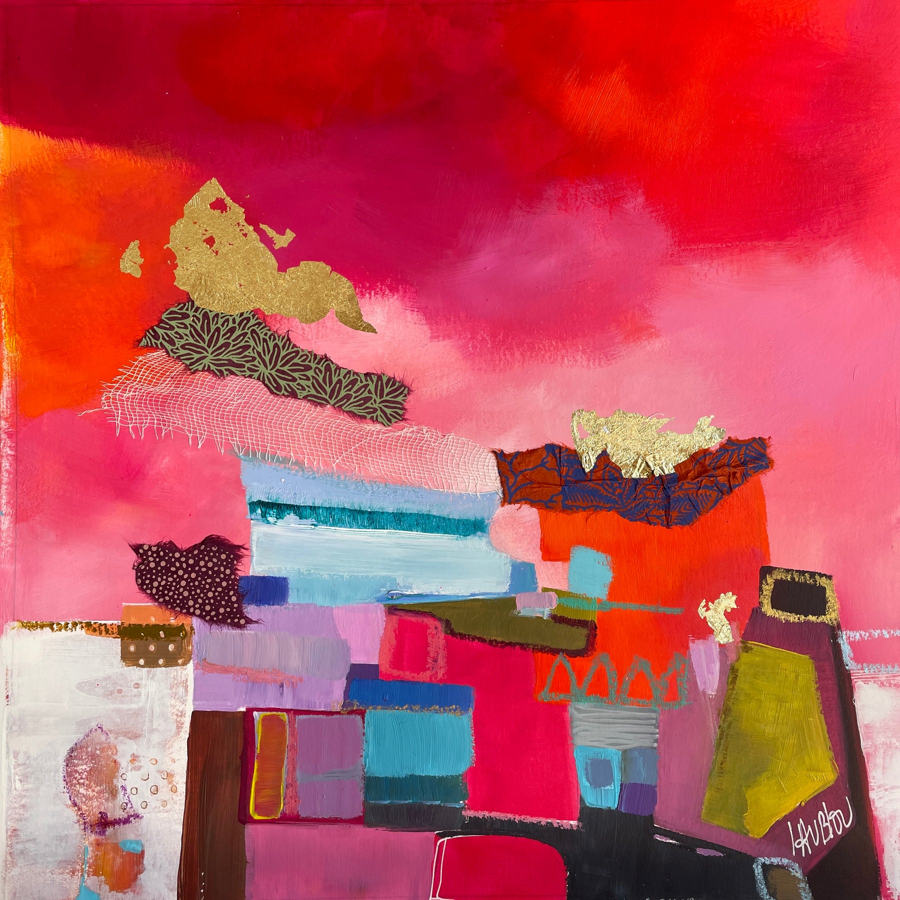 Growing up near the banks of the Loire river in France, abstract expressionist painter Lau Blou fell in love with the warm colors and softness of her natural surroundings. Her abstract paintings hint at landscapes, textured with paper and fabrics, gold and silver leaf, acrylic, and glazes. In her works, Lau Blou finds a masterful balance between chaos and negative space.