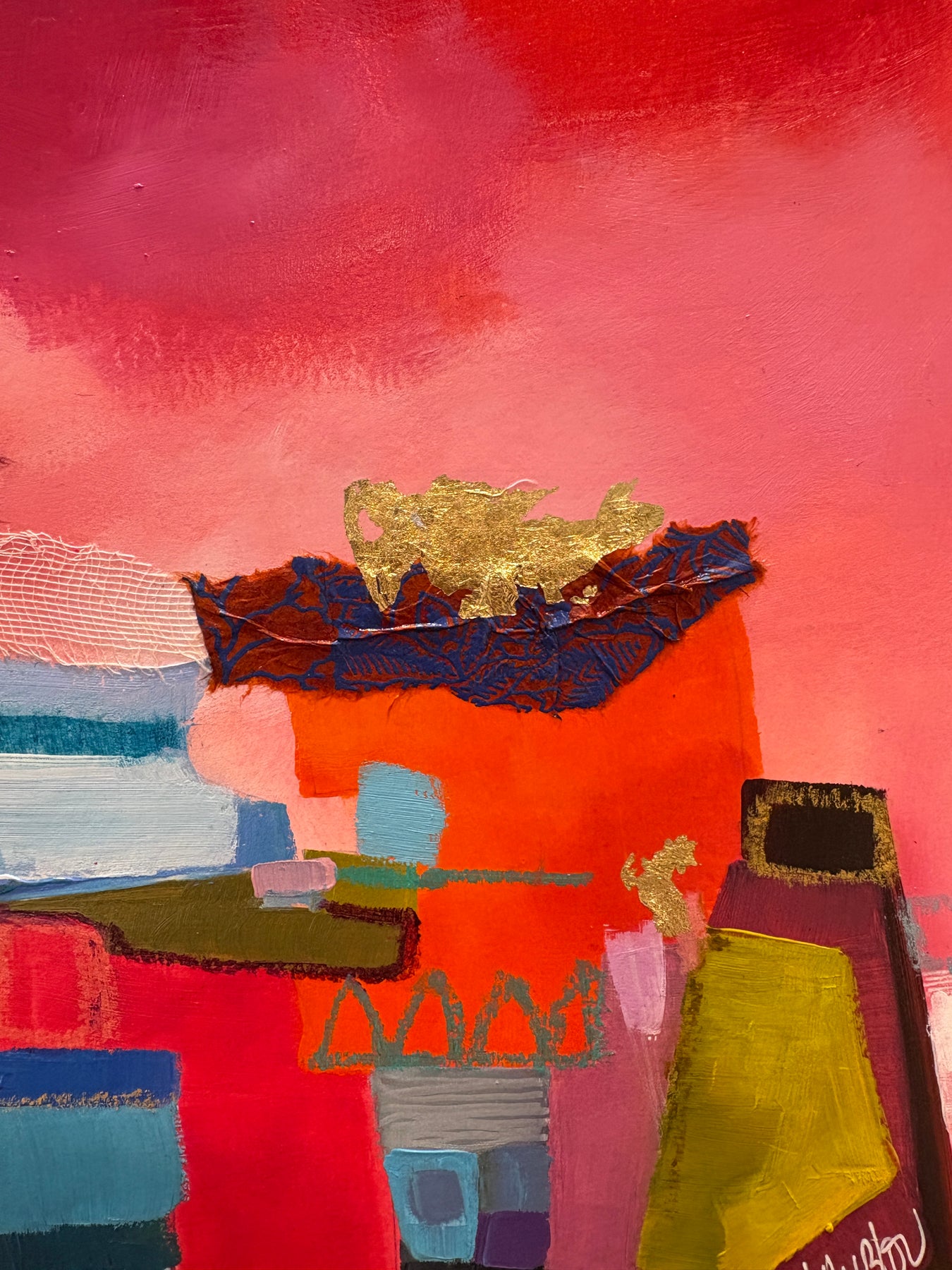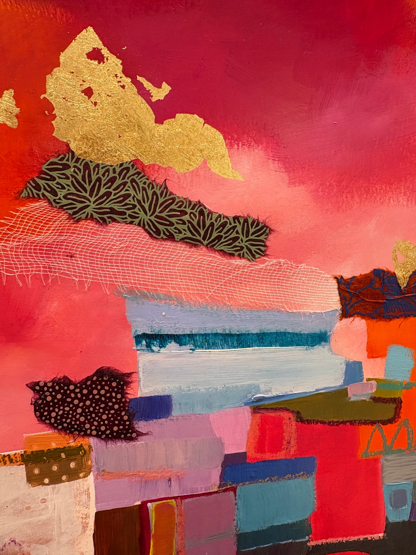 - Acrylic paint, fabric, and gold leaf on cardboard