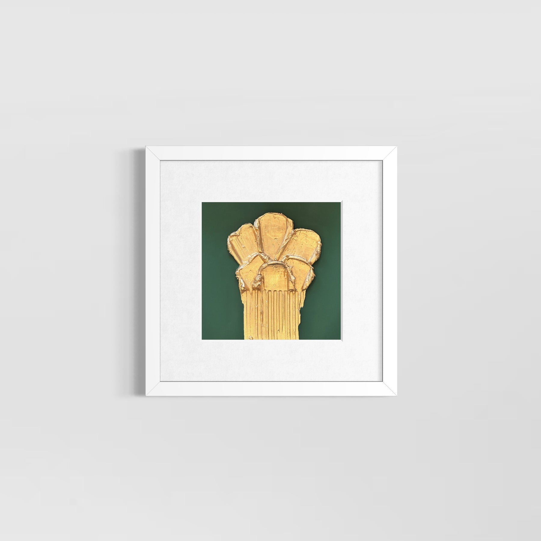 layered gold texture joint compound sculpted with lines running down on matte green dark forrest hunter background abstract minimal floral bouquet