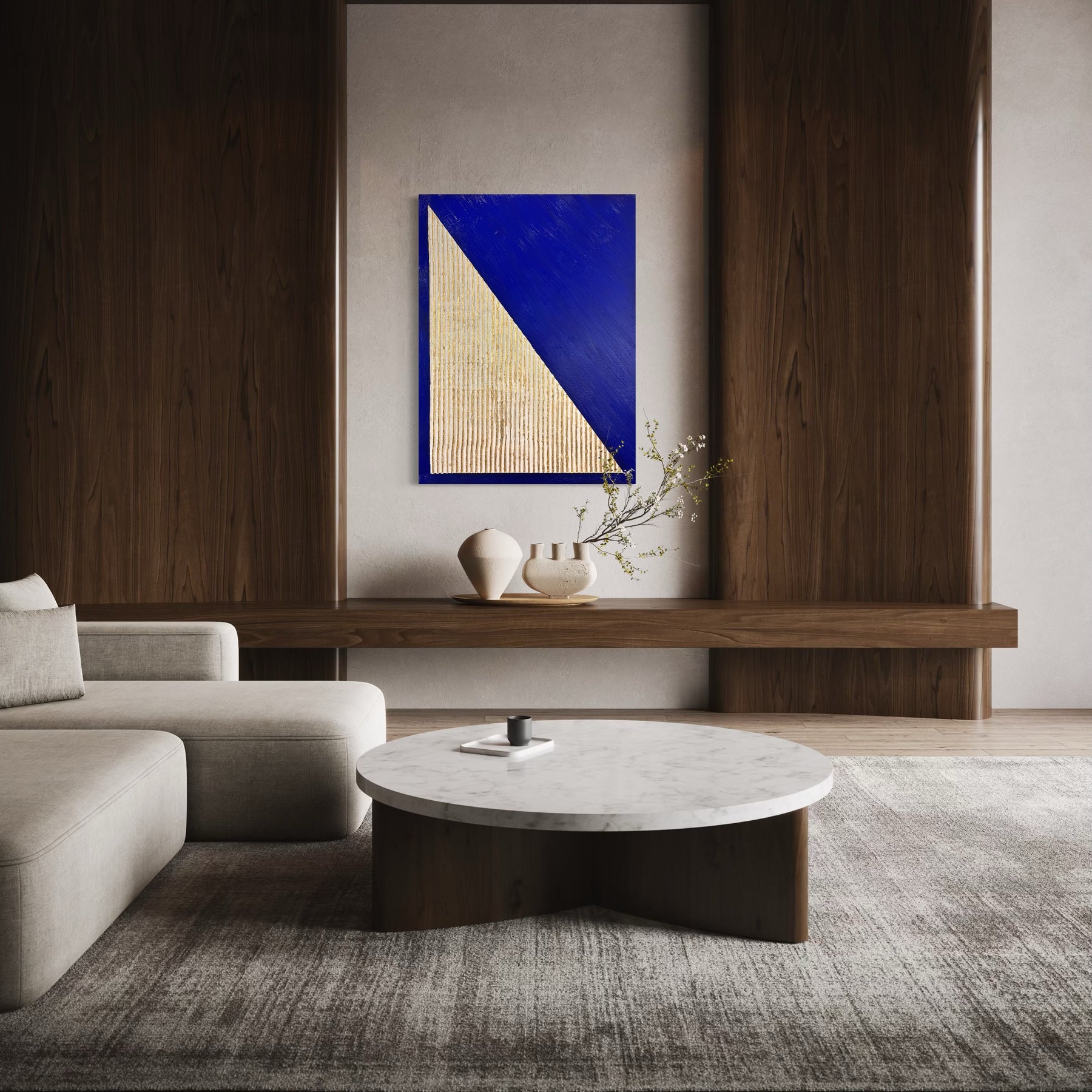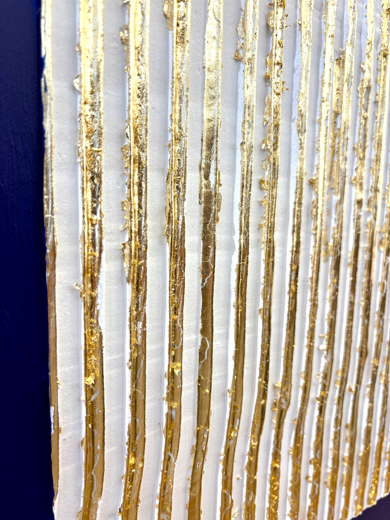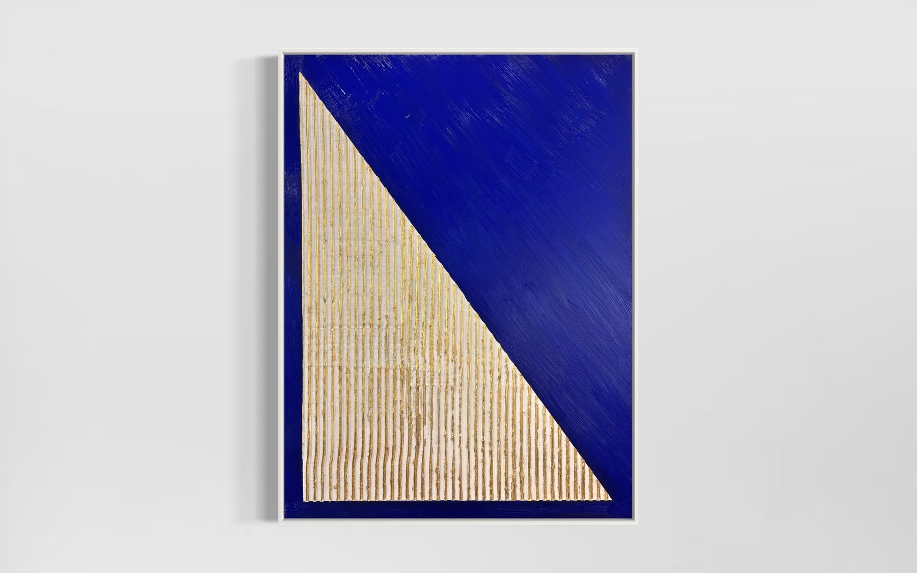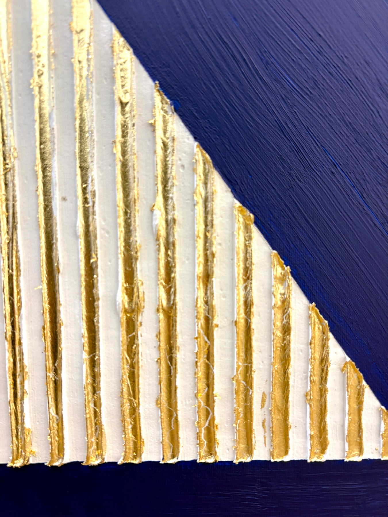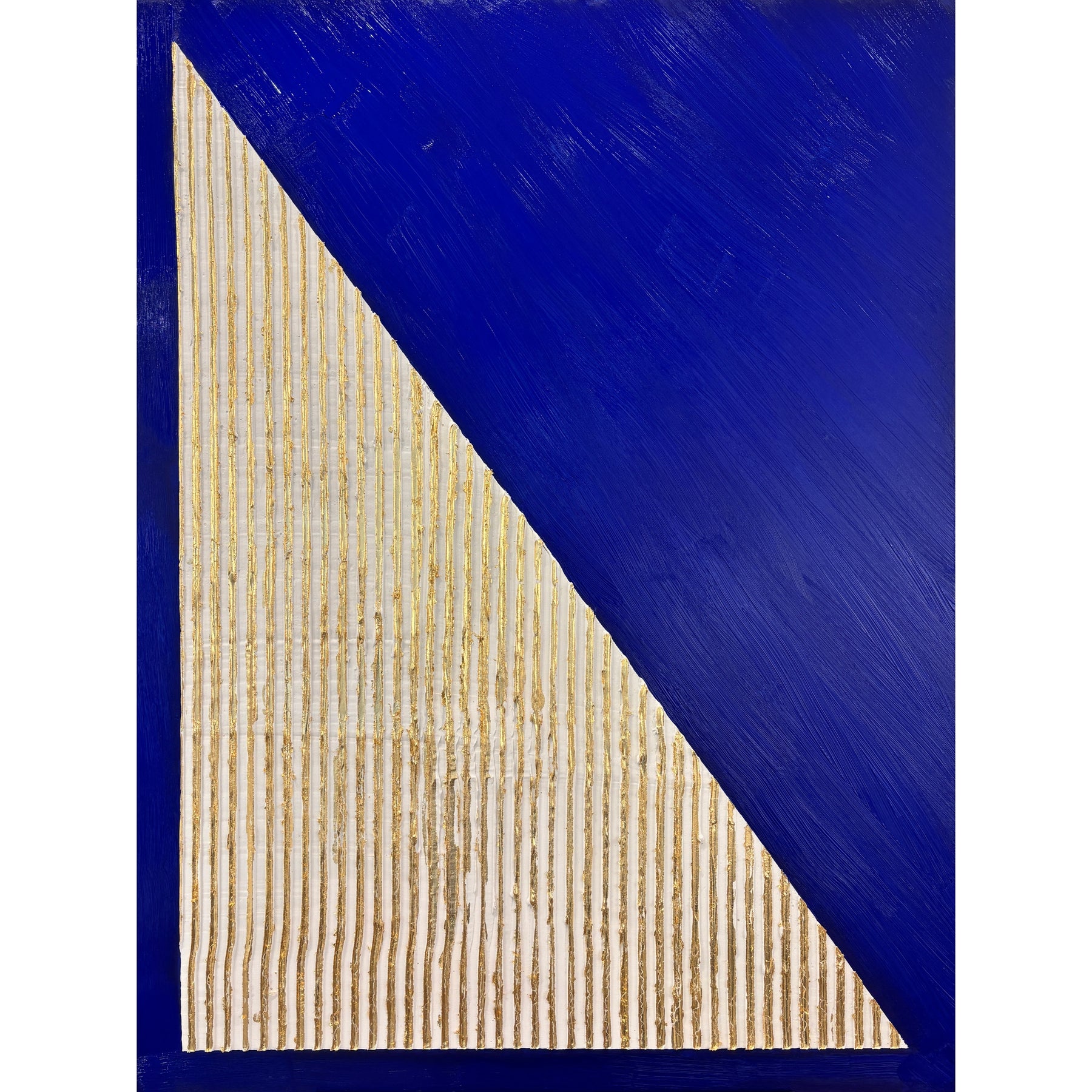 minimal geometric abstract sculptural work with joint compound texture dimension white rigid triangle with gold leaf detail on blue background