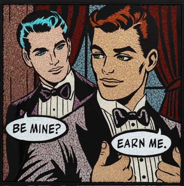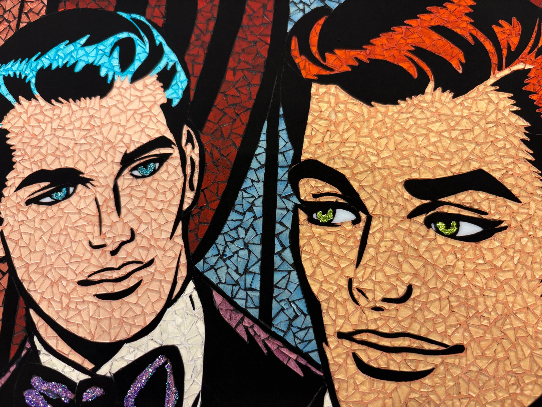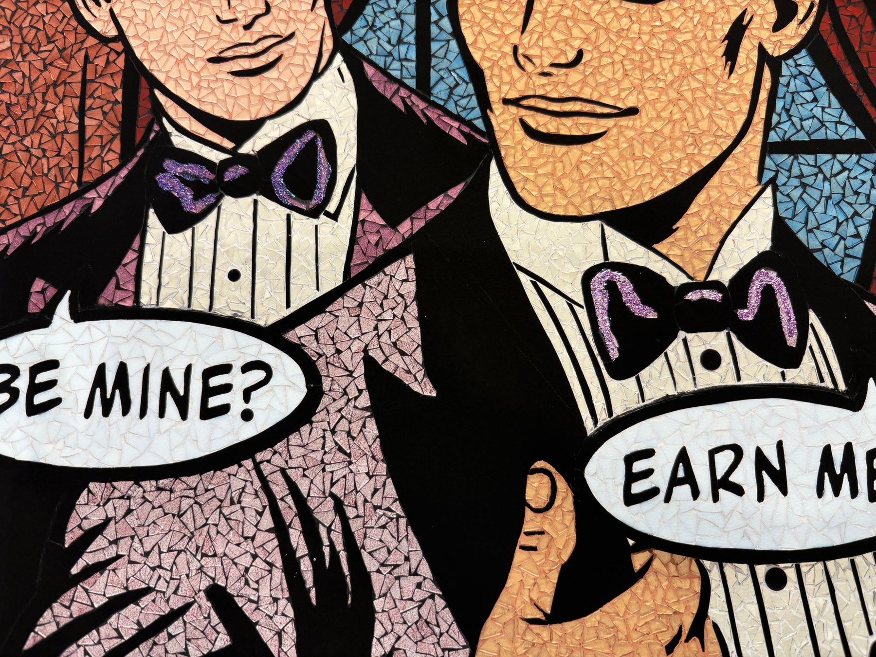 limited edition stain glass mosaic giclee print hand embellished with glitter  text bubble comic style retro vintage men in tuxedos flirting blue hair and red hair