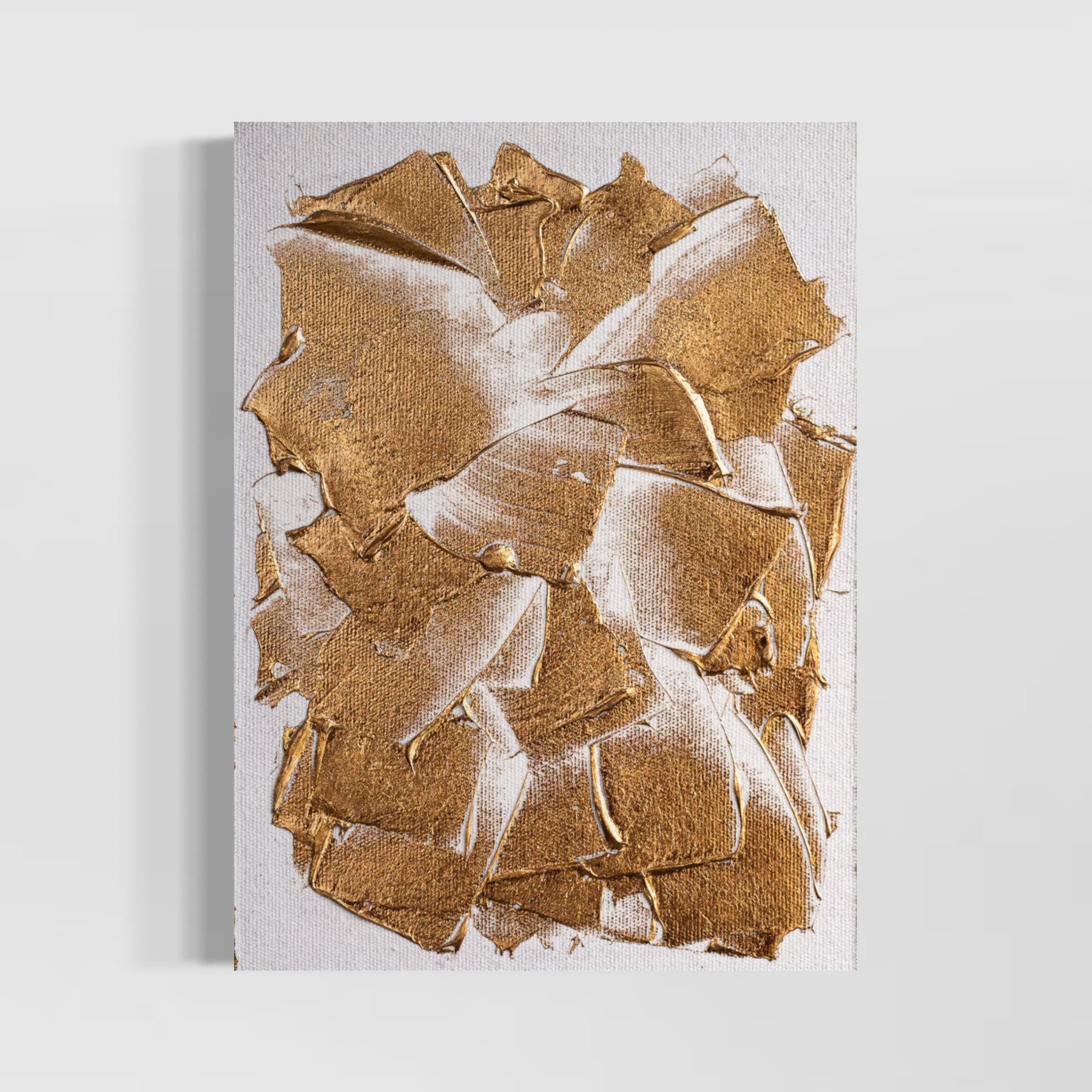 NYC based artist, M. Clark, creates light-reflecting works wherein the artist manipulates heat and pressure to fix metallic foil onto various surfaces -- there is no paint on her artworks, only gold, copper, or silver foil. Clark often uses a palette knife to help texturize her highly reflective, modern and minimalist works of art.