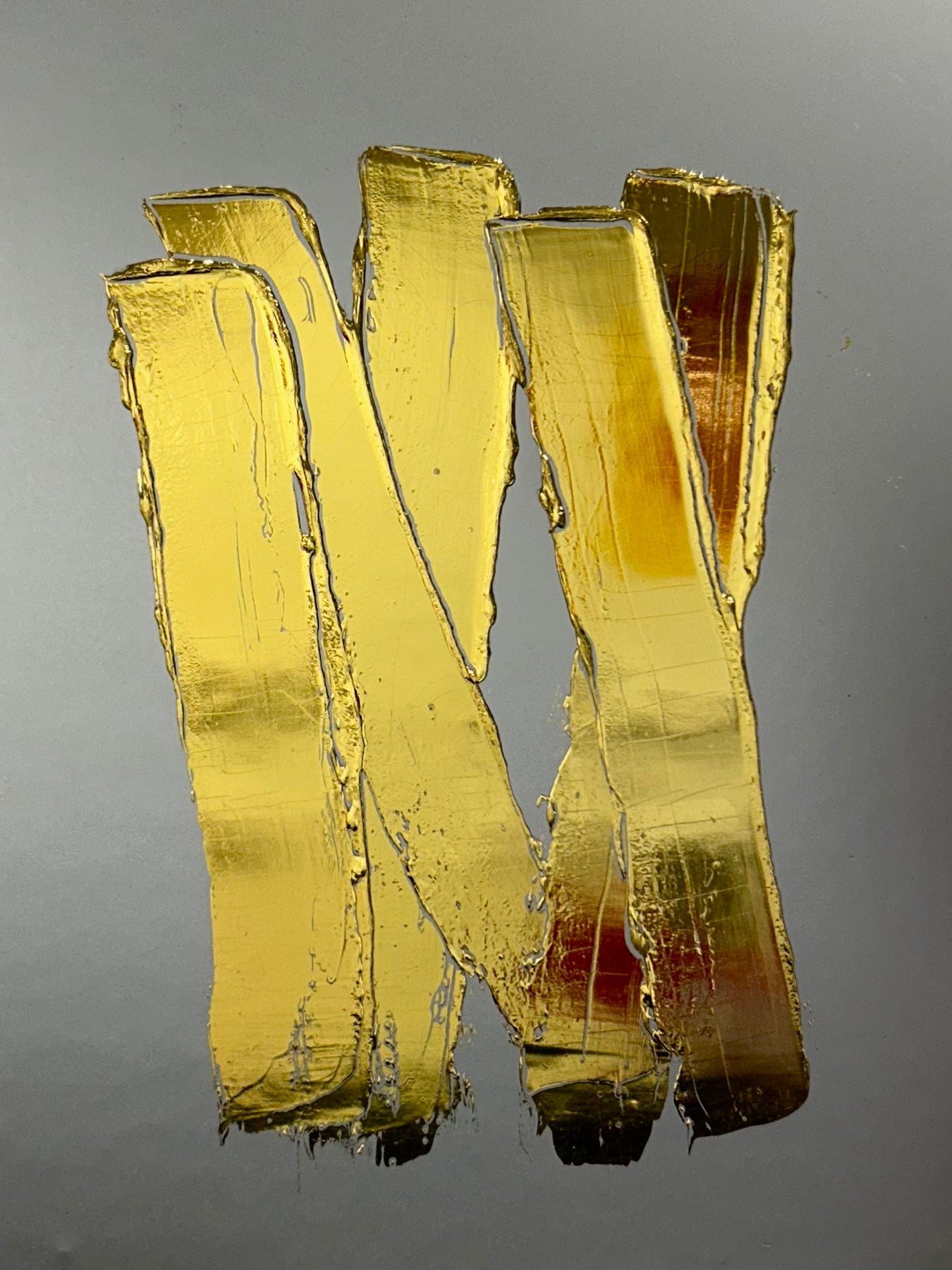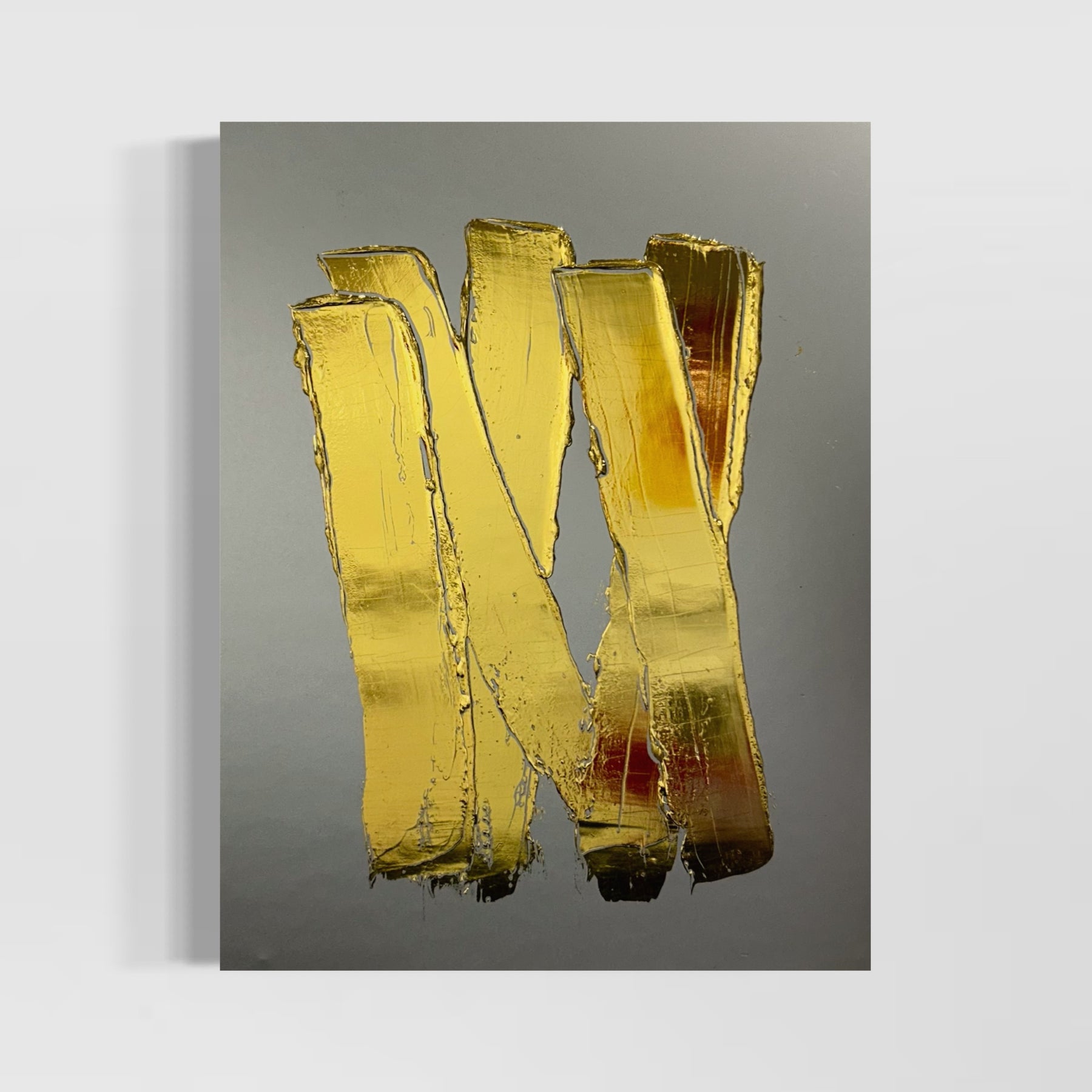 NYC based artist, M. Clark, creates light-reflecting works wherein the artist manipulates heat and pressure to fix metallic foil onto various surfaces -- there is no paint on her artworks, only gold, copper, or silver foil. Clark often uses a palette knife to help texturize her highly reflective, modern and minimalist works of art.
