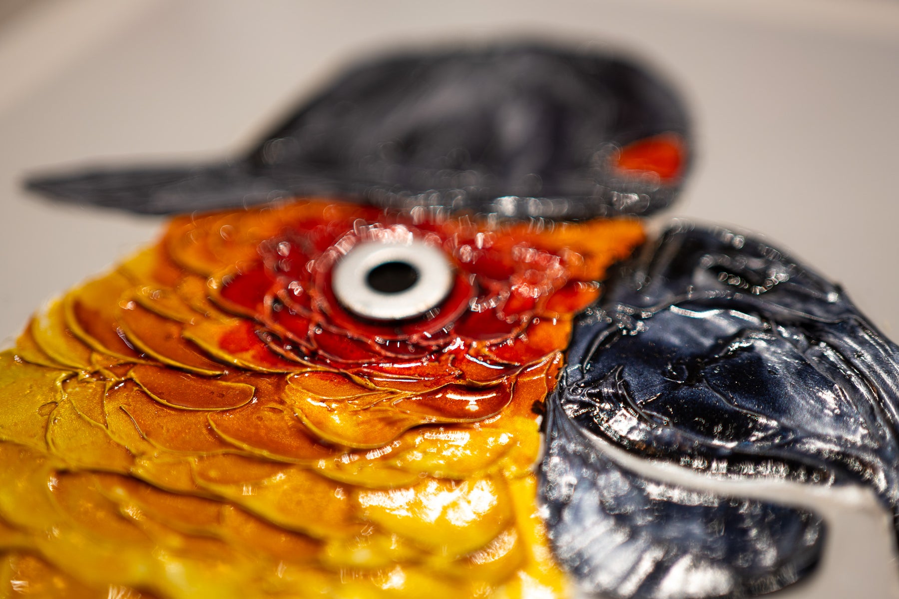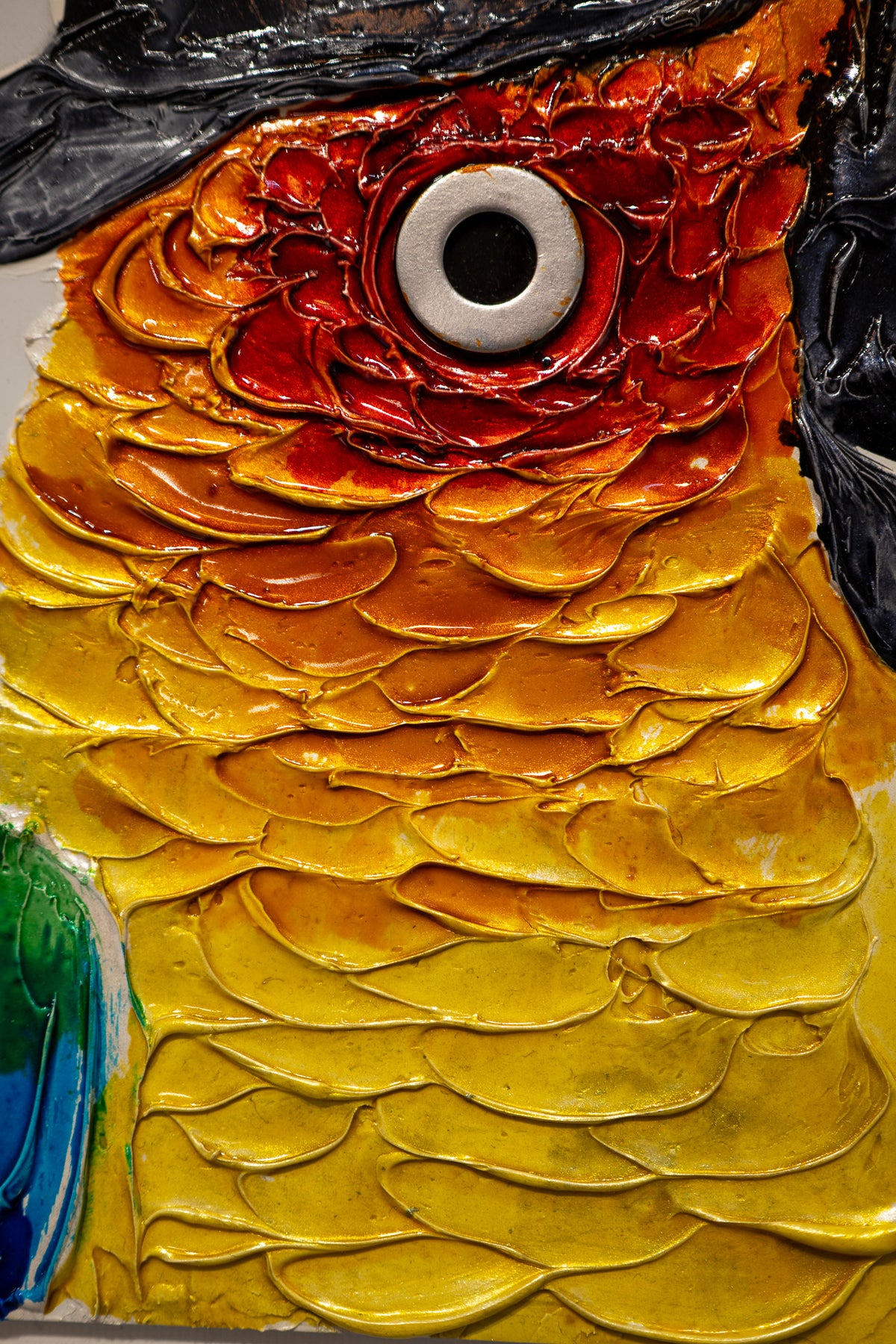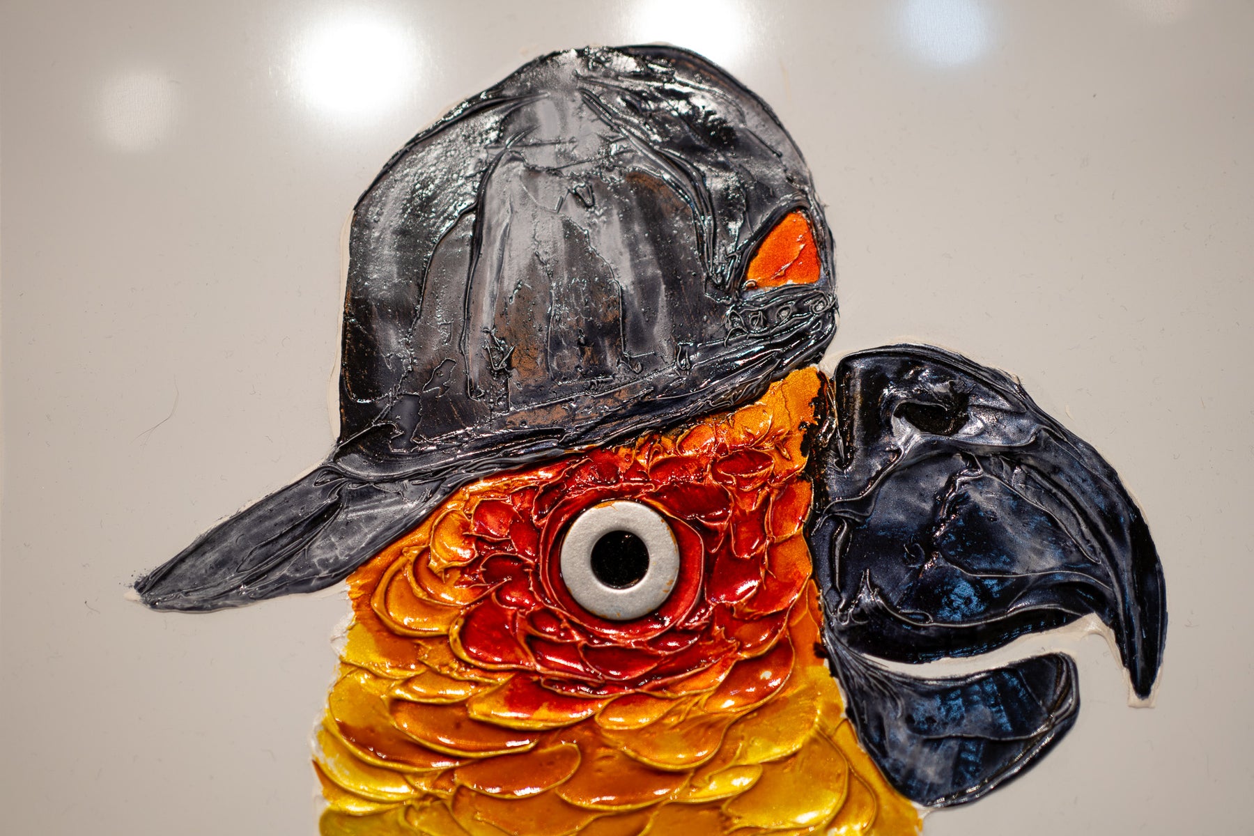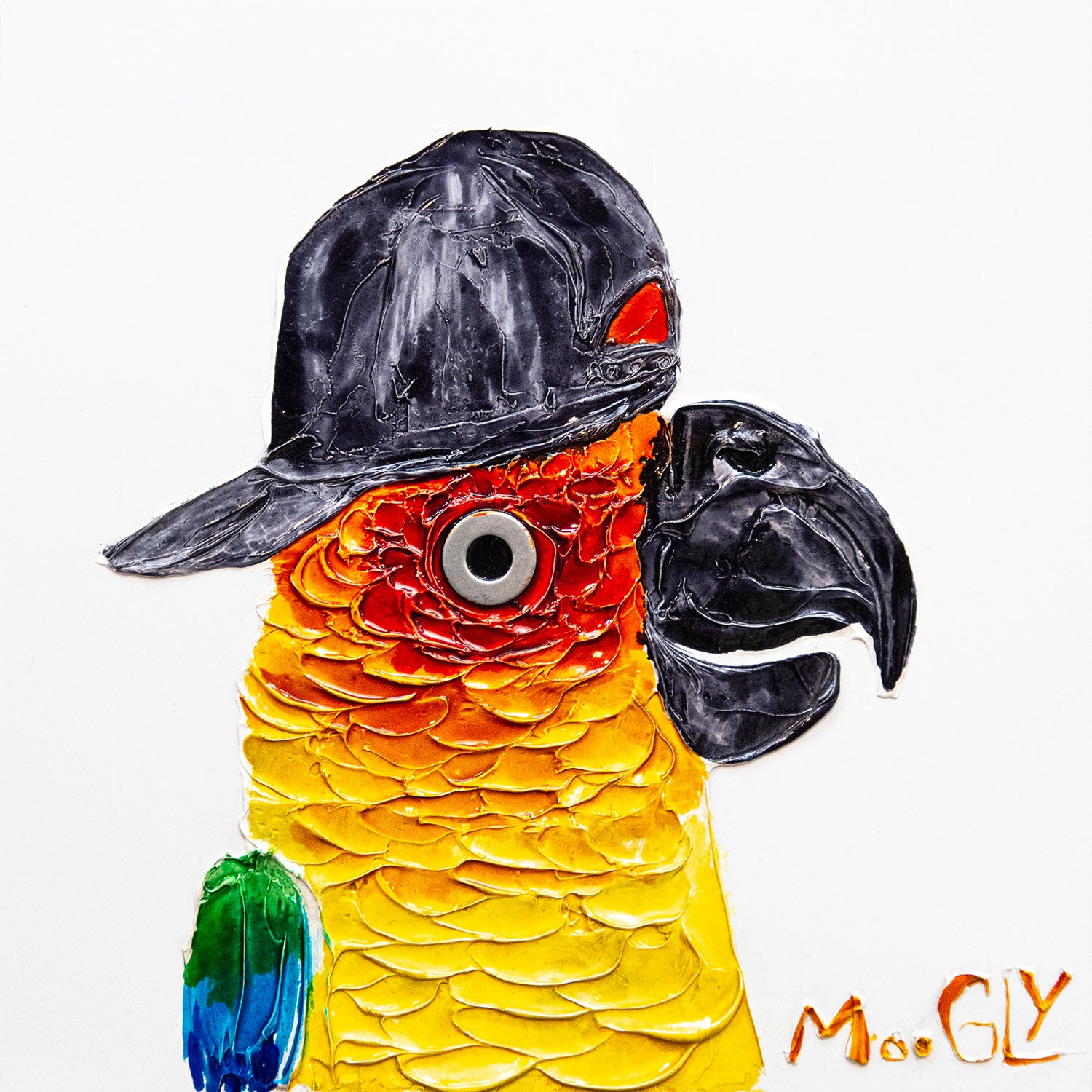 Acrylic and resin 12" x 12" Chatty painting by Moogly. Humanized colorful parrot wearing a backwards baseball cap, with a washer eye.