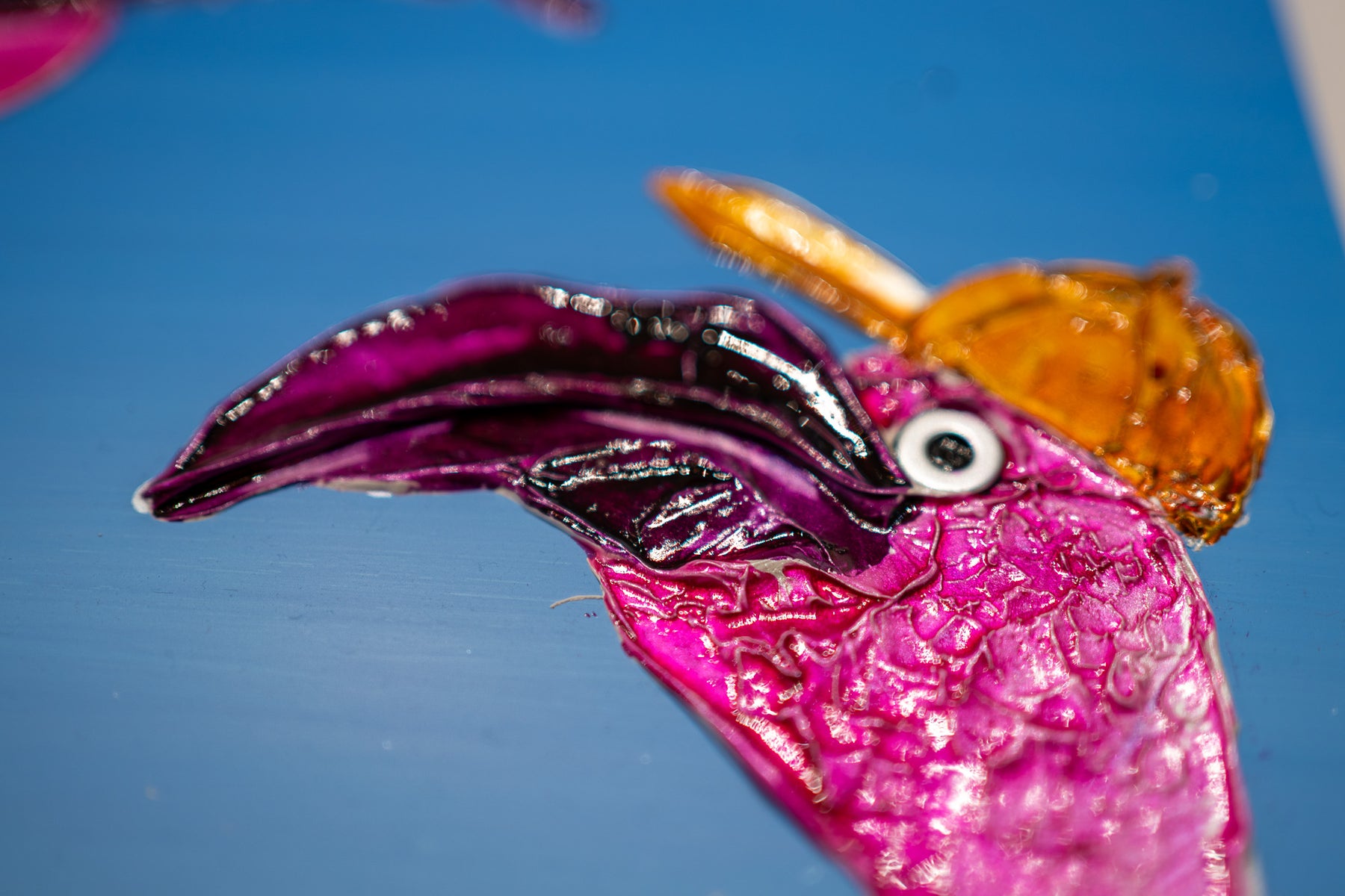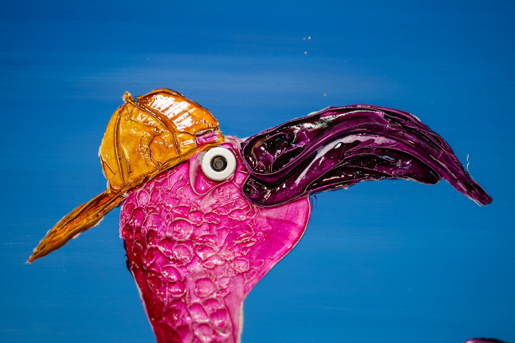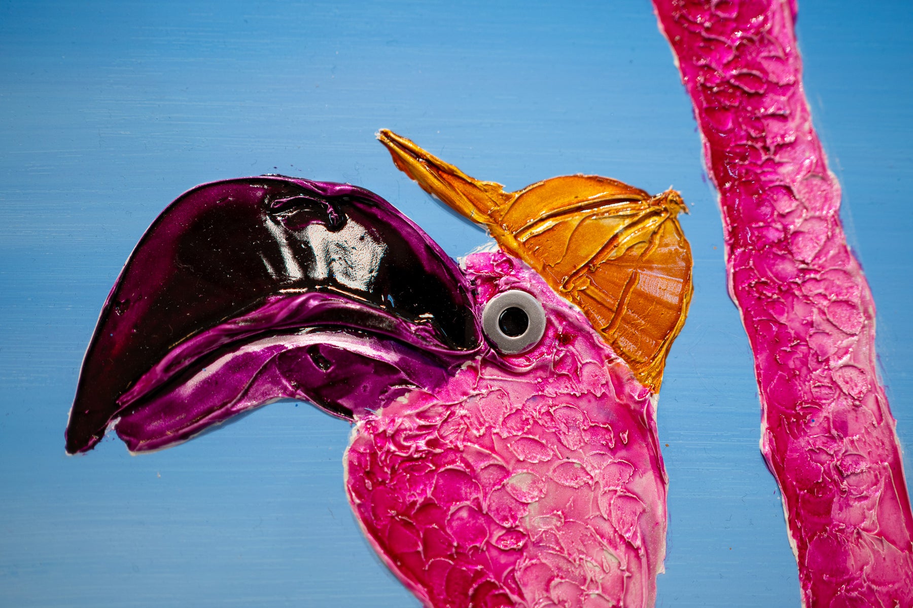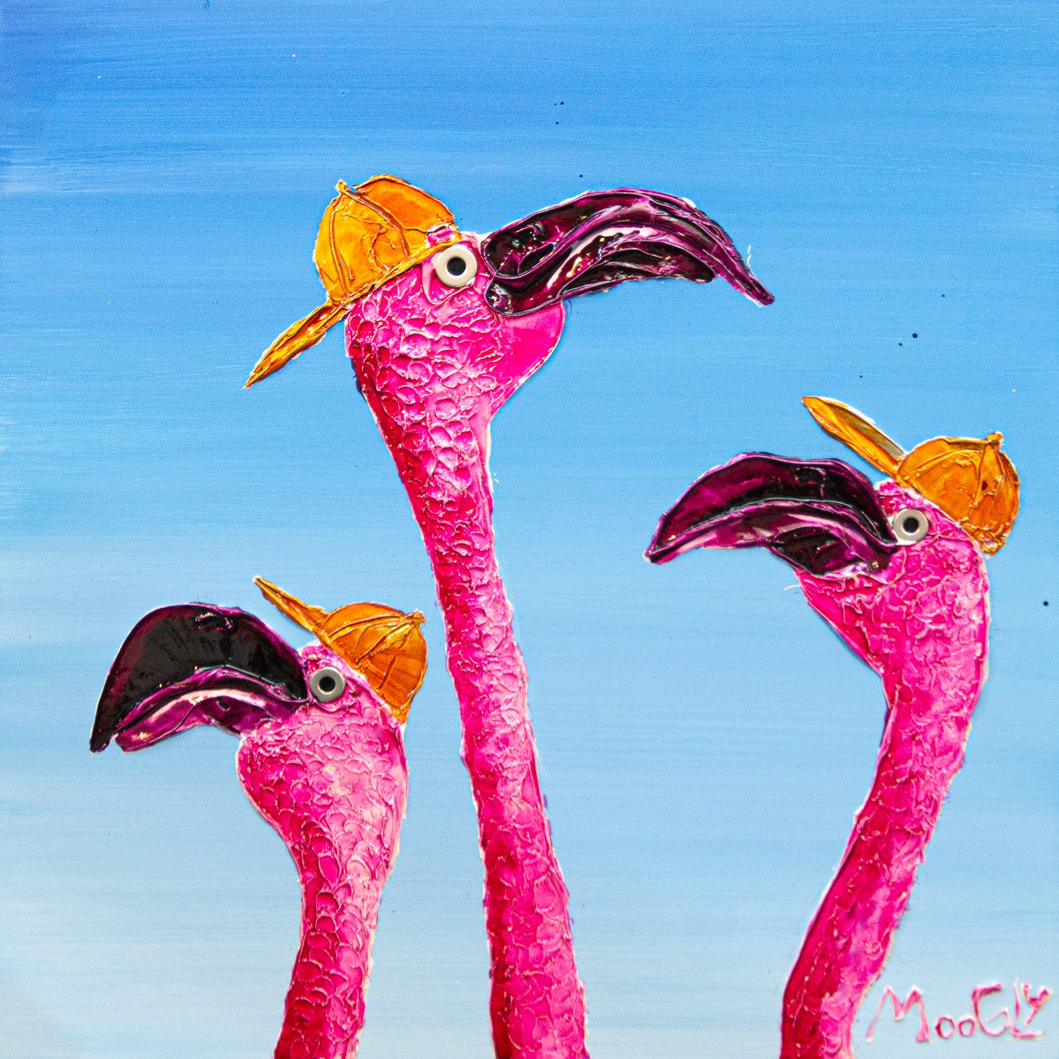 Acrylic 17" x 17" matted Trippers painting by Moogly. Hot pink animated flamingos wearing orange baseball caps and looking around in different directions.