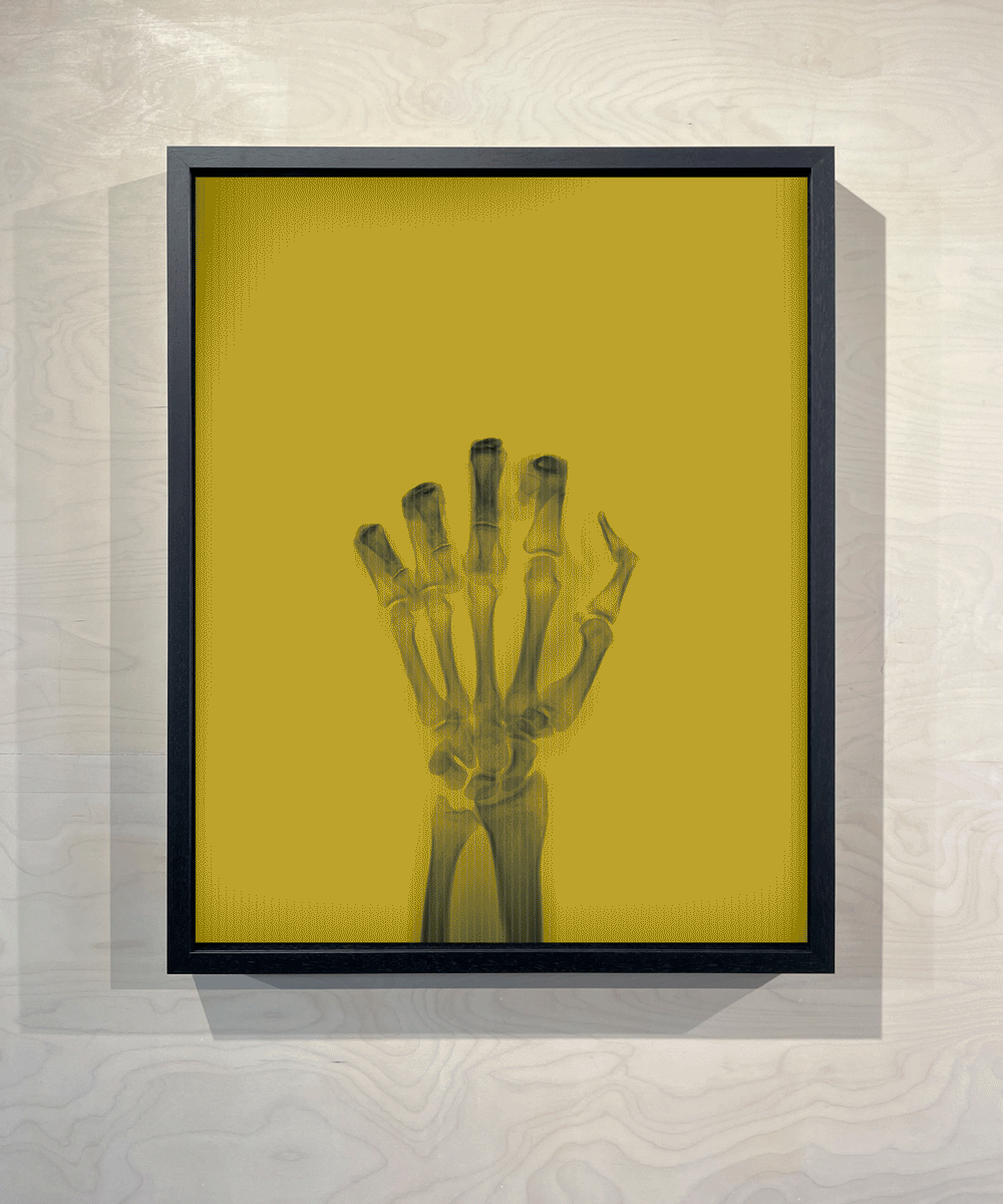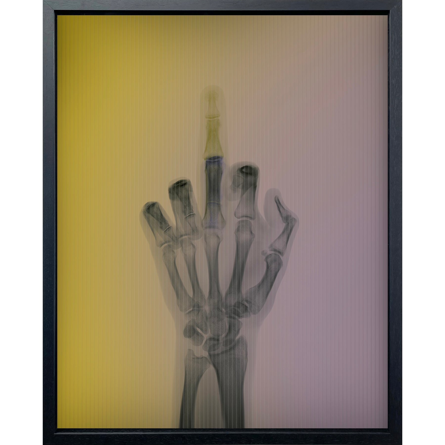 x ray hand with middle finger going up and down as color in background gradient transitioned from yellow to purple in background