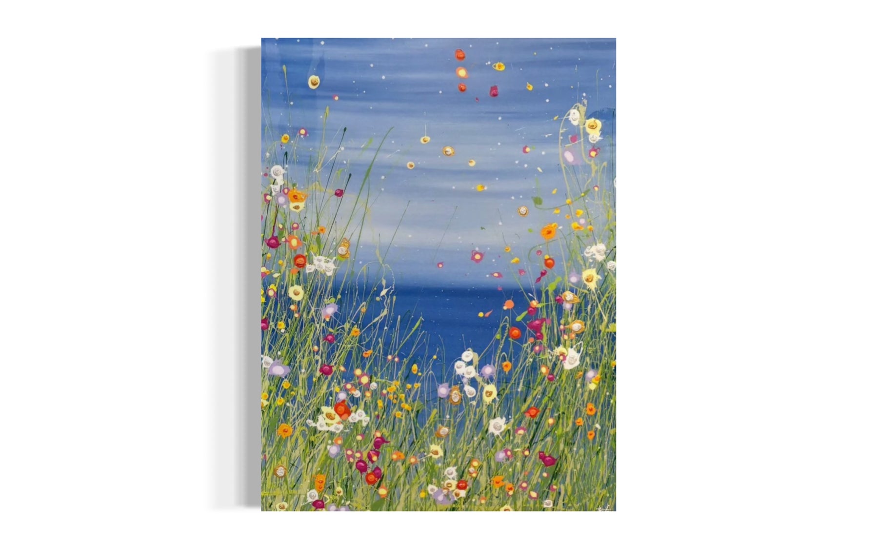 bright blue gradient skyline horizon ocean abstract grass and flowers landscape splattered abstract expressionist