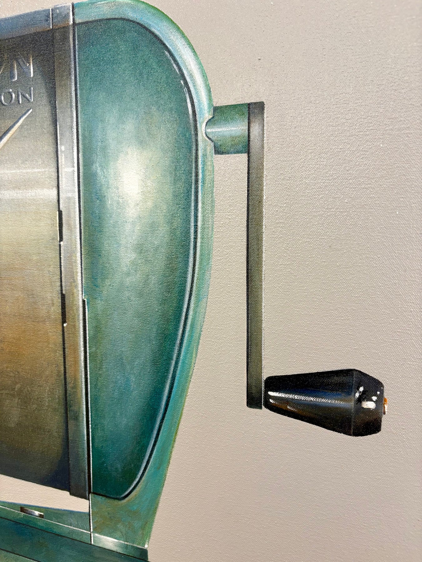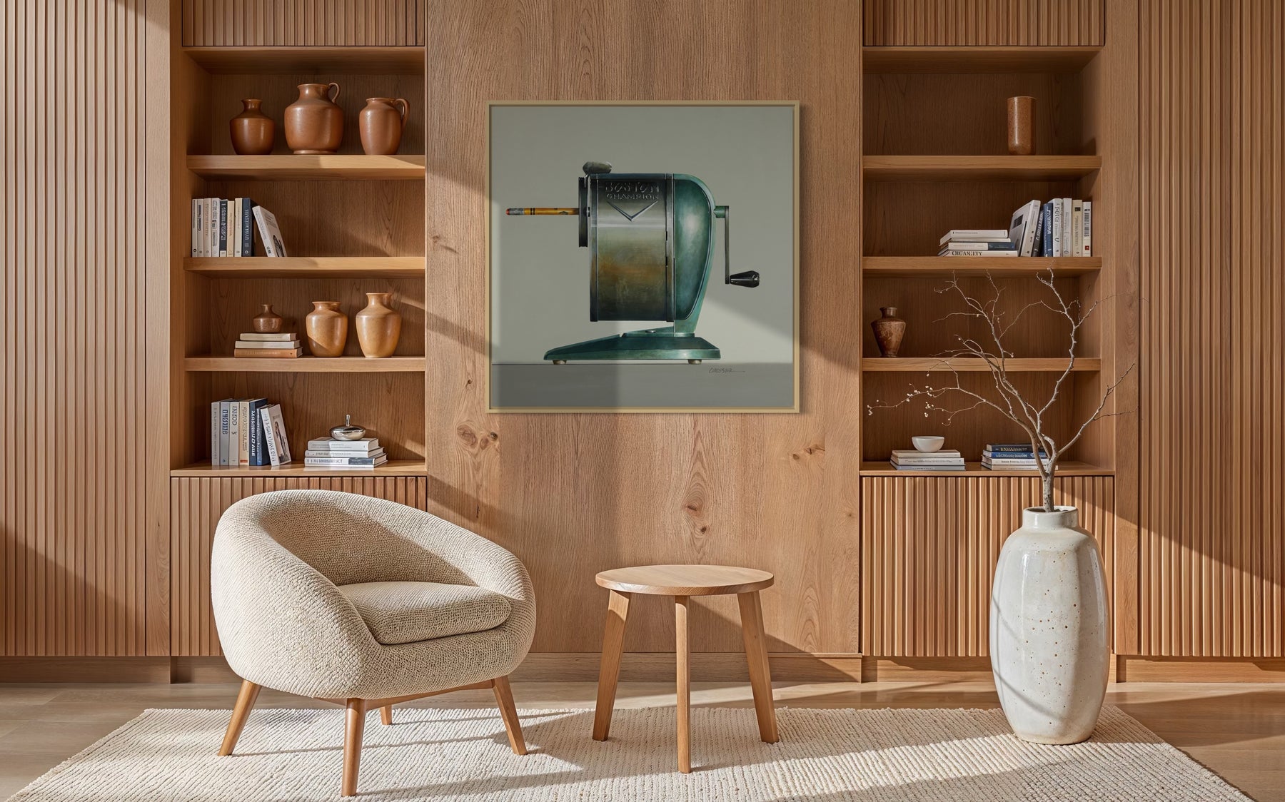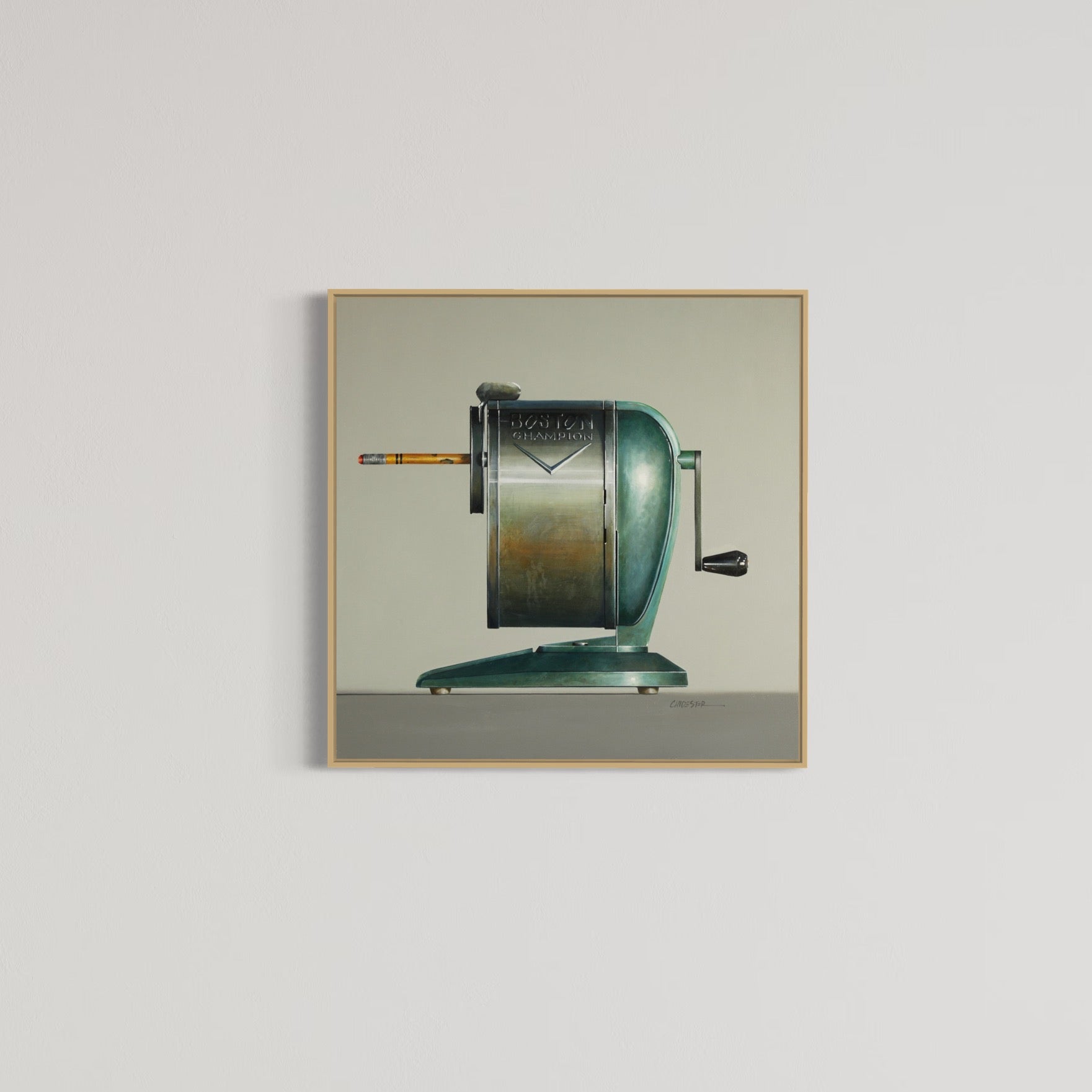Realistic painting of a vintage manual Boston Champion pencil sharpener with a pencil and eraser. 30"X30" oil on canvas. Minimalist off white and grey background.