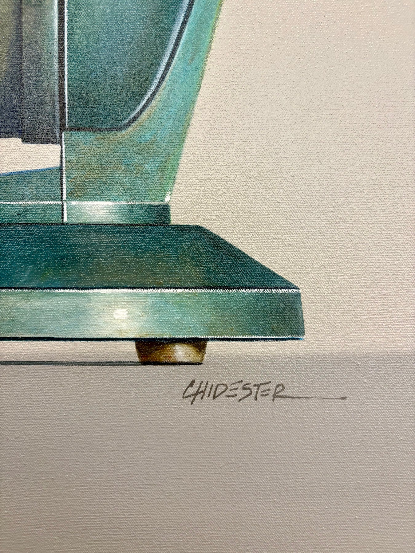 In her gorgeous photo-realistic still-lifes, American oil painter Wendy Chidester pays homage to lost relics of the past. Artifacts like vintage cameras and projectors, 40’s trunk luggage, bubblegum machines, childrens’ pedal cars and tricycles, and old telephones and typewriters are represented nostalgically in her work. She frames these objects as icons, memorializing the color and ingenuity of the past.