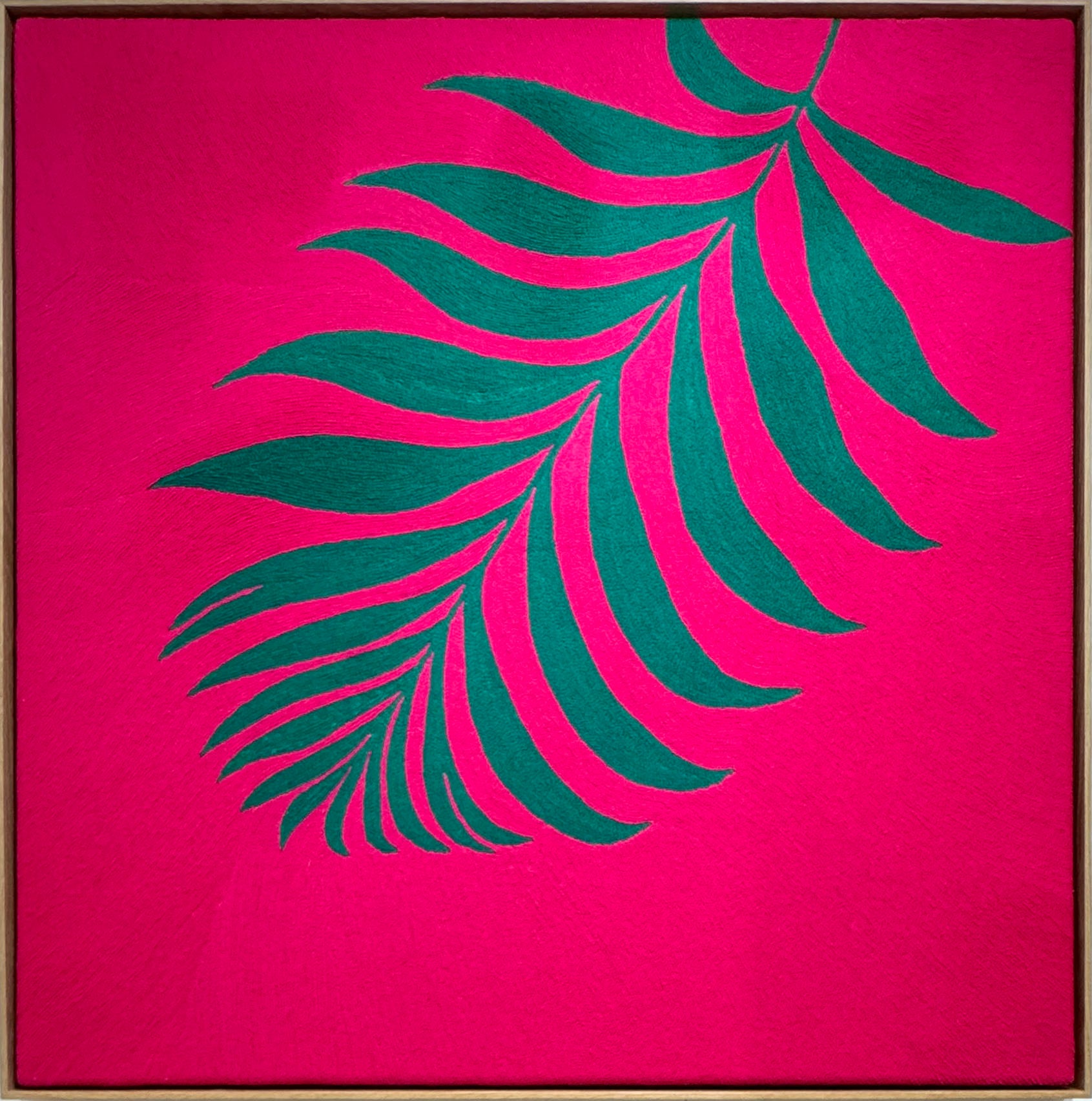 42.5"x42.5" chain-stitched textile with a tropical leaf over a bright pink background.