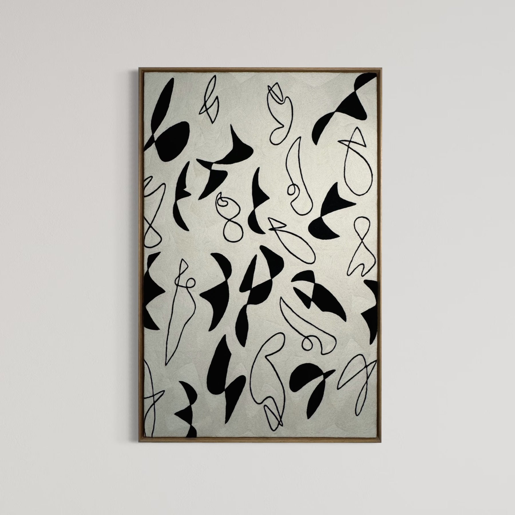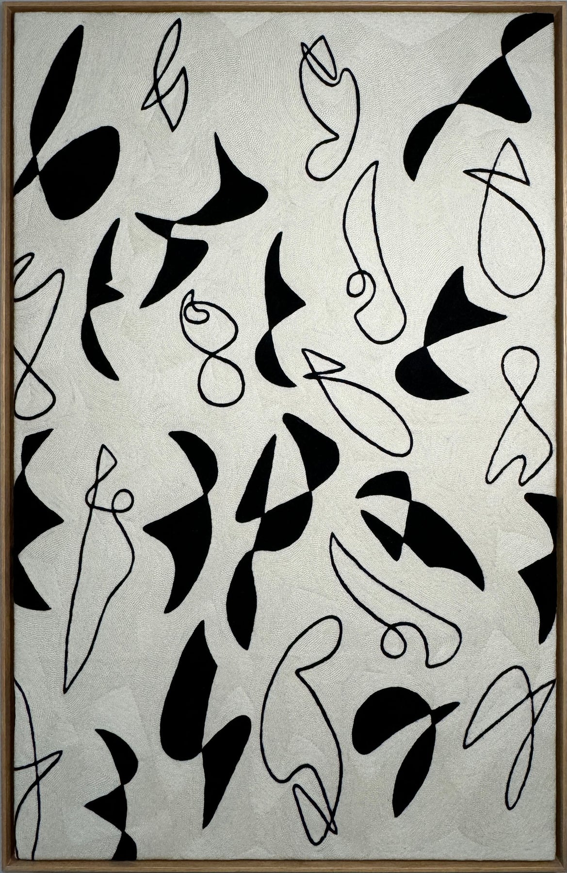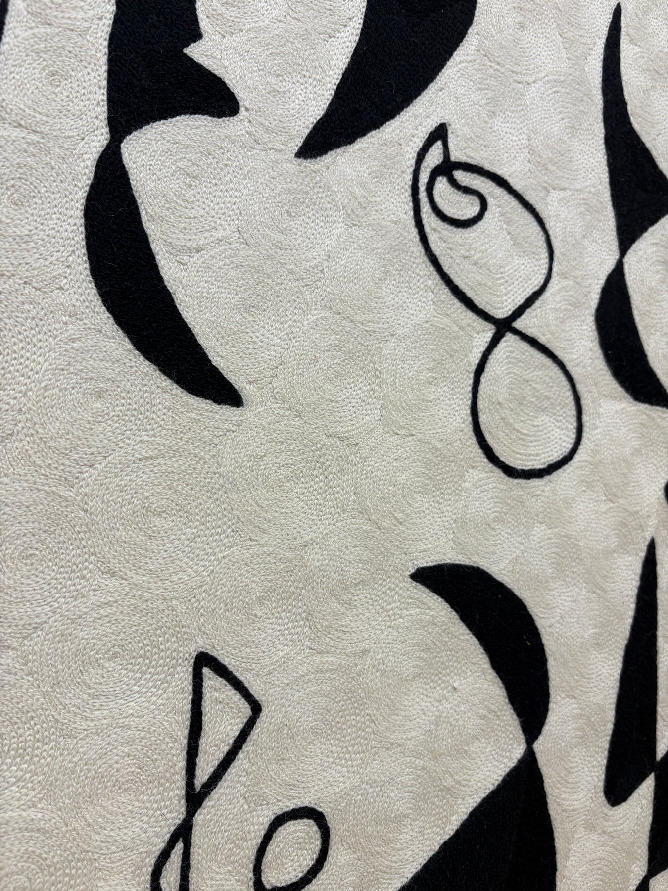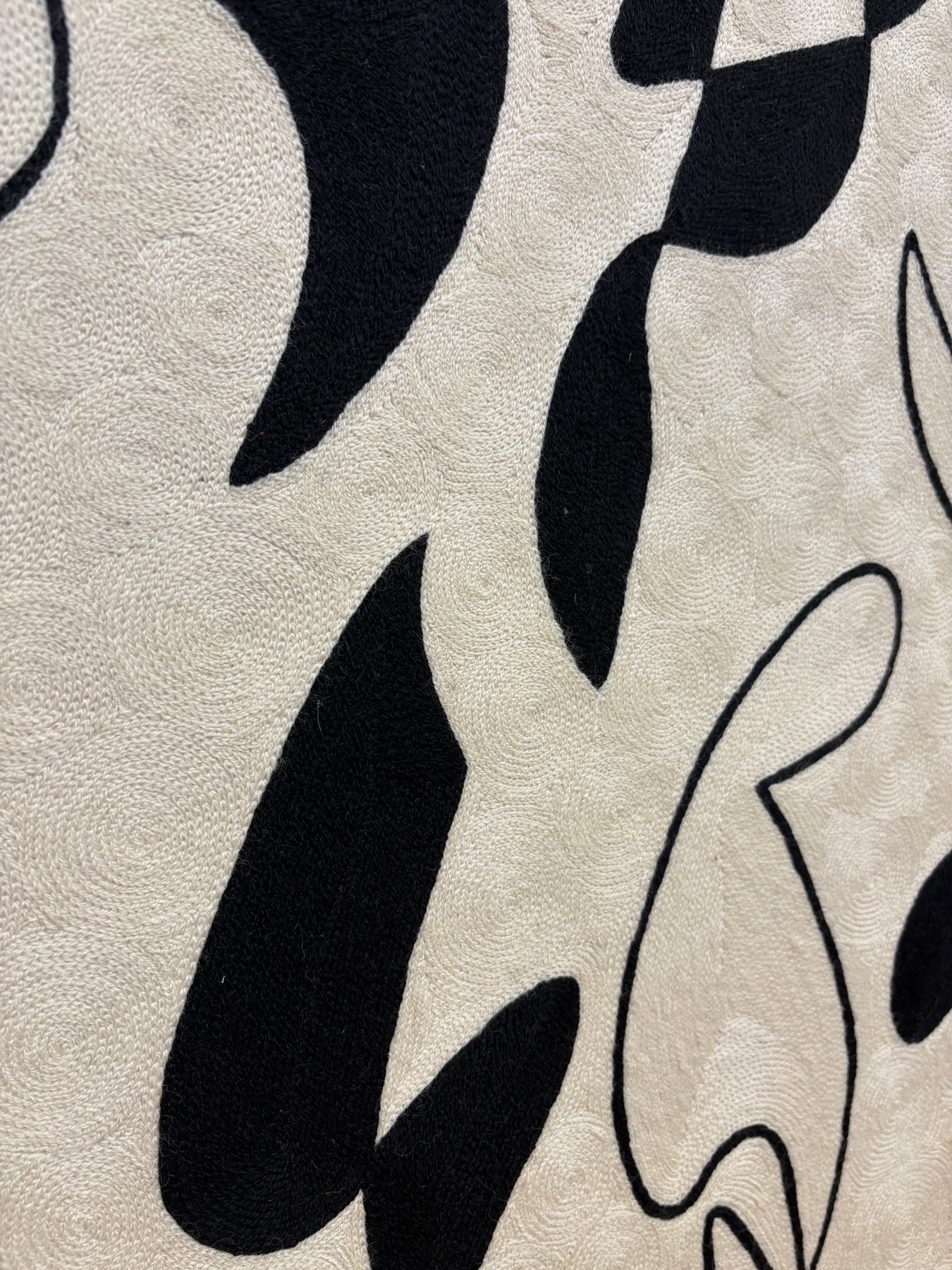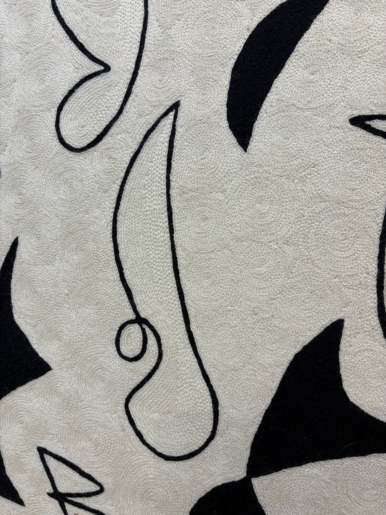 abstract shapes doodles line work in black and white negative space solid heavy chain stitched textile fabric embroidery