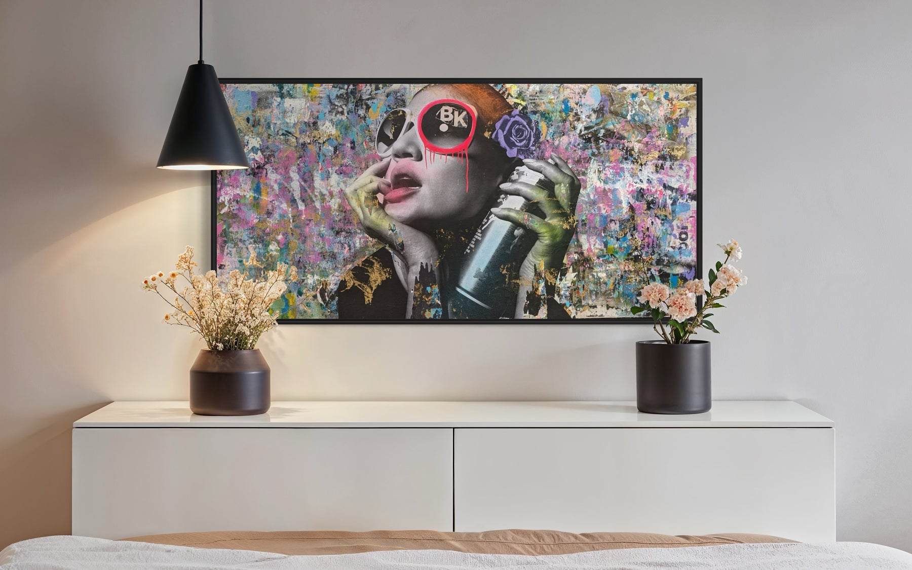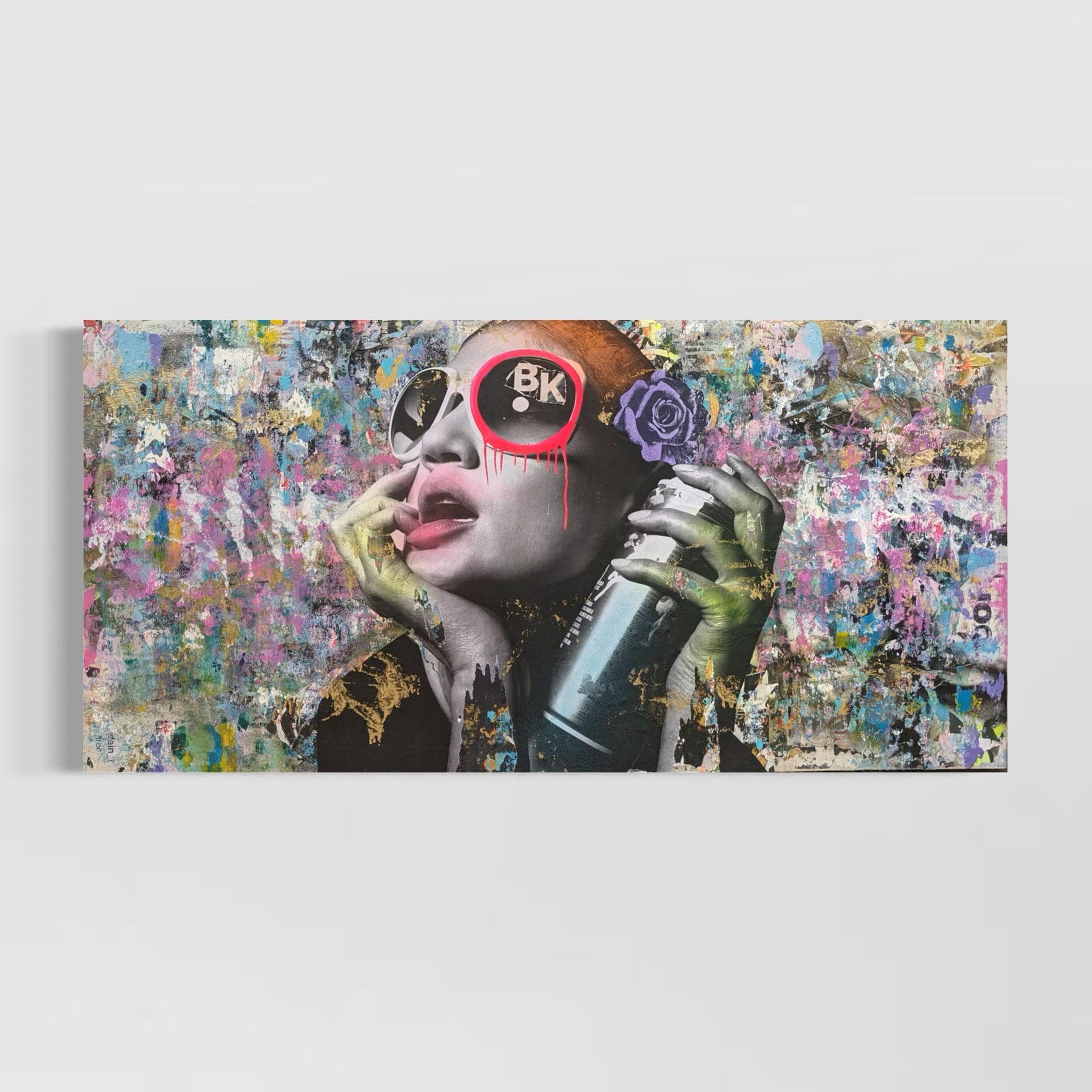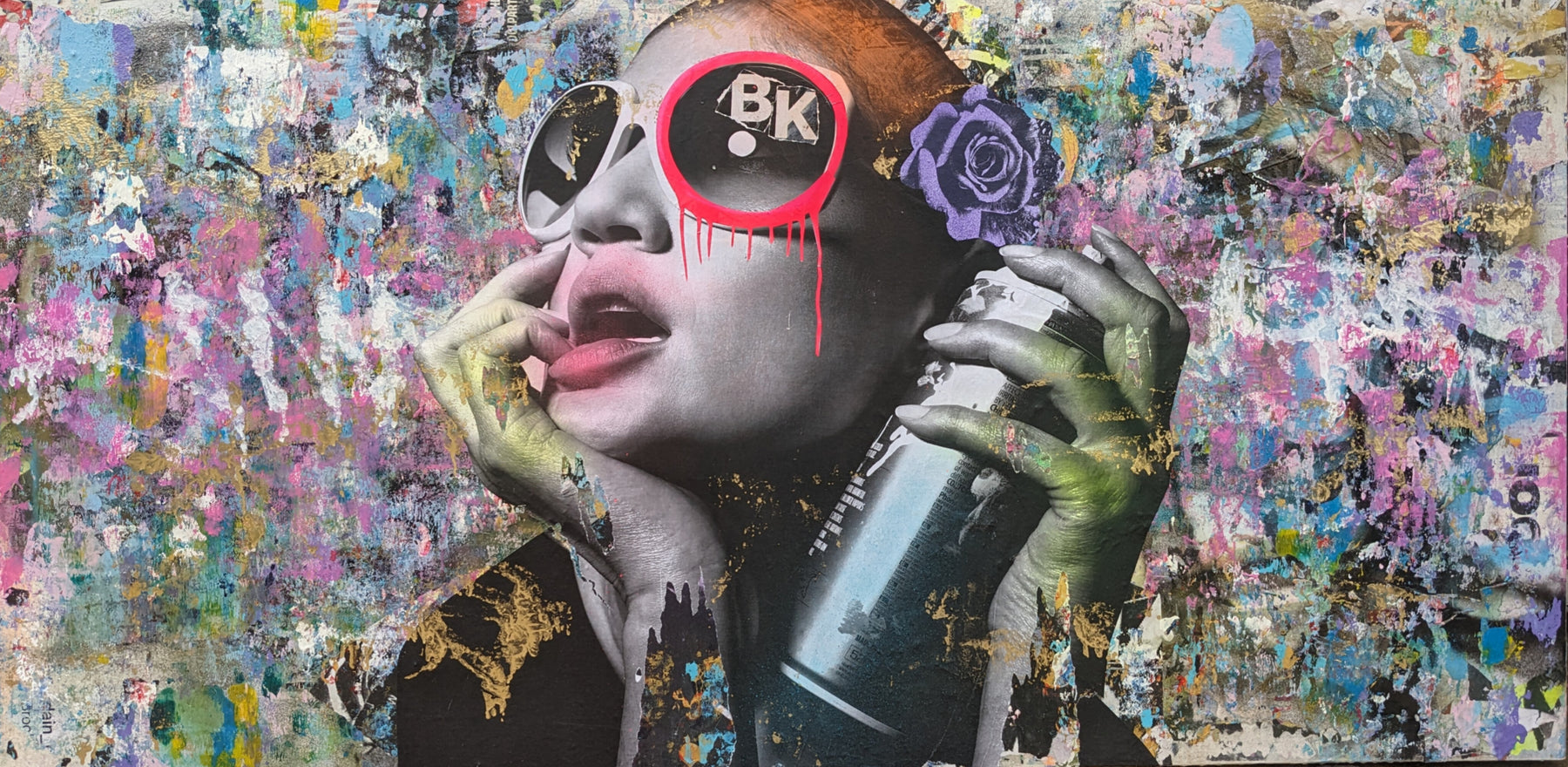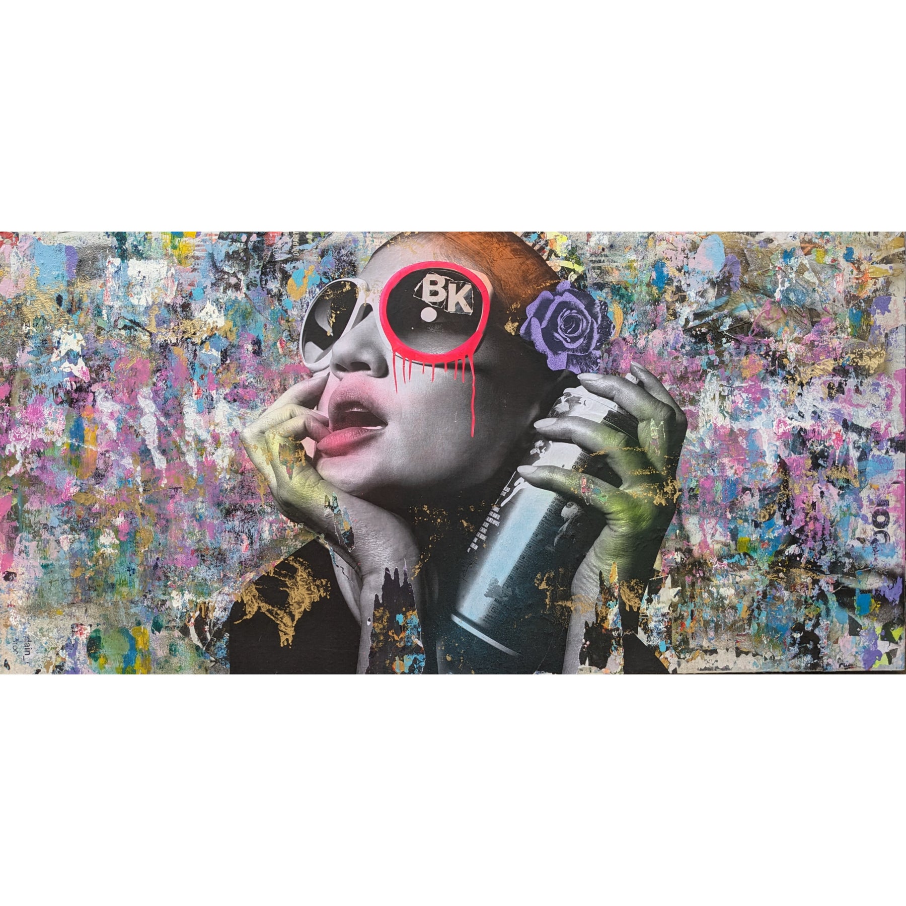 Truly distinctive among street artists today, DAIN has put in the time to cultivate his craft. Since the 1980s, this Brooklyn-born street artist has been hard at work musing city life with his street work now found throughout the boroughs. A self-taught painter, DAIN’s signature touch is the notable tagging with a ‘circle and a drip’ of just one of the eyes of his subject. When approaching a piece, DAIN first selects black and white images inspired by the mystique of bygone femininity. He then layers his primary images with additional smaller images like vintage advertisements and found paper fragments. Only at the end of his process does he pick colors to render a portrait in acrylic and spray paint.