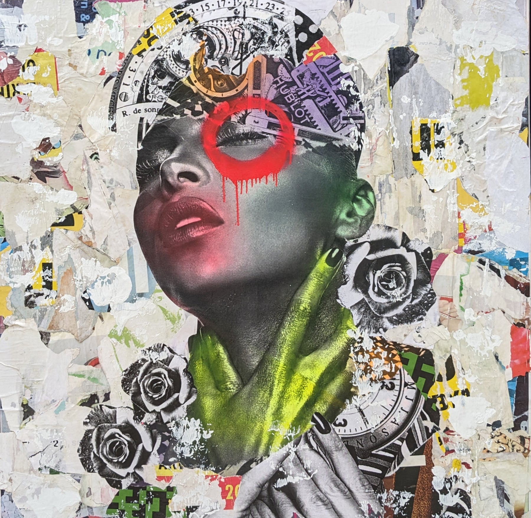 48" x 48" Acrylic paint, spray paint, wheat-paste, vintage advertisements, printed fragments on canvas. Woman's face surrounded by graphic paper cutouts with DAIN's signature circle over her right eye.