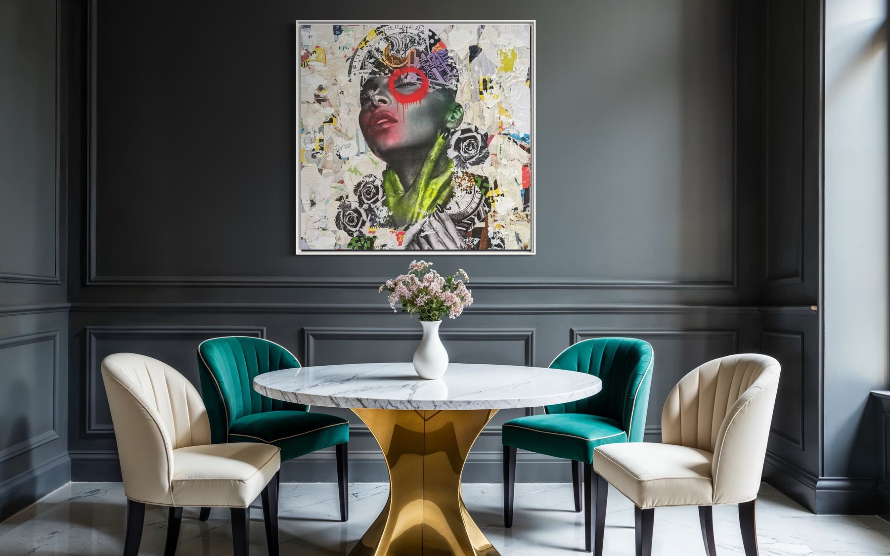 Truly distinctive among street artists today, DAIN has put in the time to cultivate his craft. Since the 1980s, this Brooklyn-born street artist has been hard at work musing city life with his street work now found throughout the boroughs. A self-taught painter, DAIN’s signature touch is the notable tagging with a ‘circle and a drip’ of just one of the eyes of his subject. When approaching a piece, DAIN first selects black and white images inspired by the mystique of bygone femininity. He then layers his primary images with additional smaller images like vintage advertisements and found paper fragments. Only at the end of his process does he pick colors to render a portrait in acrylic and spray paint.