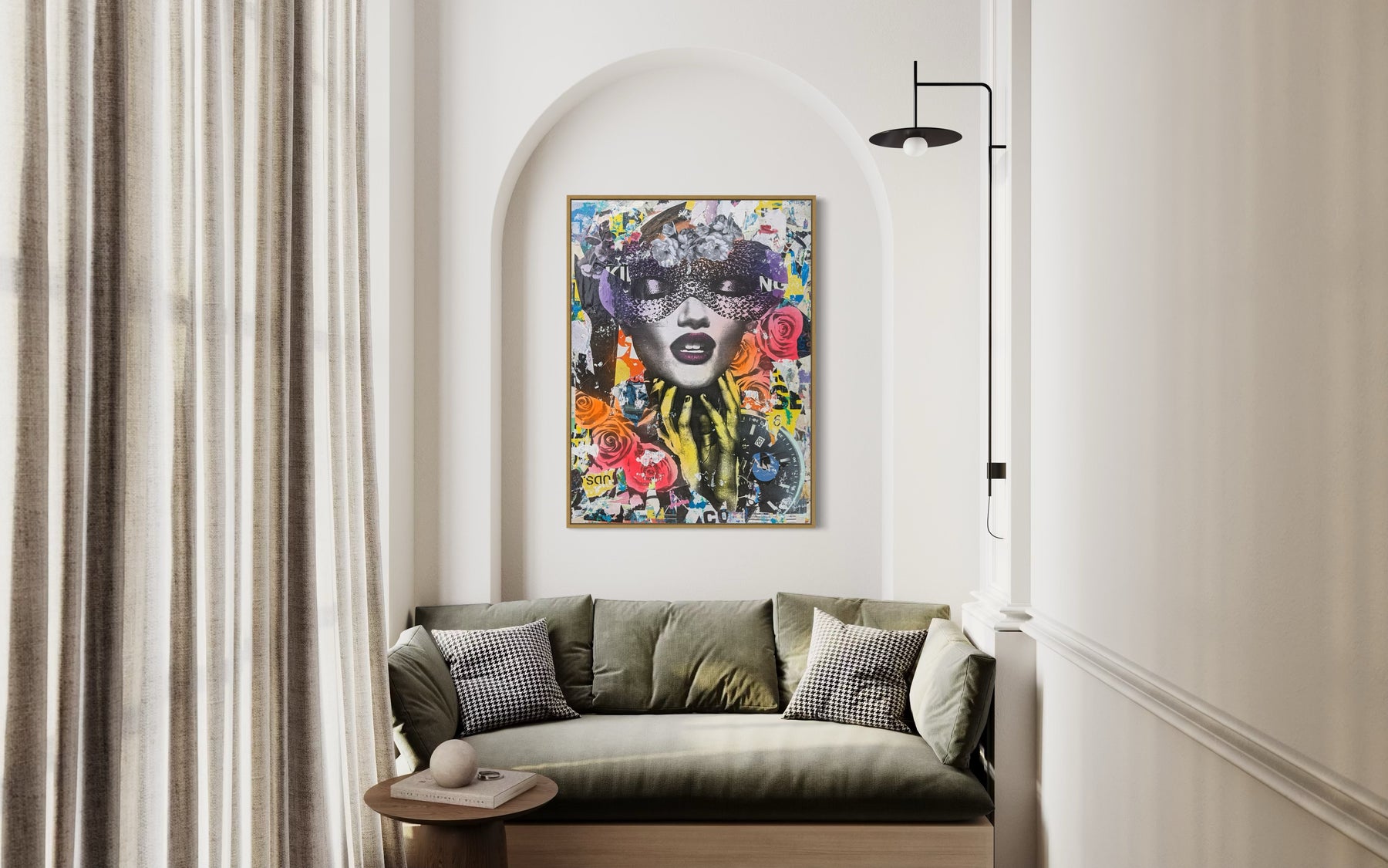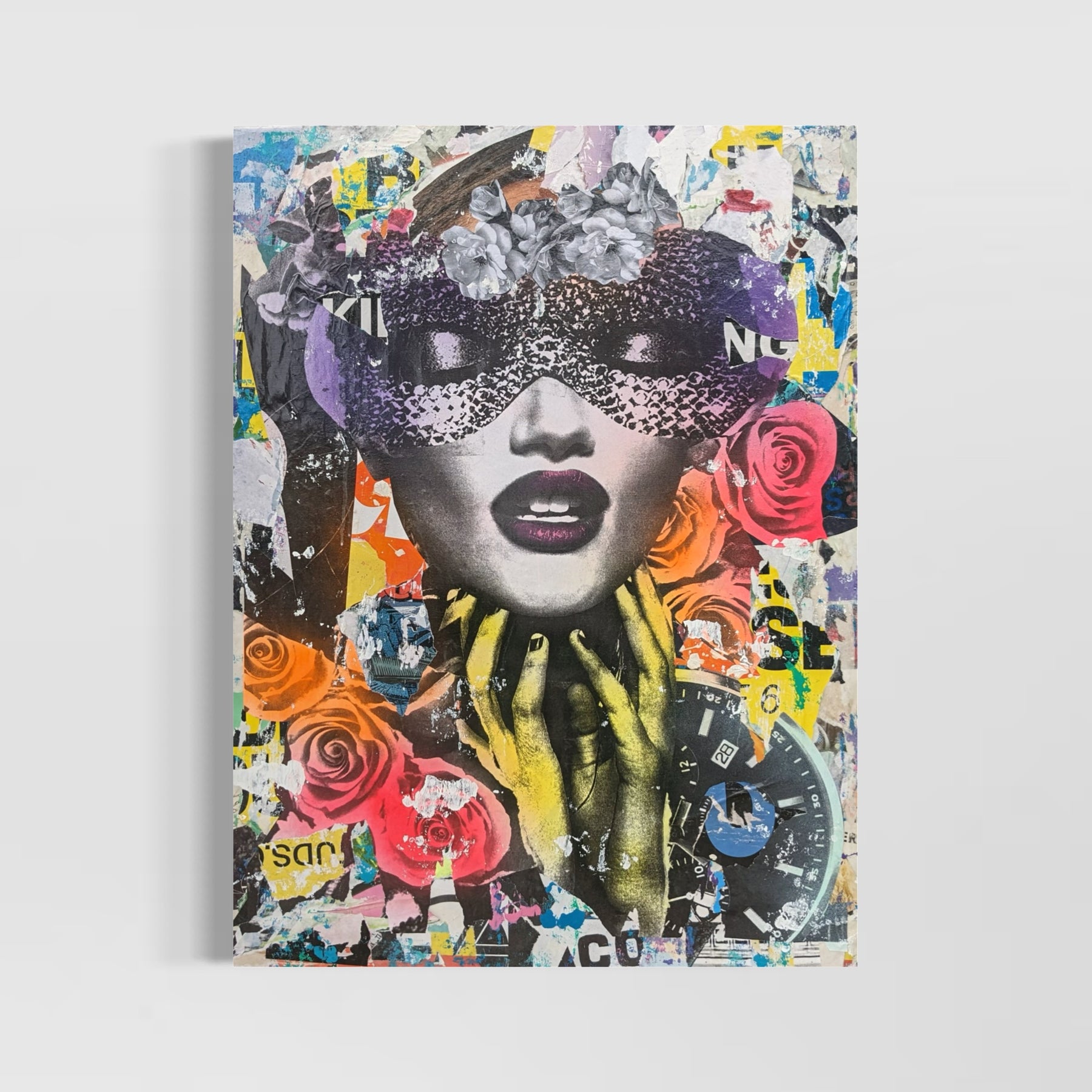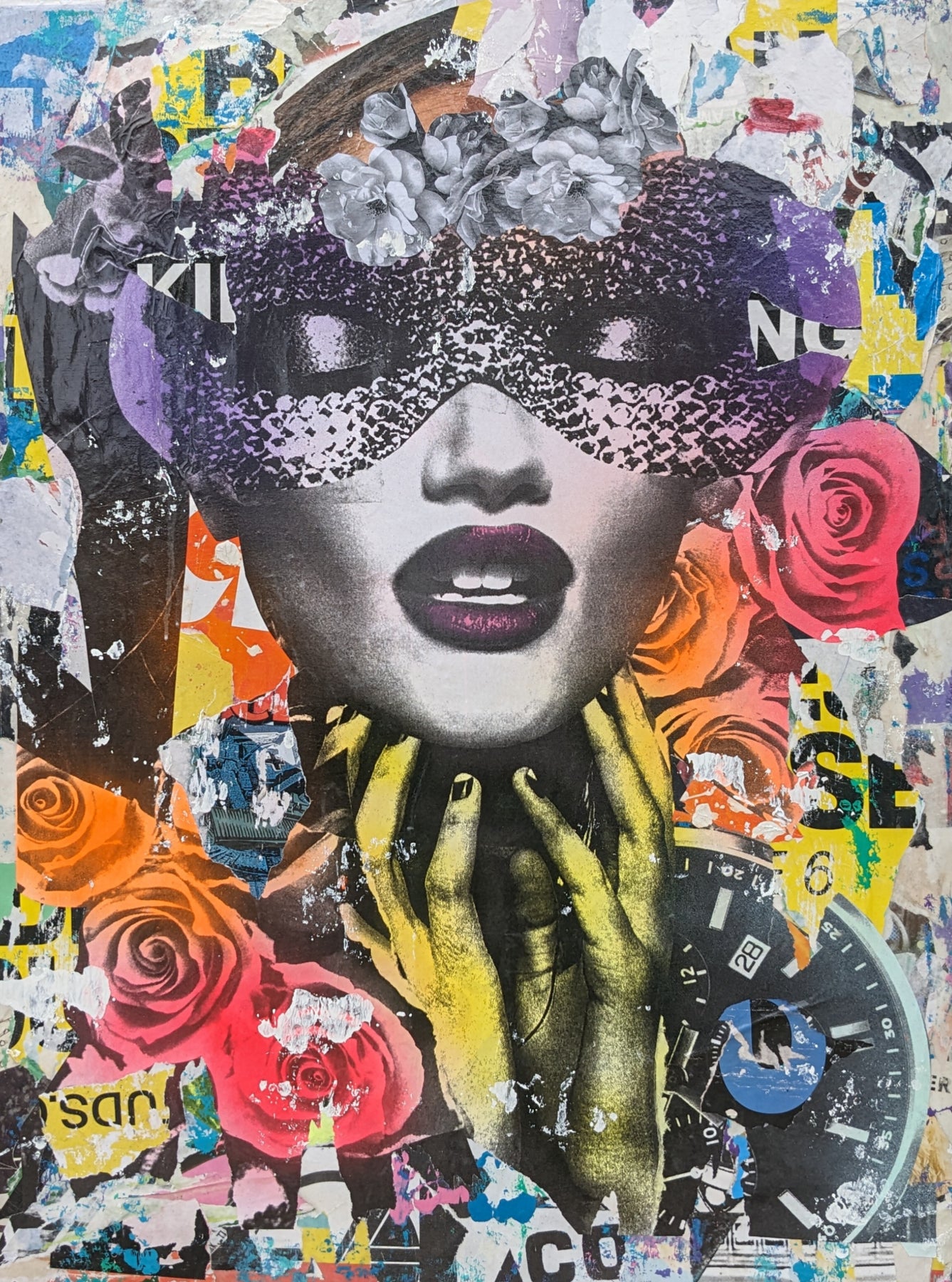 36"W x 48"H Acrylic paint, spray paint, wheat-paste, vintage advertisements, printed fragments on canvas. Woman's face with neon graphics.