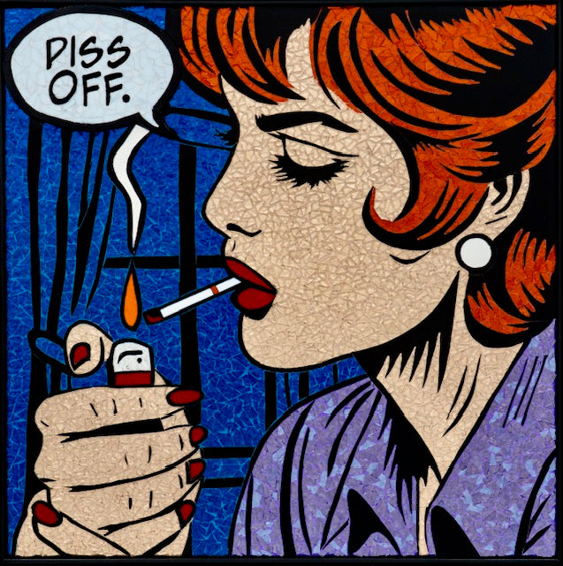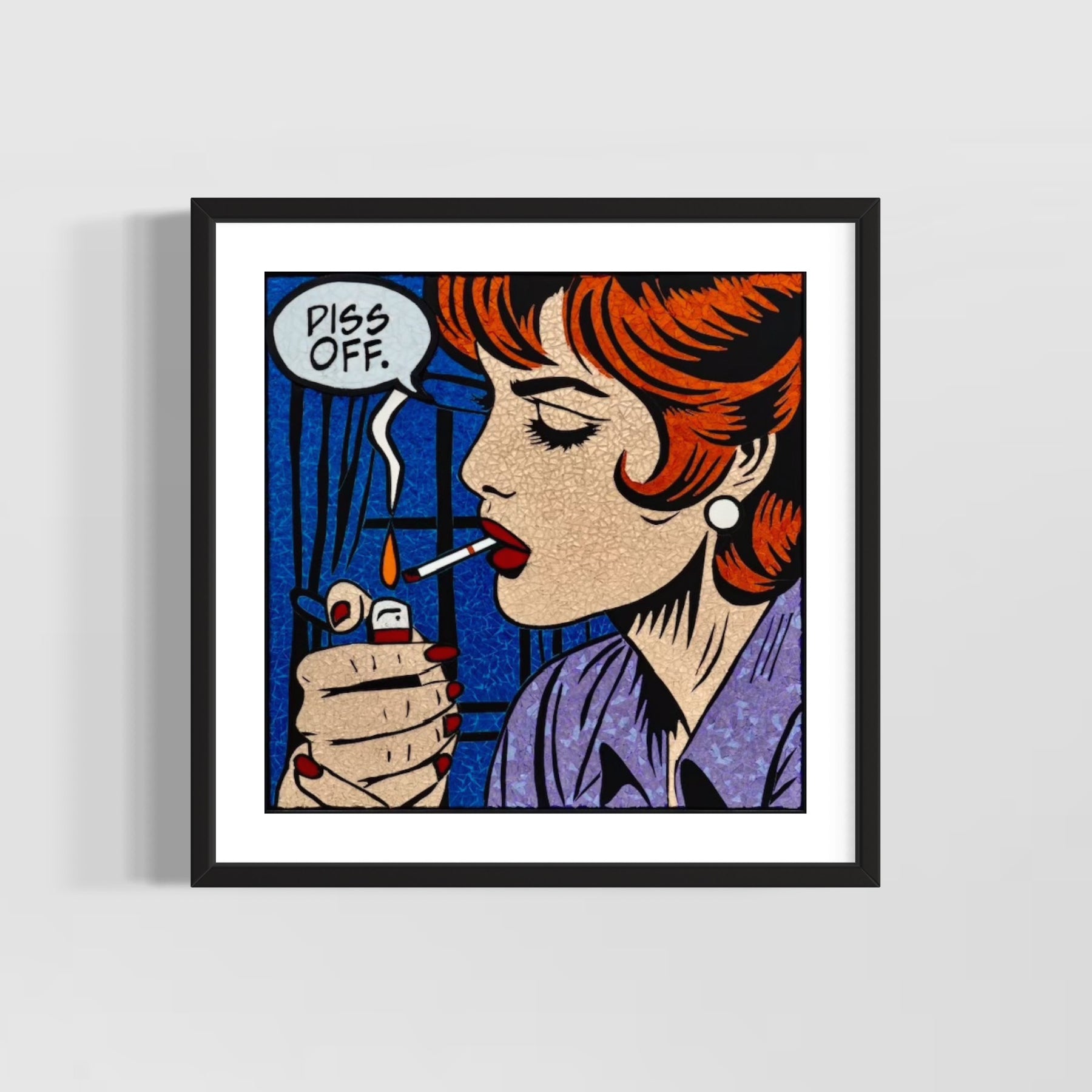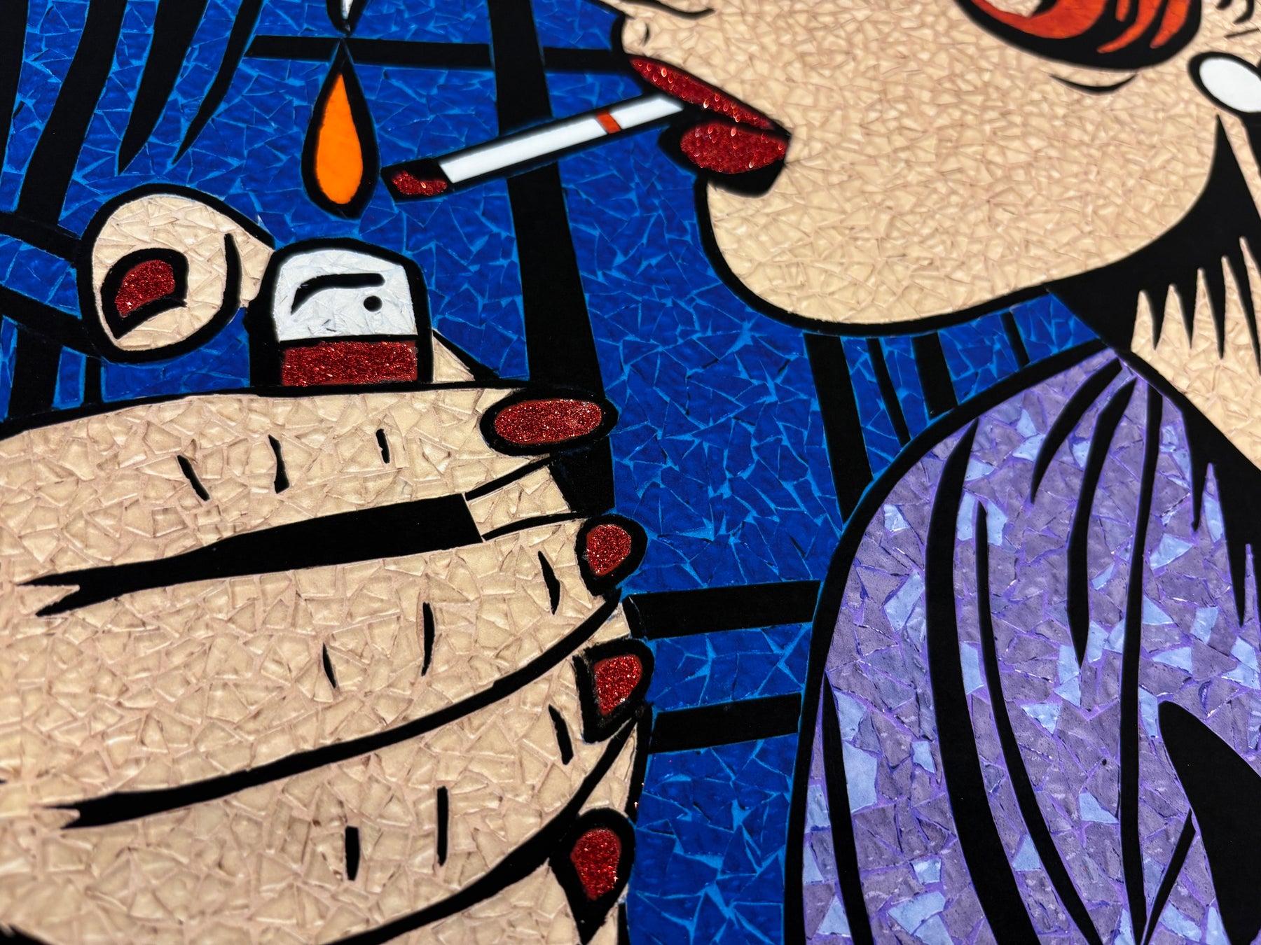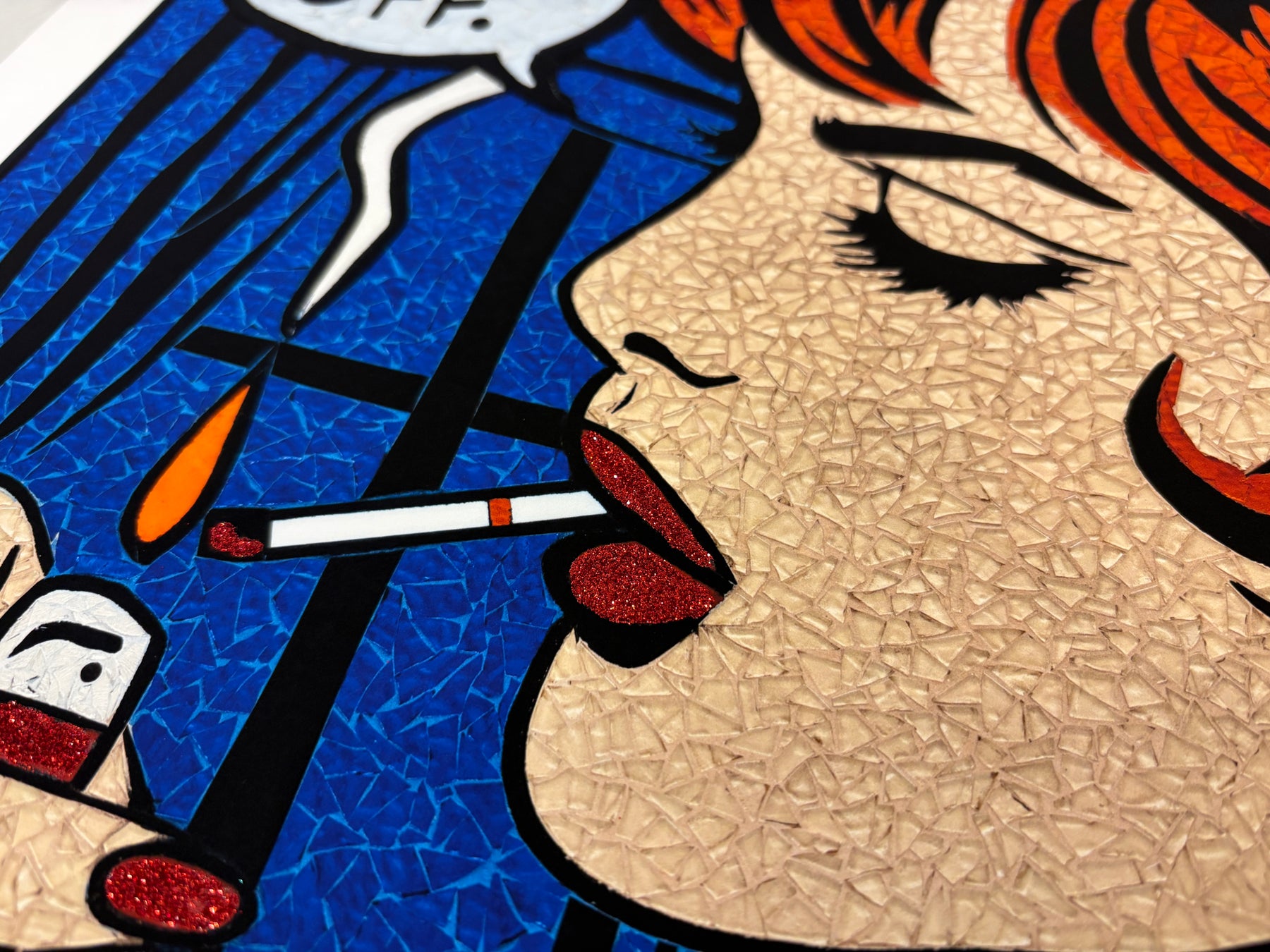 limited edition stain glass mosaic giclee print hand embellished with glitter  text bubble comic style retro vintage woman red short hair lighting cigarette with fame and glitter finger nails on blue background