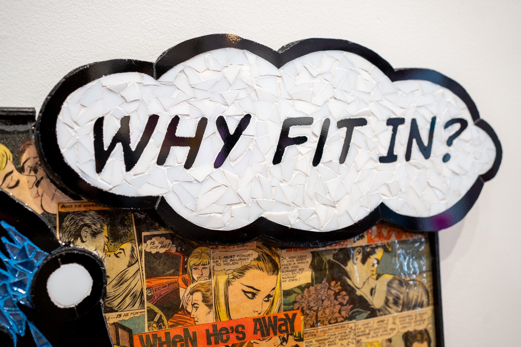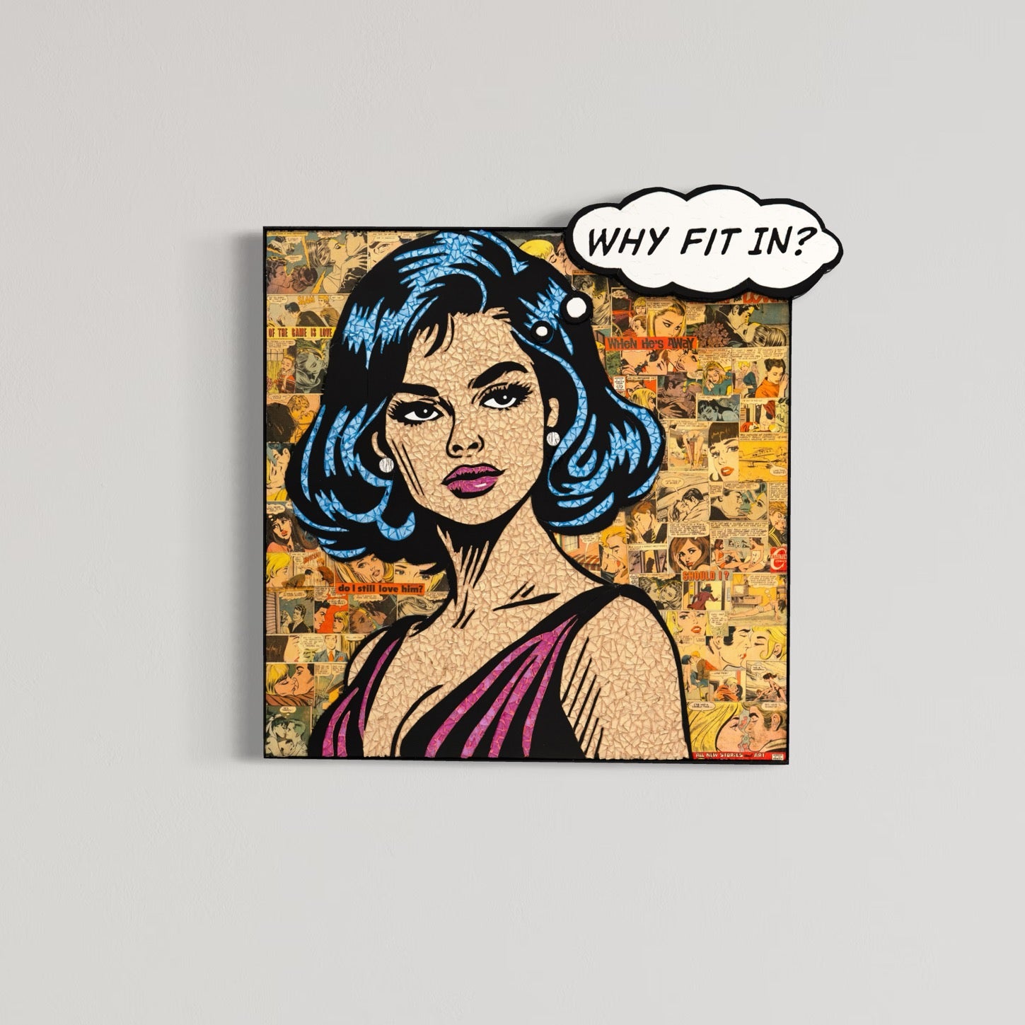Glass mosaic artwork by Sarah Flishbein of a woman in the style of 60s comic art with a thought bubble saying "why fit in?" with a collage of woman in vintage comics behind her.