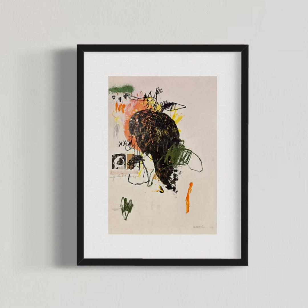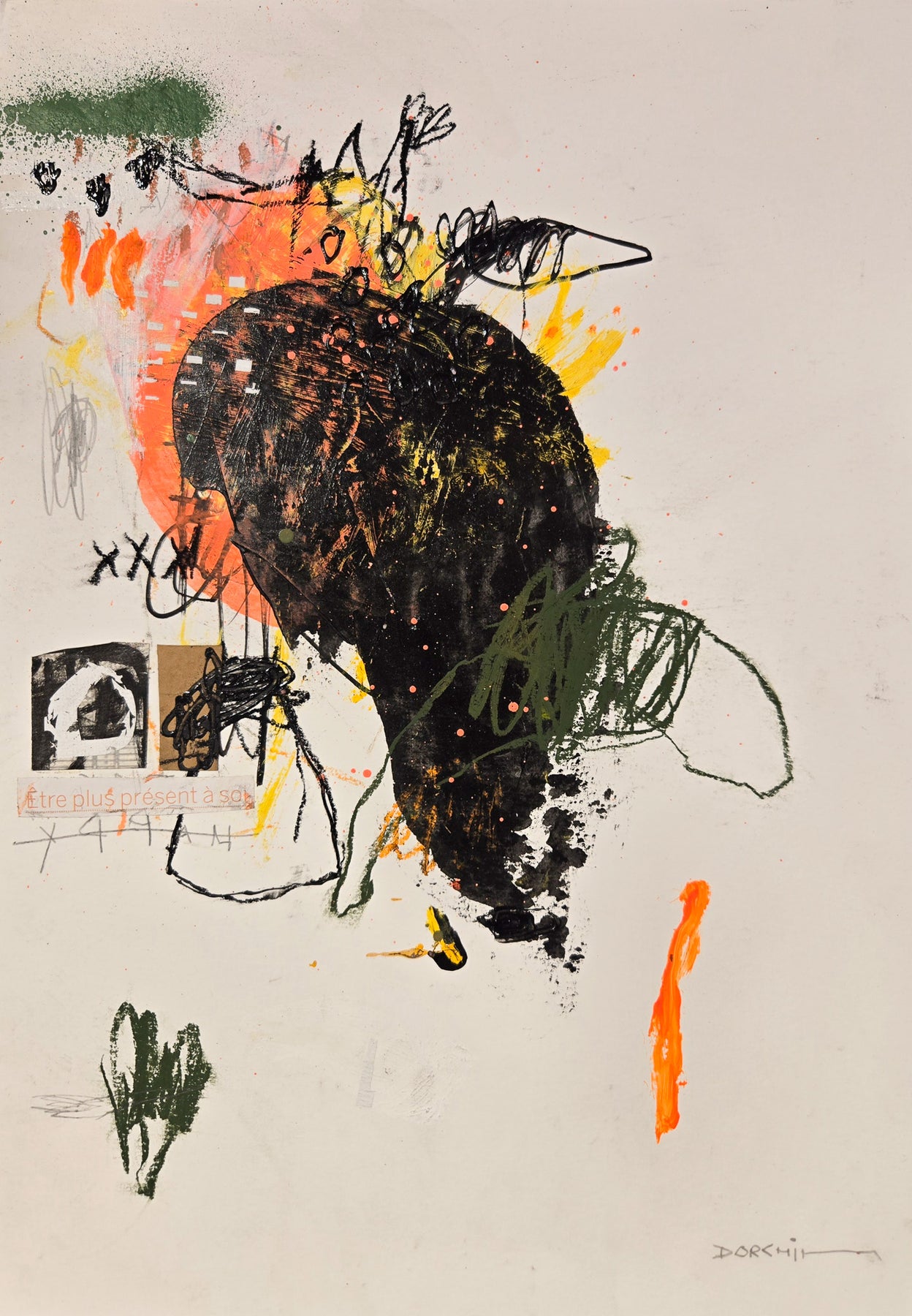 Abstract mixed media artwork on paper by Laurent Dorchin in black, pink, orange, green and white. Organic linework and minimal illustrations with collage and text elements.