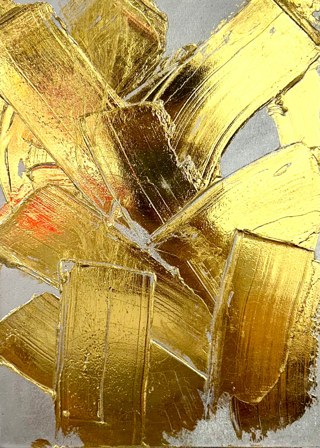 NYC based artist, M. Clark, creates light-reflecting works wherein the artist manipulates heat and pressure to fix metallic foil onto various surfaces -- there is no paint on her artworks, only gold, copper, or silver foil. Clark often uses a palette knife to help texturize her highly reflective, modern and minimalist works of art.