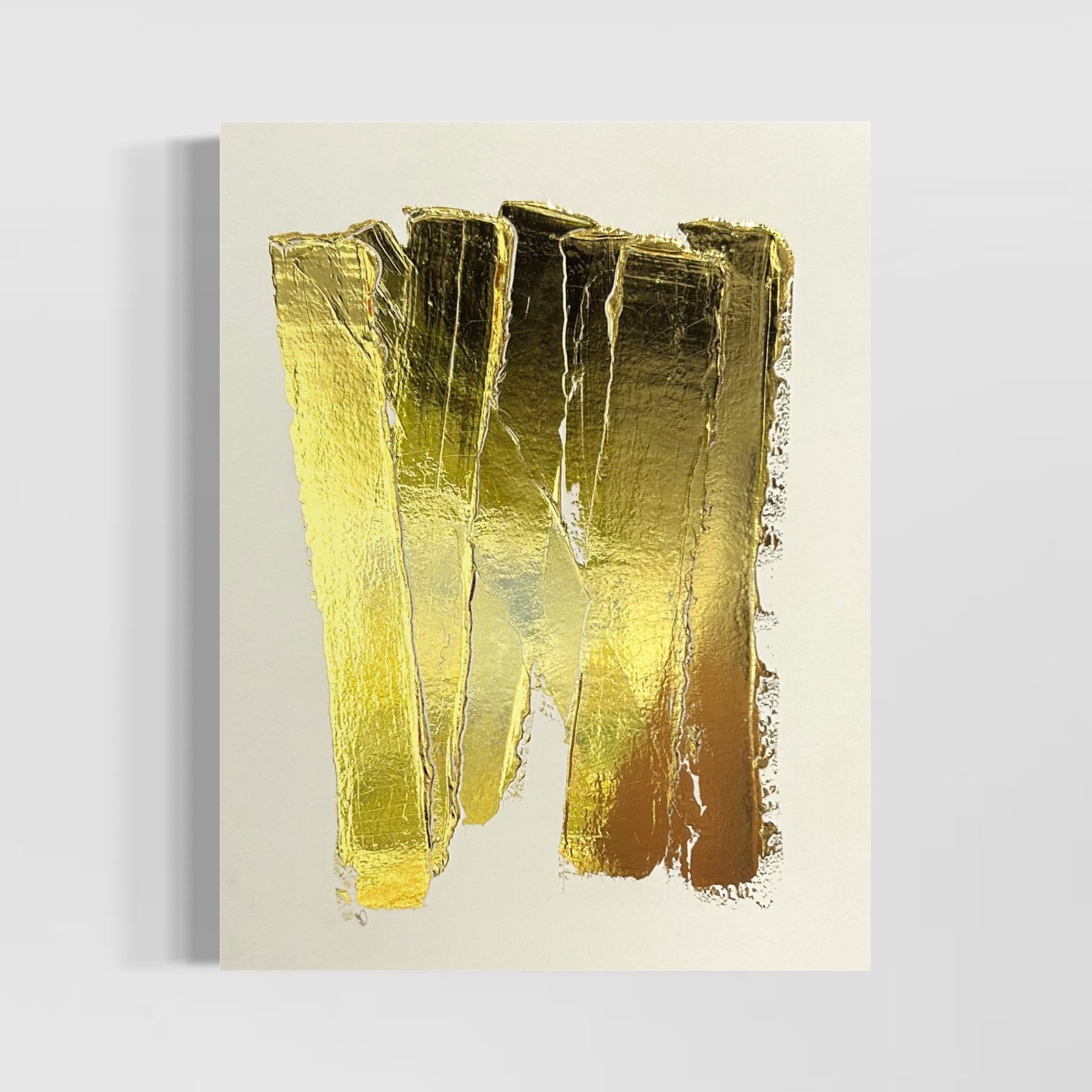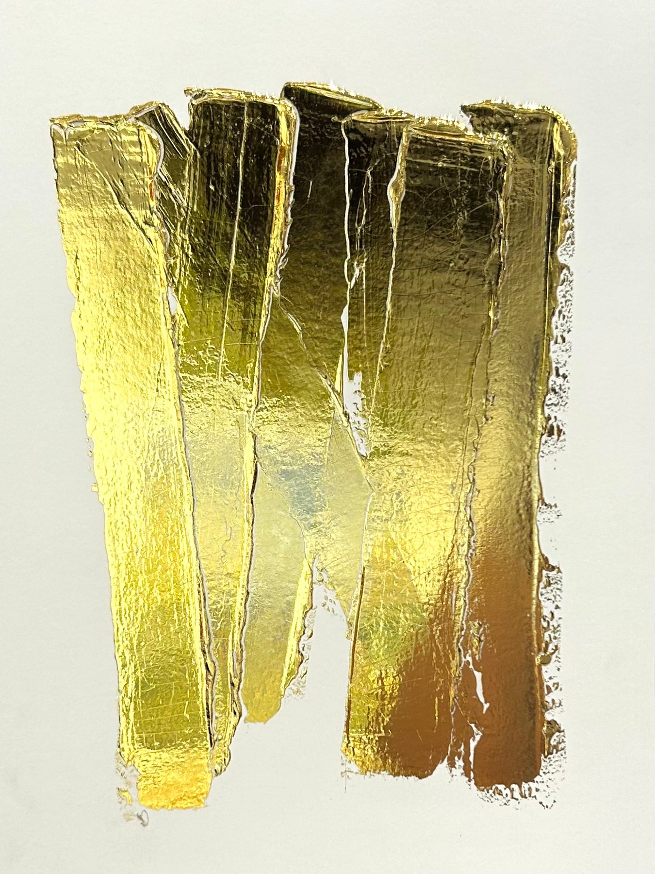 NYC based artist, M. Clark, creates light-reflecting works wherein the artist manipulates heat and pressure to fix metallic foil onto various surfaces -- there is no paint on her artworks, only gold, copper, or silver foil. Clark often uses a palette knife to help texturize her highly reflective, modern and minimalist works of art.
