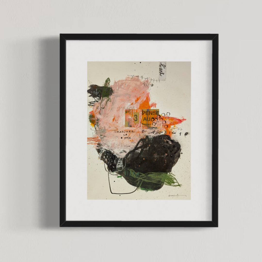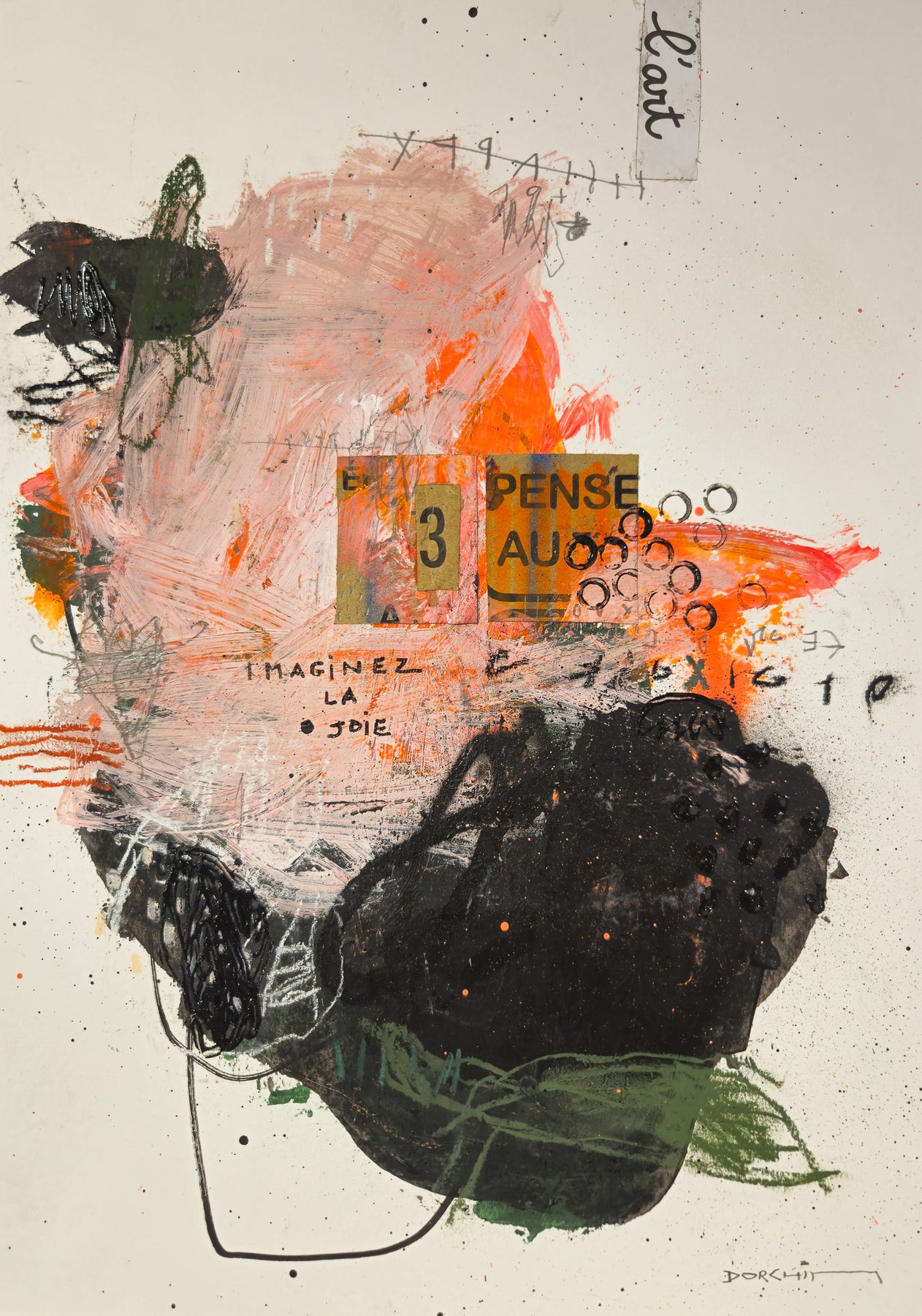 Abstract mixed media artwork on paper by Laurent Dorchin in black, pink, orange, green and white. Organic linework and minimal illustrations with collage and text elements.