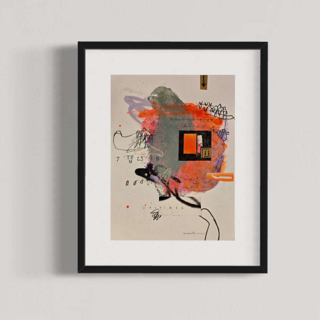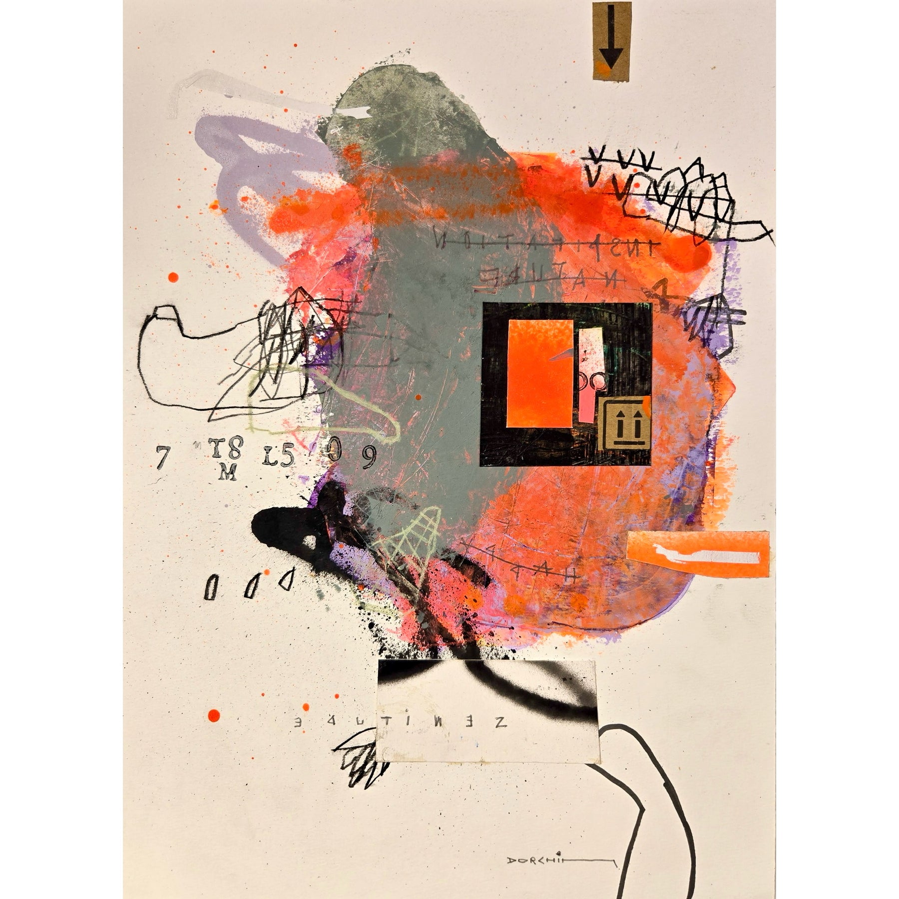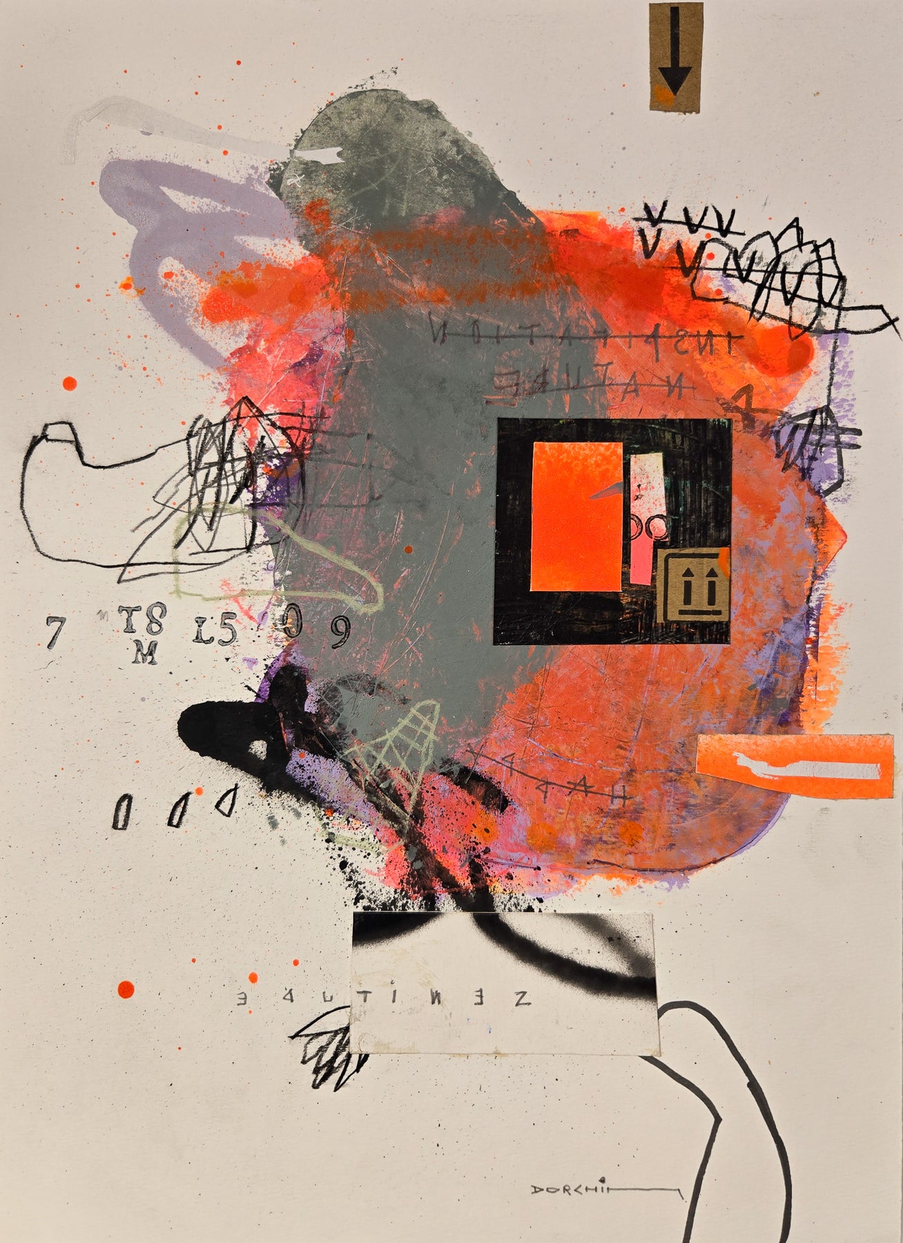 Abstract mixed media artwork on paper by Laurent Dorchin in black, pink, purple, orange, green and white. Organic linework and minimal illustrations with collage and text elements.
