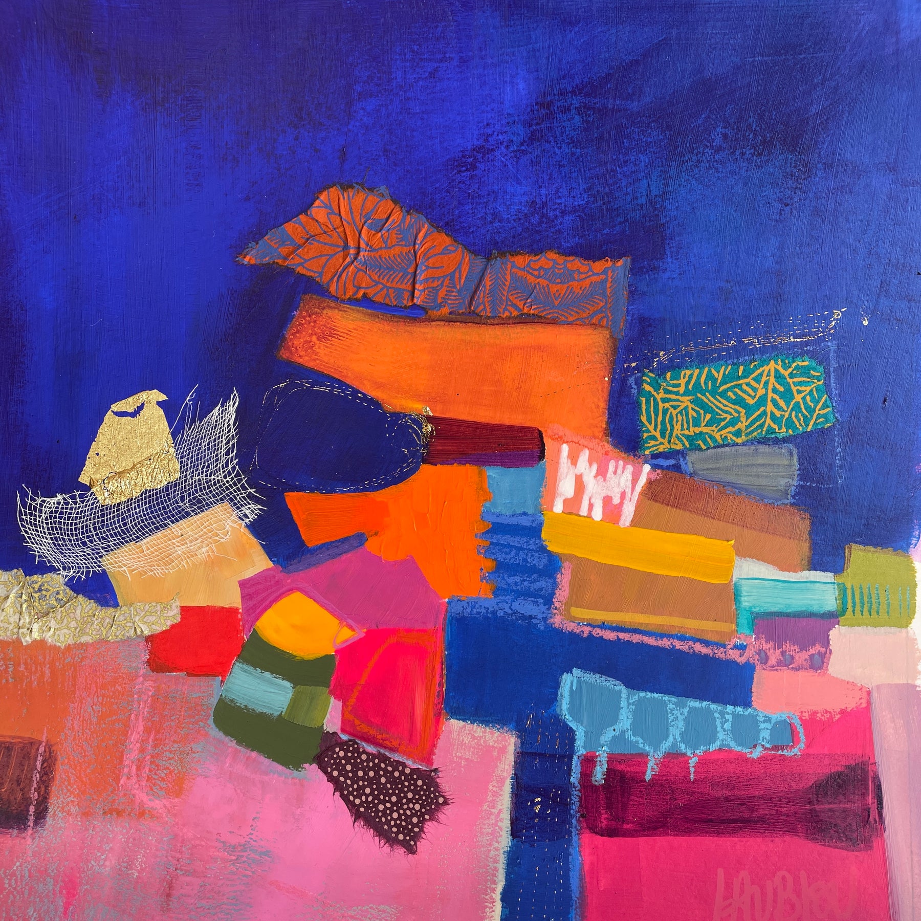 Growing up near the banks of the Loire river in France, abstract expressionist painter Lau Blou fell in love with the warm colors and softness of her natural surroundings. Her abstract paintings hint at landscapes, textured with paper and fabrics, gold and silver leaf, acrylic, and glazes. In her works, Lau Blou finds a masterful balance between chaos and negative space.