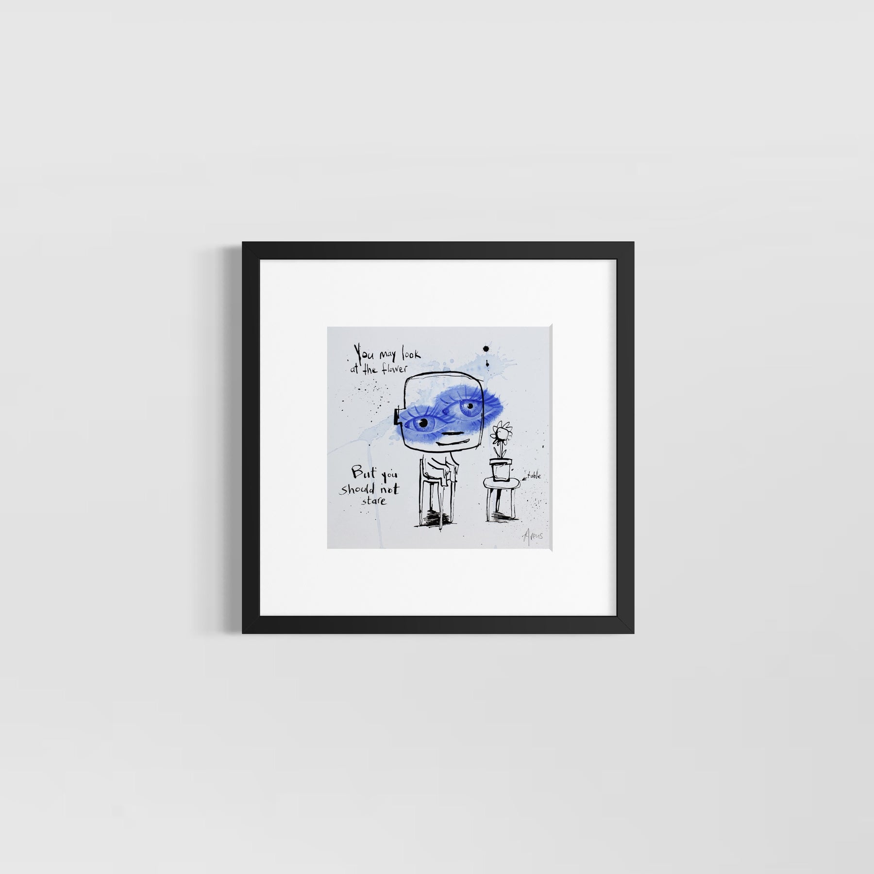 Comic doodle illustration in ink with blue eyes white background line drawing figures funny humor  flower