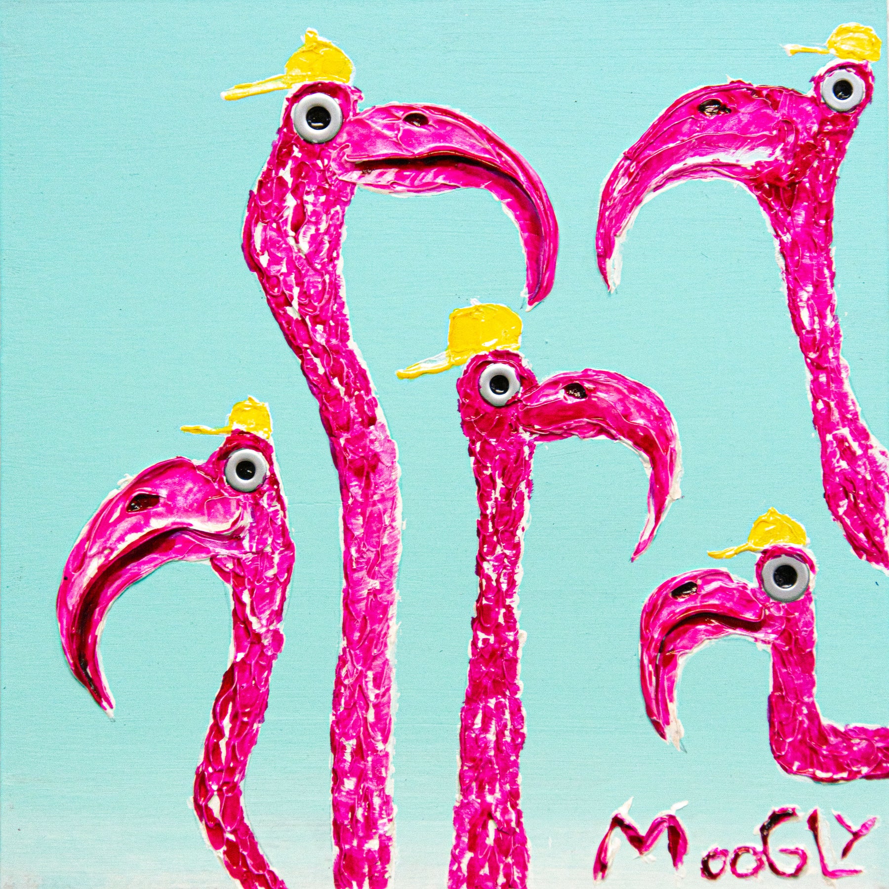 flamingos peeking into composition long pink necks with yellow hats on blue background