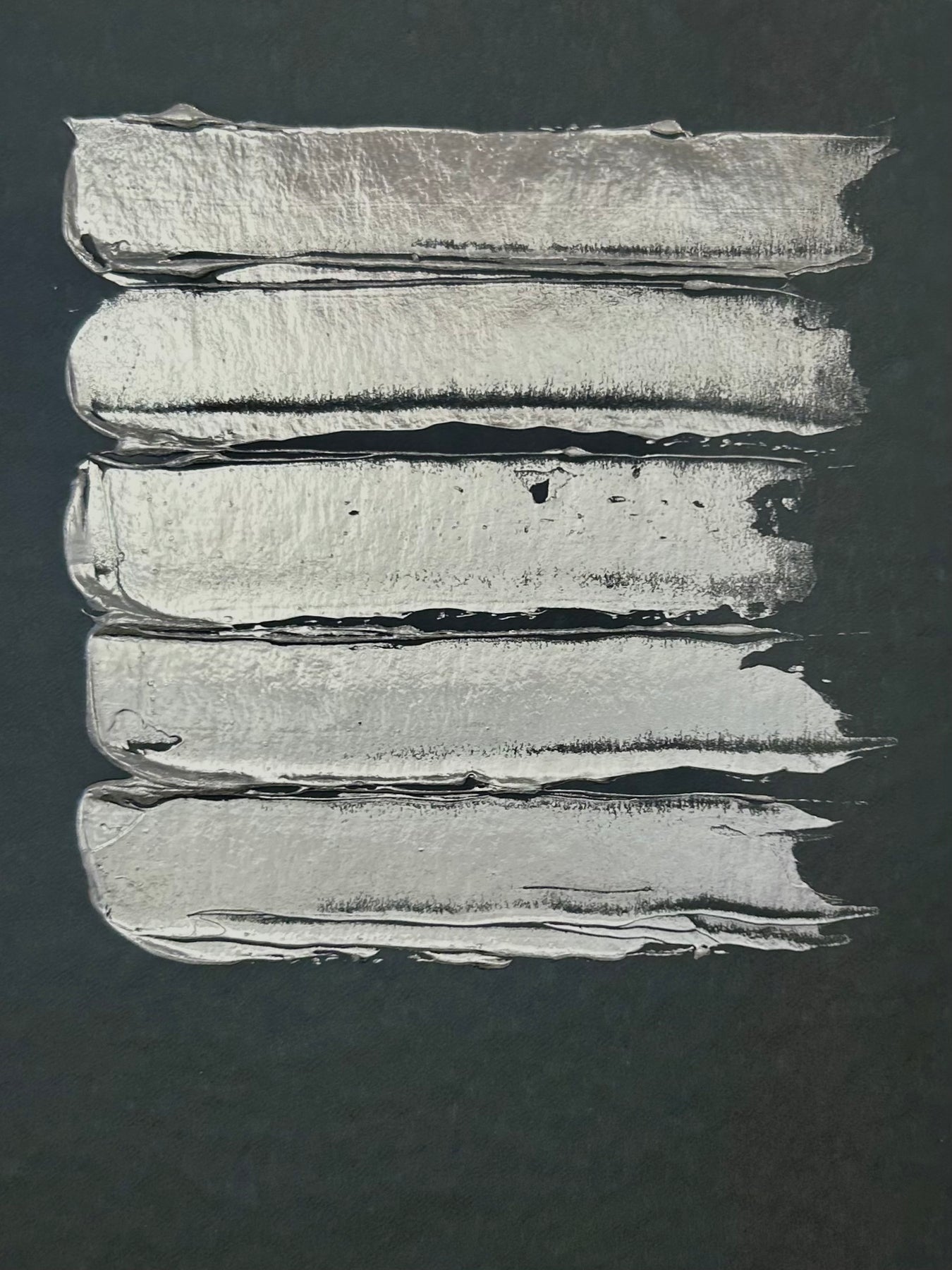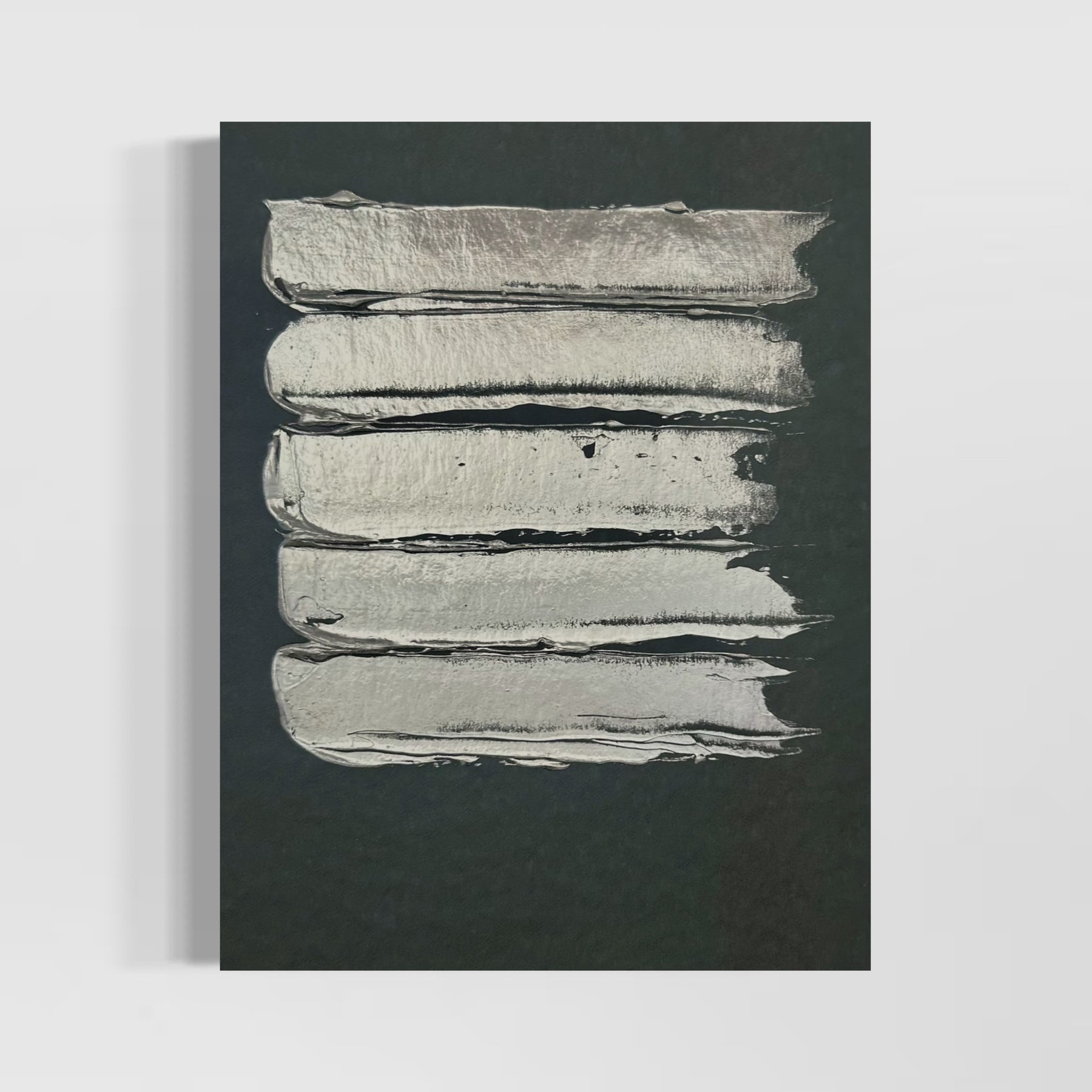 NYC based artist, M. Clark, creates light-reflecting works wherein the artist manipulates heat and pressure to fix metallic foil onto various surfaces -- there is no paint on her artworks, only gold, copper, or silver foil. Clark often uses a palette knife to help texturize her highly reflective, modern and minimalist works of art.