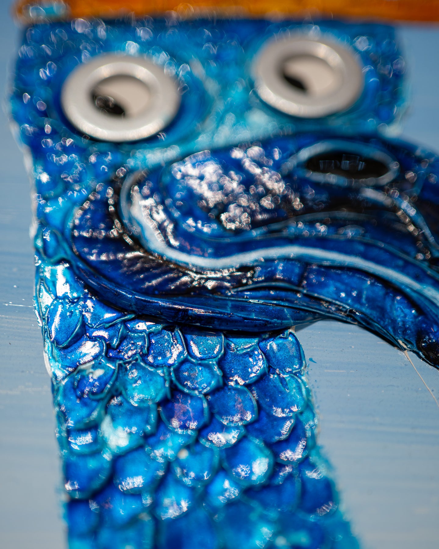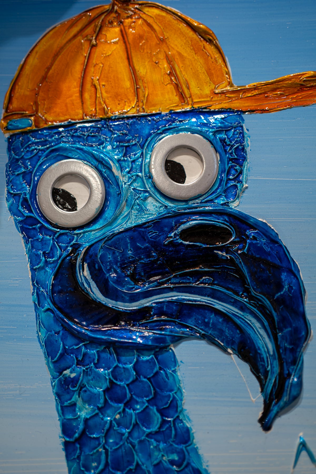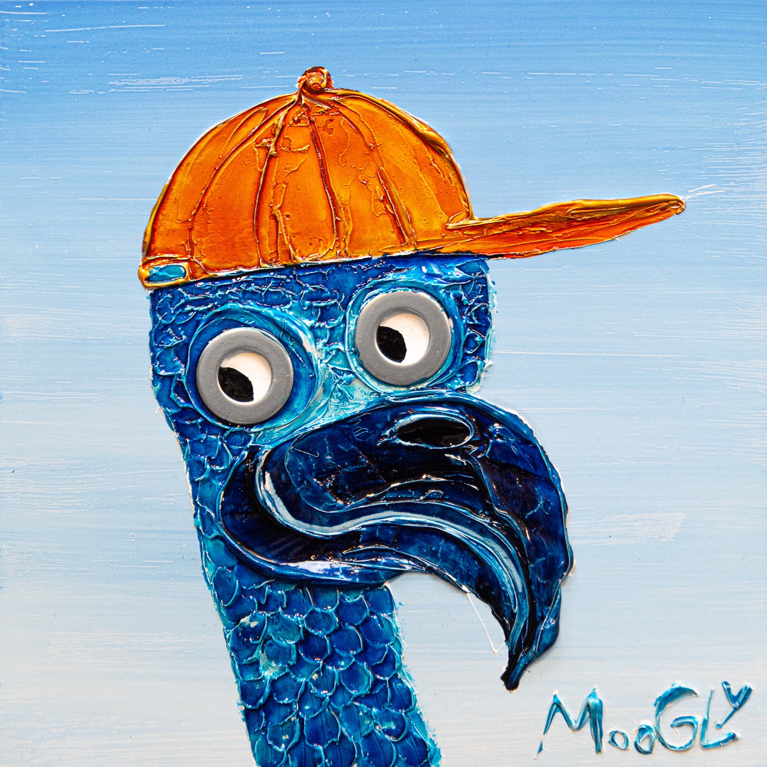 Acrylic 12" x 12" matted Sports Addict painting by Moogly. Navy and cobalt blue animated bird with washers as eyes, wearing an orange sideways baseball cap and looking to the left.