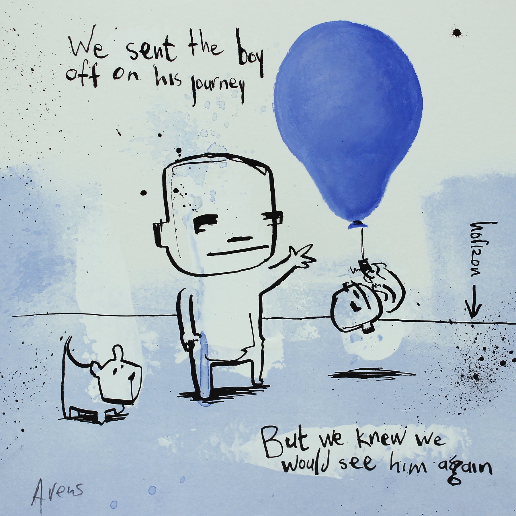 Comic doodle illustration in ink with blue eyes white background line drawing figures funny humor balloons dog