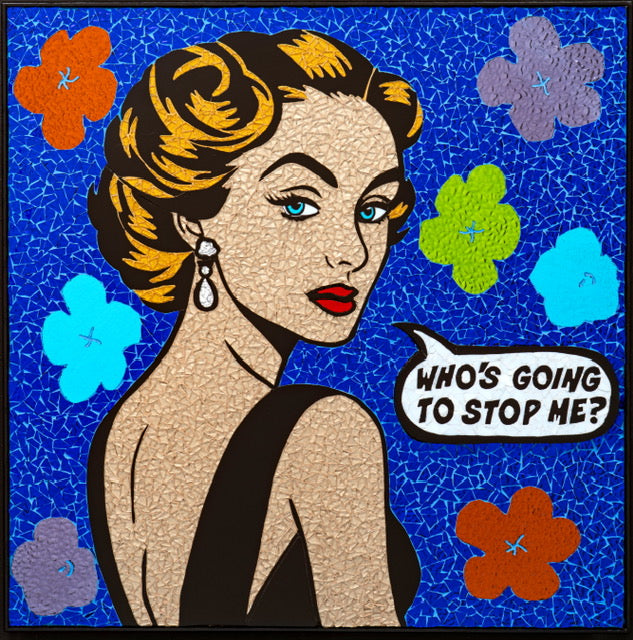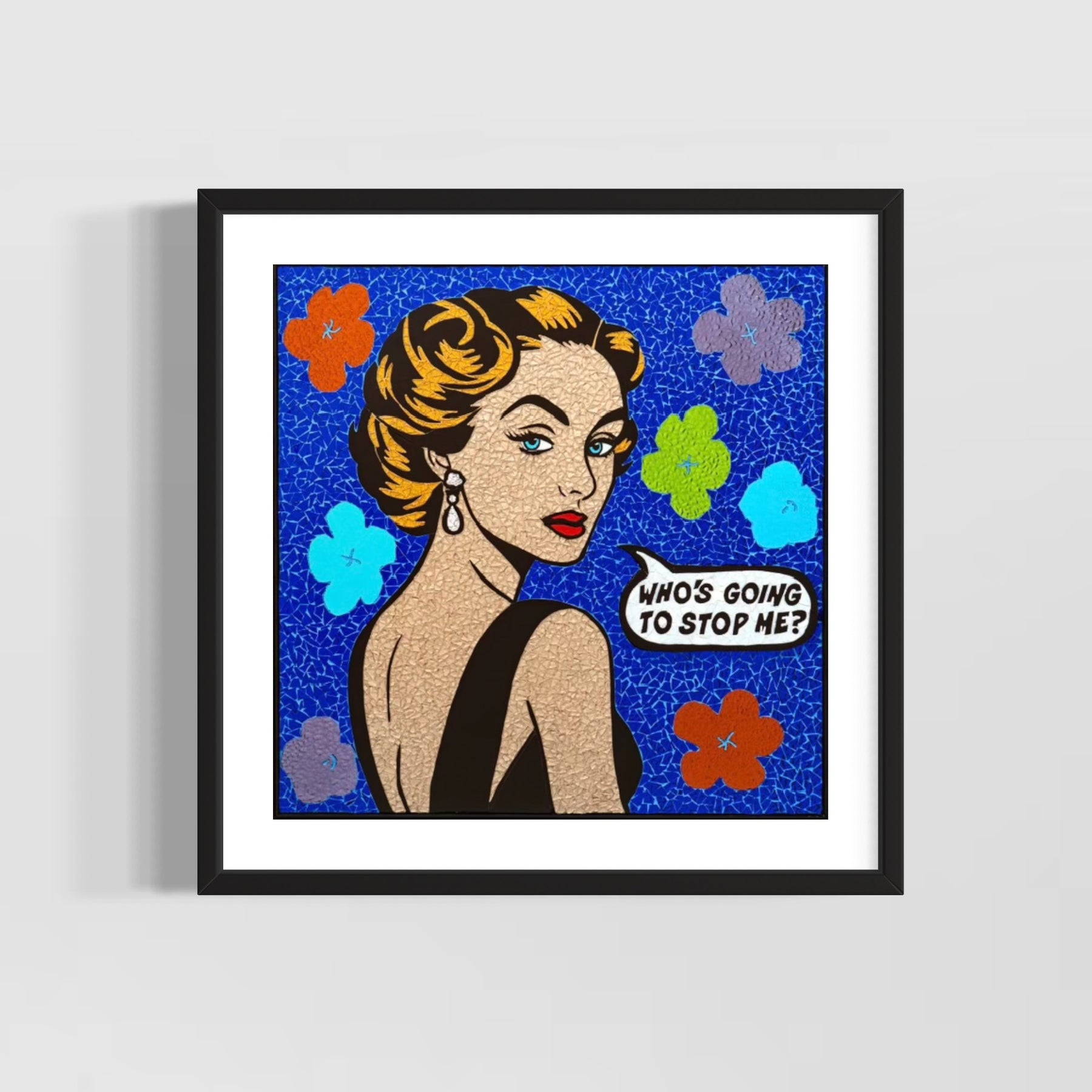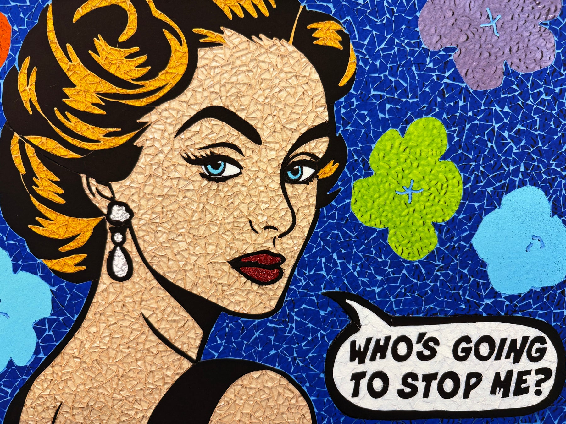 limited edition stain glass mosaic giclee print hand embellished with glitter blonde woman with blue eyes and red lips looking back on blue tile floral background text bubble comic style retro vintage